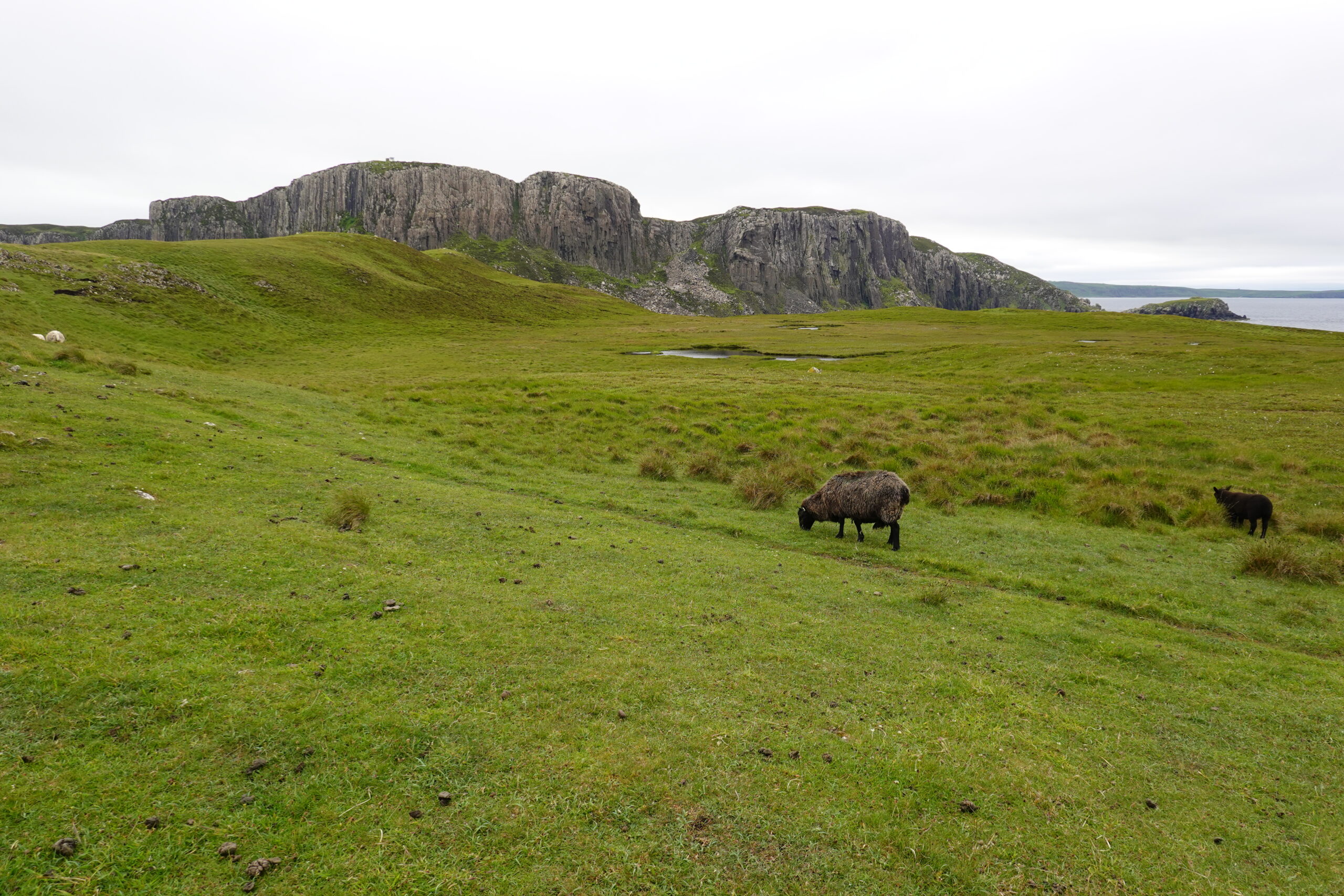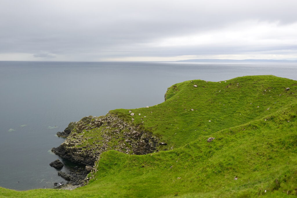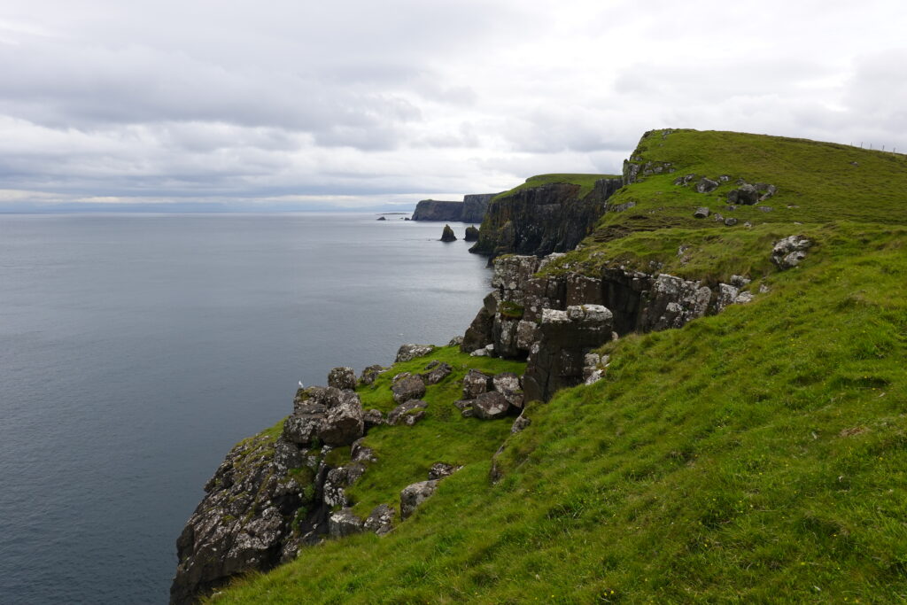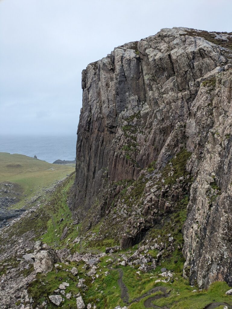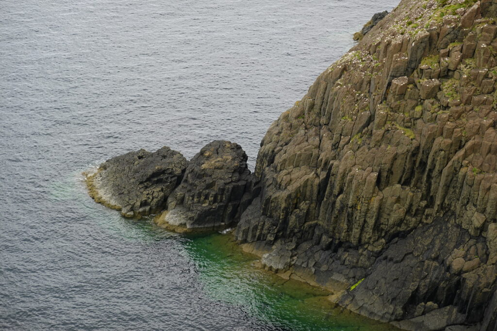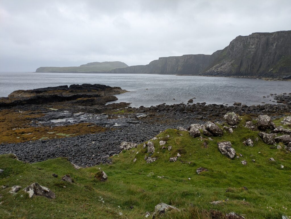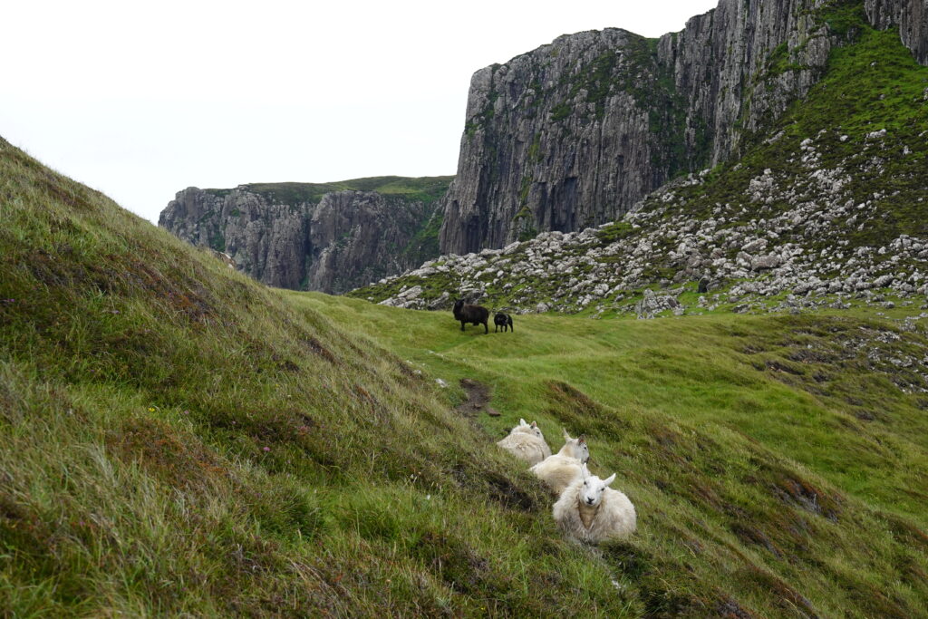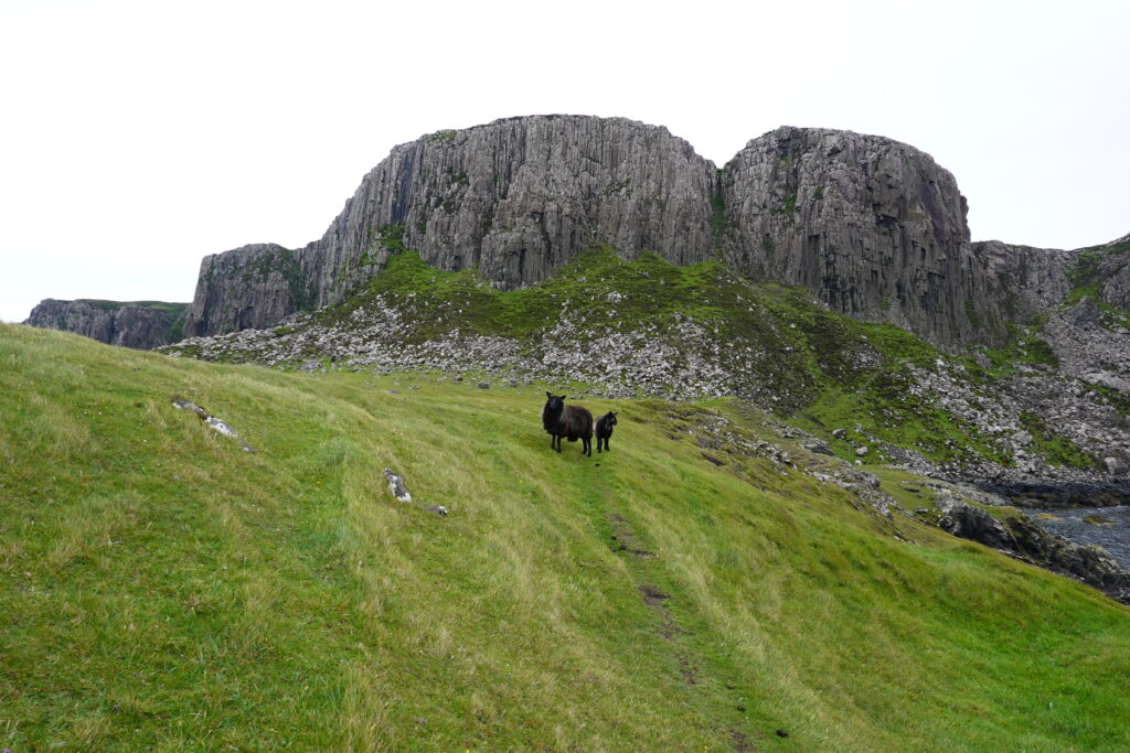 Depuis le haut de falaises aux belles colonnes de basalte, on emprunte un sentier bien raide pour descendre sur Rubha Hunish, le “headland” qui marque le point le plus septentrional de Skye (Rubha = headland). On s’émerveille devant un faucon pèlerin (et la prouesse de moutons présents en contrebas, qui sont visiblement plus agiles que nous) et le paysage, c’est grandiose même sous la pluie. Un passage scabreux nécessite un peu de scrambling sur les roches mouillées: je ne suis pas fan et je passe mon sac à José pour ce mini bout.