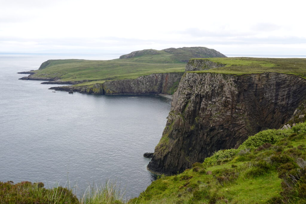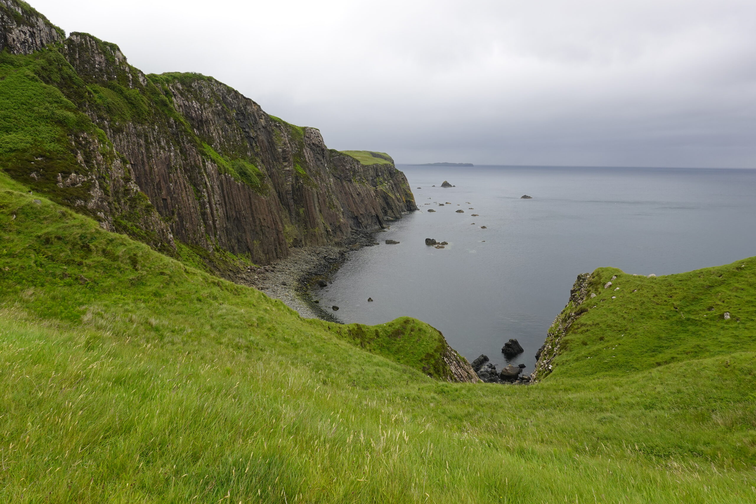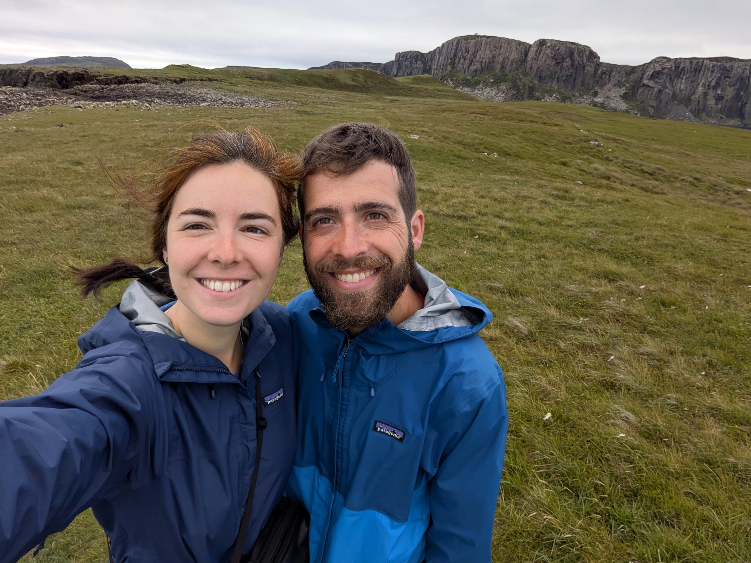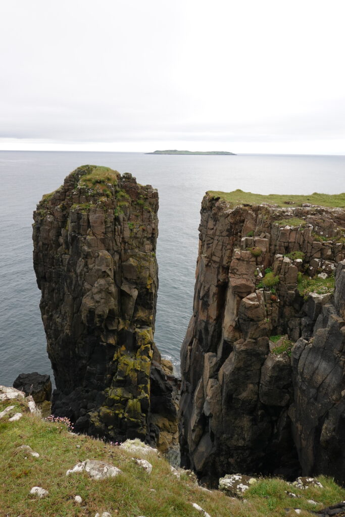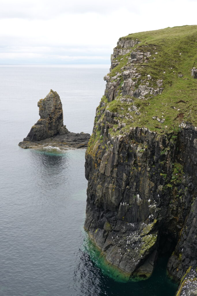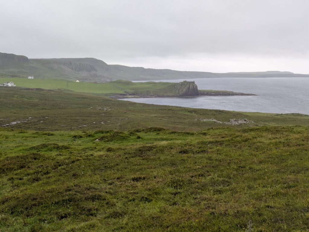 Depuis le haut de falaises aux belles colonnes de basalte, on emprunte un sentier bien raide pour descendre sur Rubha Hunish, le “headland” qui marque le point le plus septentrional de Skye (Rubha = headland). On s’émerveille devant un faucon pèlerin (et la prouesse de moutons présents en contrebas, qui sont visiblement plus agiles que nous) et le paysage, c’est grandiose même sous la pluie. Un passage scabreux nécessite un peu de scrambling sur les roches mouillées: je ne suis pas fan et je passe mon sac à José pour ce mini bout.