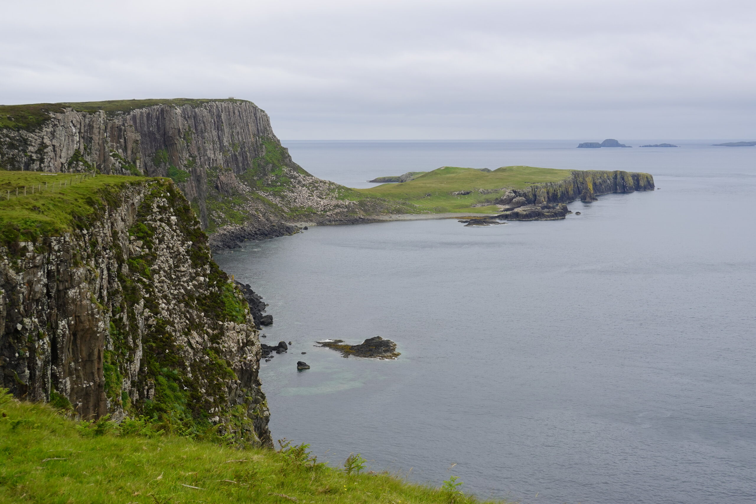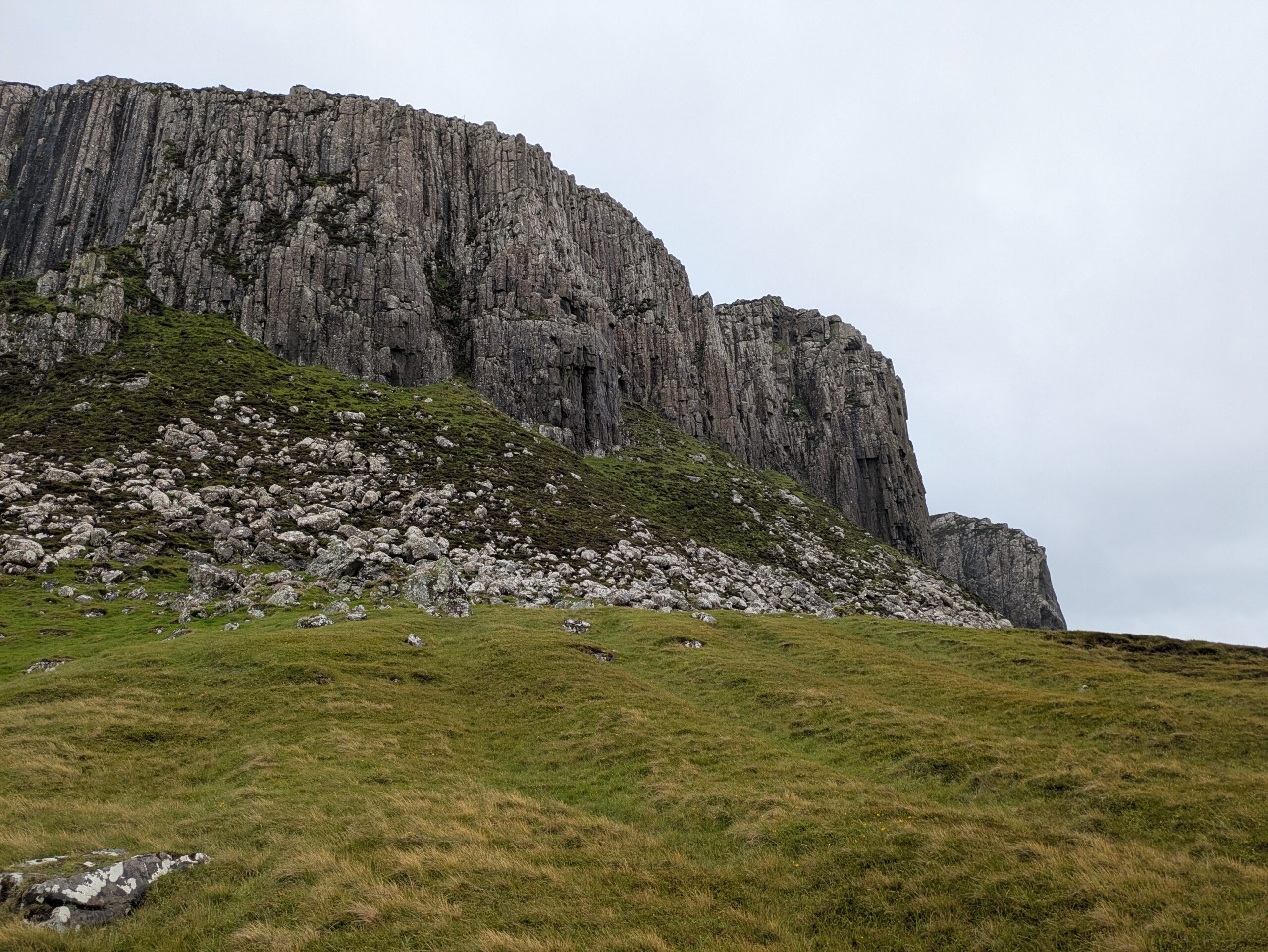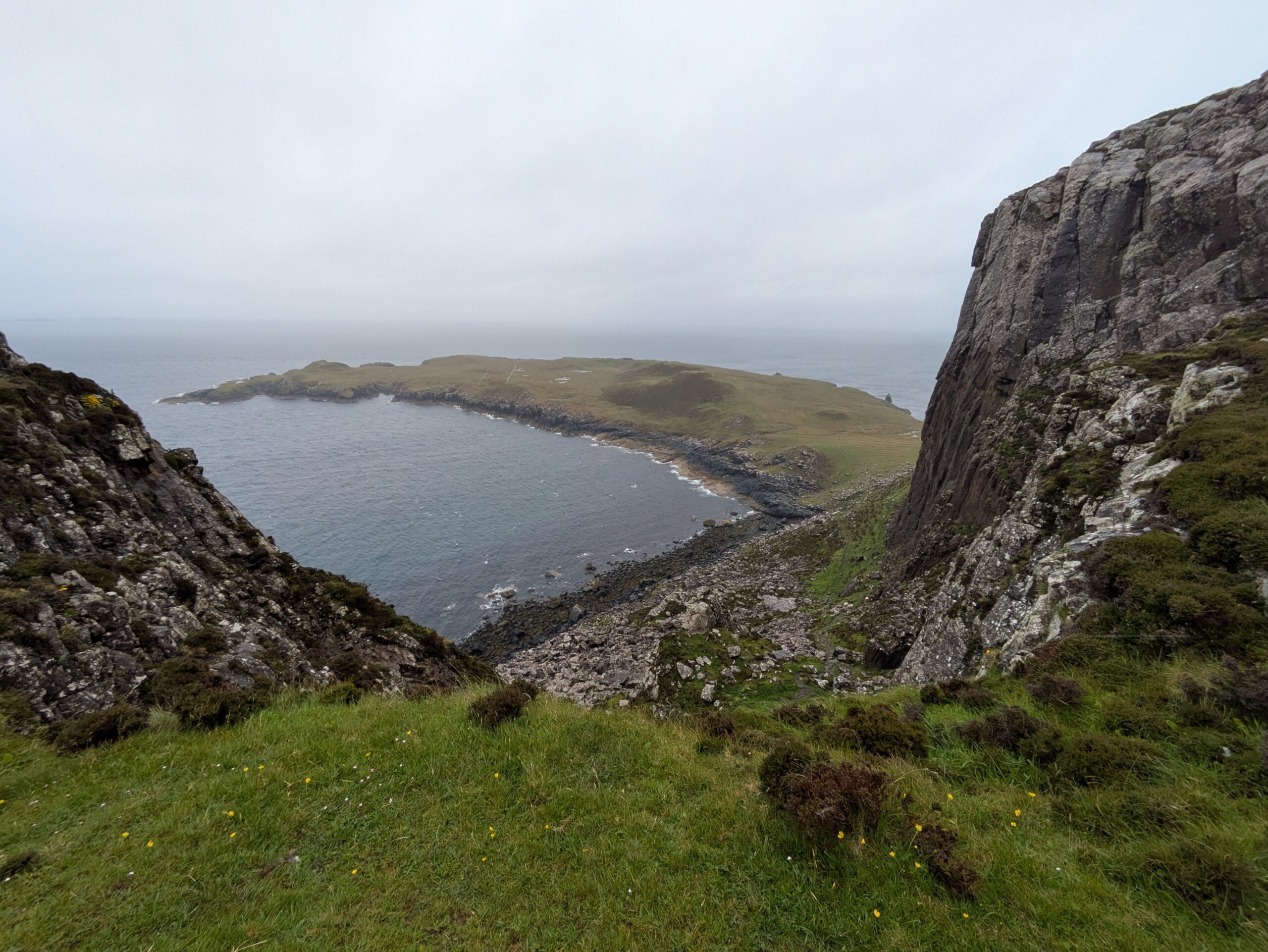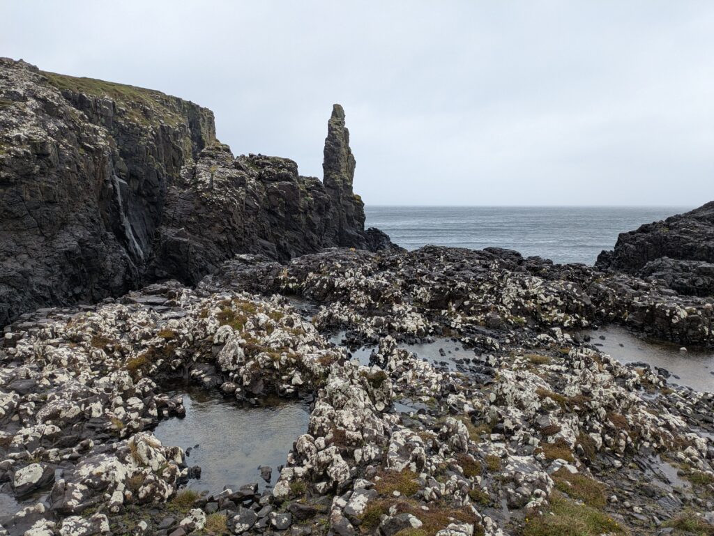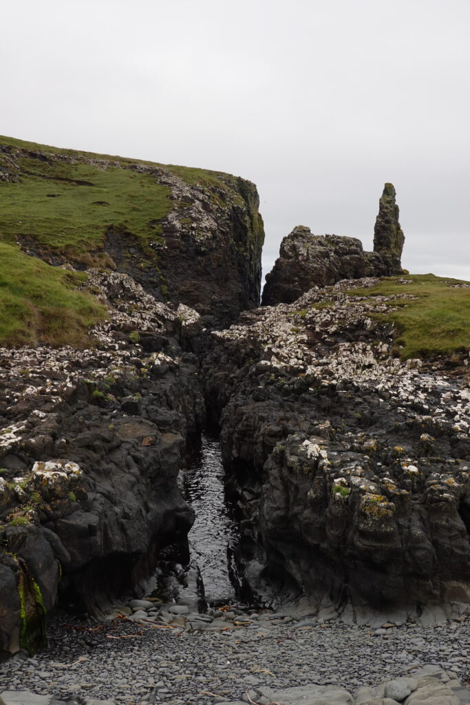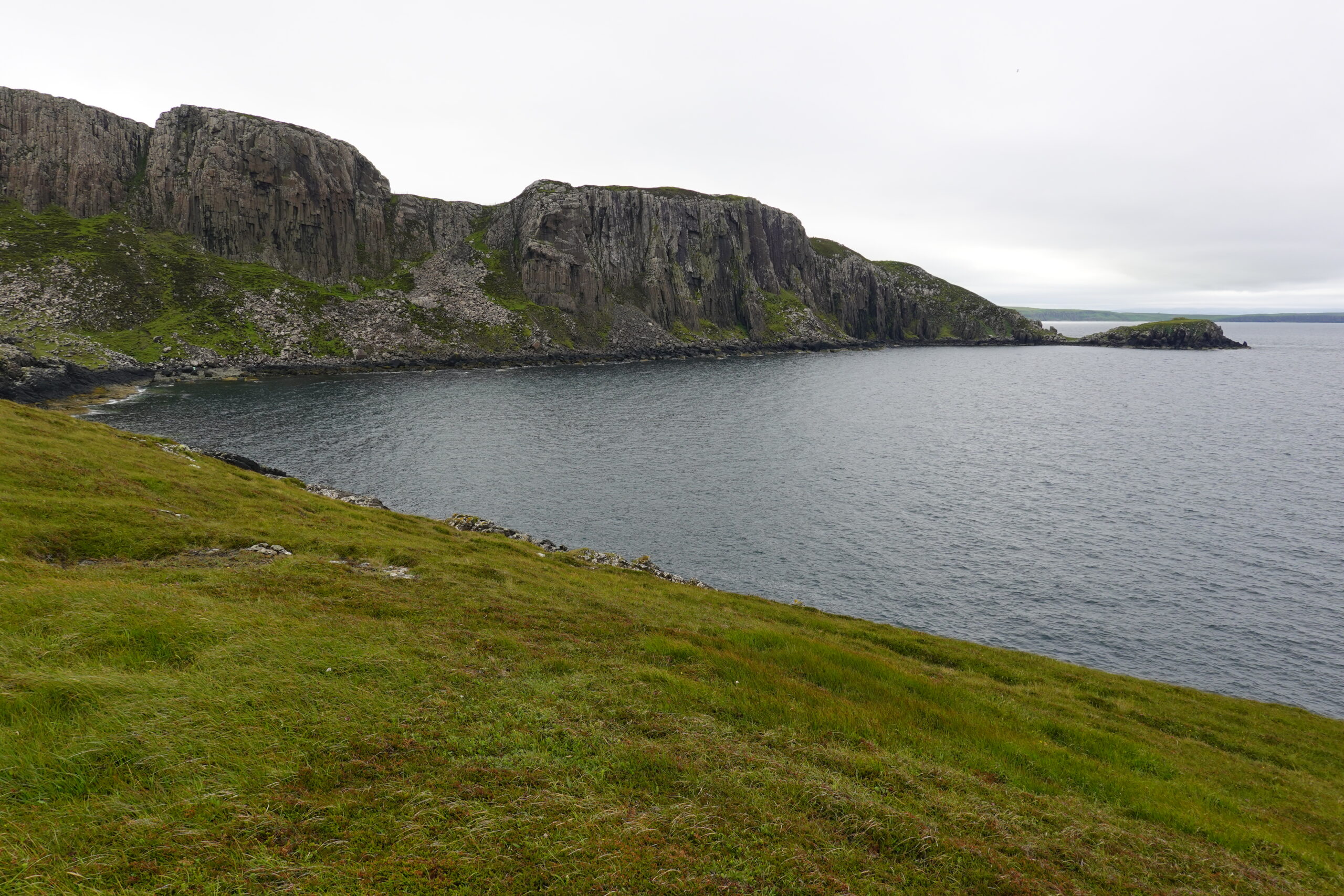 Depuis le haut de falaises aux belles colonnes de basalte, on emprunte un sentier bien raide pour descendre sur Rubha Hunish, le “headland” qui marque le point le plus septentrional de Skye (Rubha = headland). On s’émerveille devant un faucon pèlerin (et la prouesse de moutons présents en contrebas, qui sont visiblement plus agiles que nous) et le paysage, c’est grandiose même sous la pluie. Un passage scabreux nécessite un peu de scrambling sur les roches mouillées: je ne suis pas fan et je passe mon sac à José pour ce mini bout.