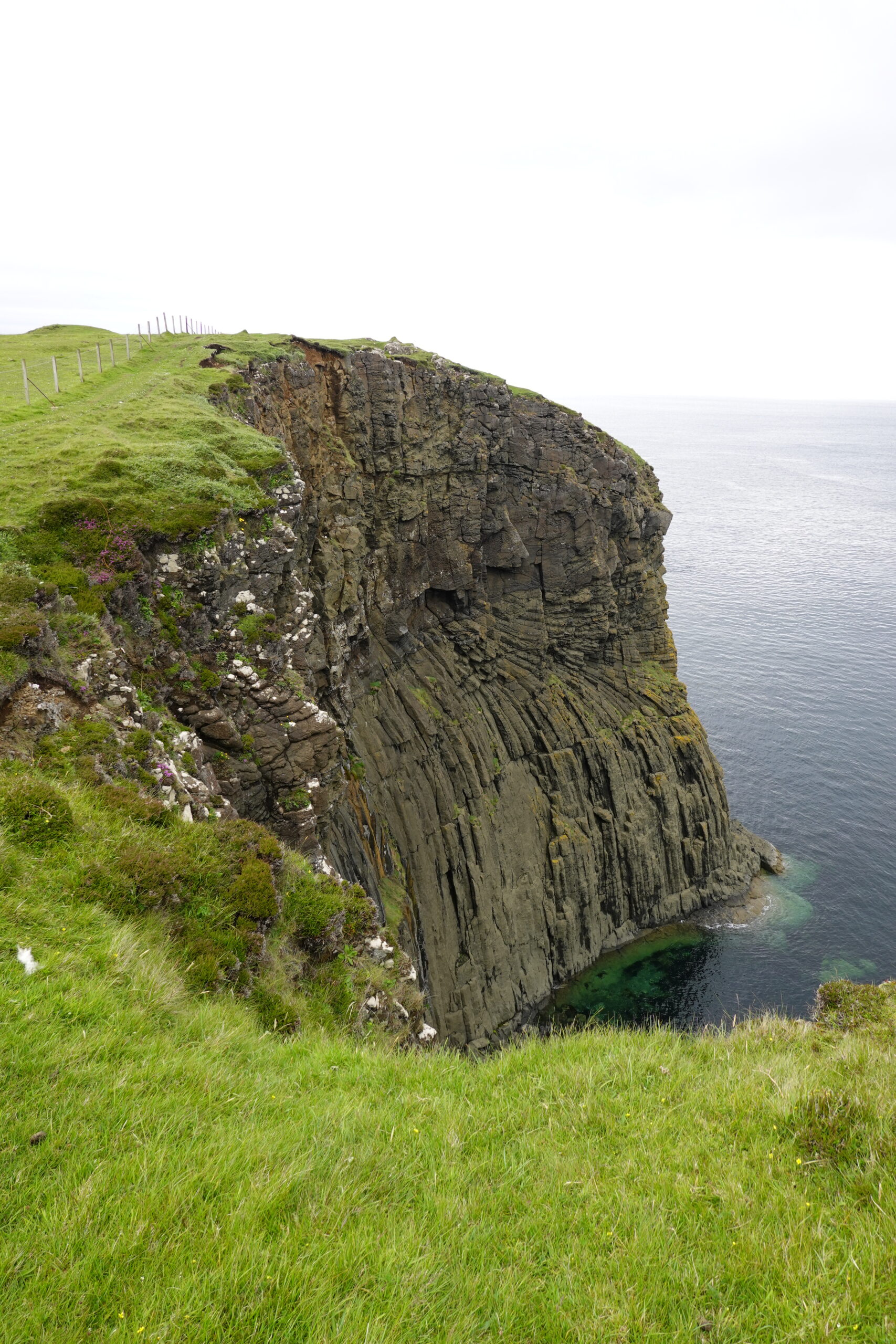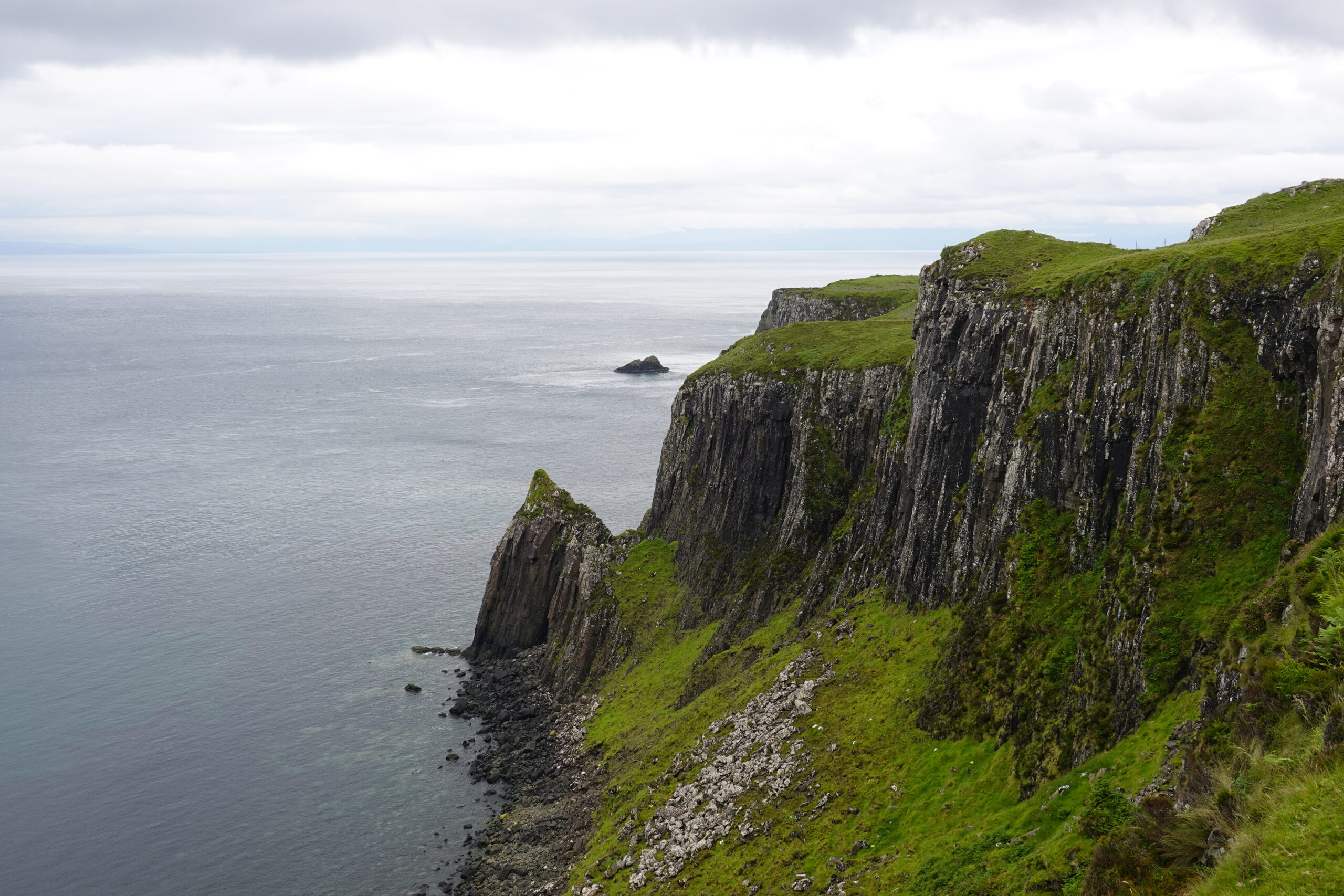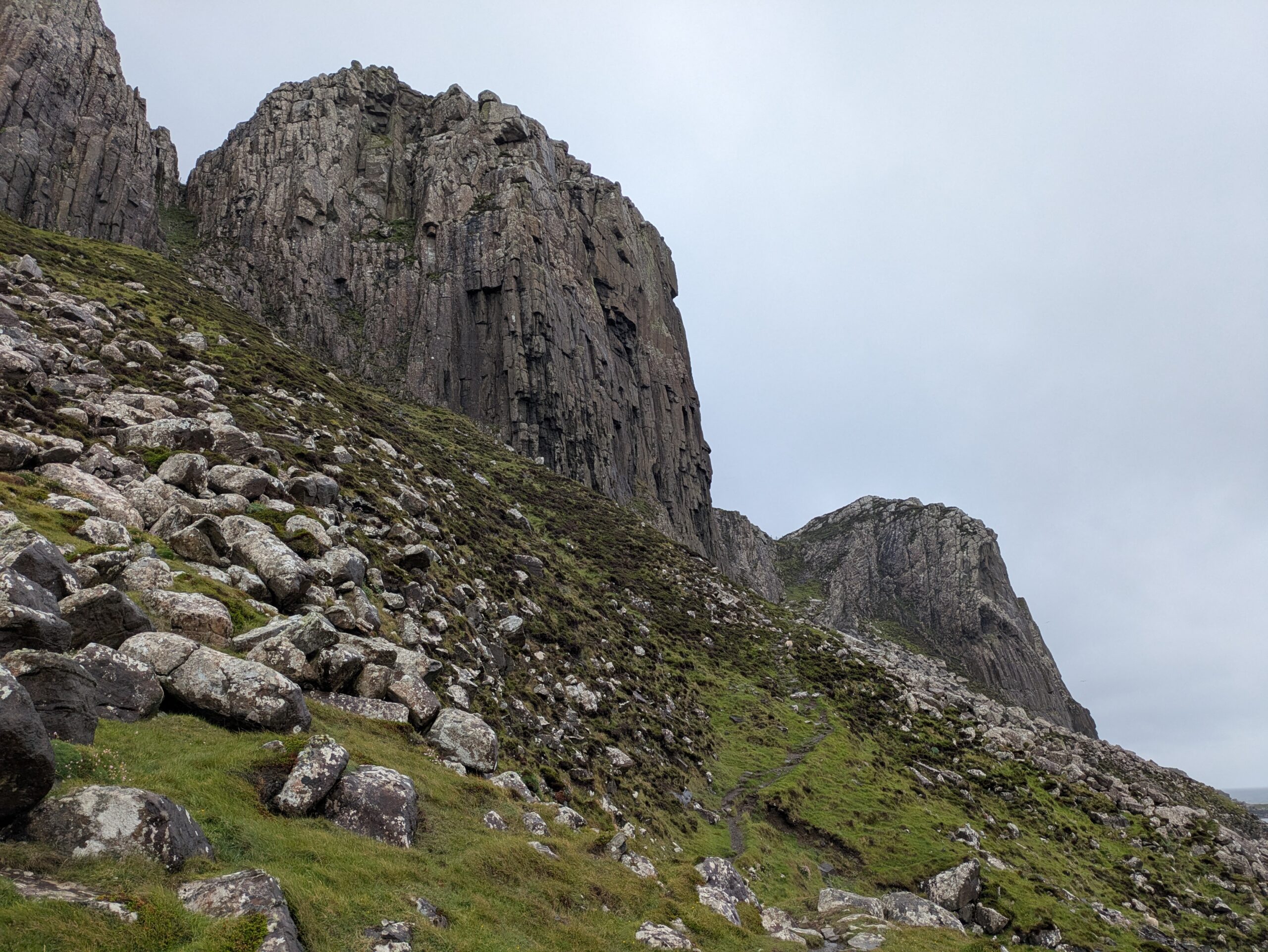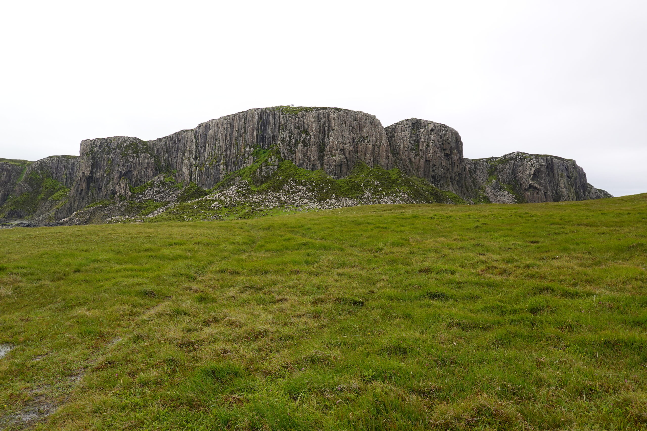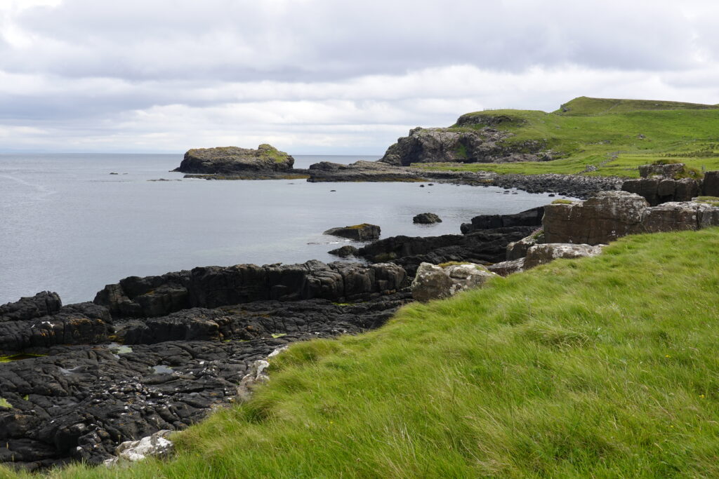 Depuis le haut de falaises aux belles colonnes de basalte, on emprunte un sentier bien raide pour descendre sur Rubha Hunish, le “headland” qui marque le point le plus septentrional de Skye (Rubha = headland). On s’émerveille devant un faucon pèlerin (et la prouesse de moutons présents en contrebas, qui sont visiblement plus agiles que nous) et le paysage, c’est grandiose même sous la pluie. Un passage scabreux nécessite un peu de scrambling sur les roches mouillées: je ne suis pas fan et je passe mon sac à José pour ce mini bout.