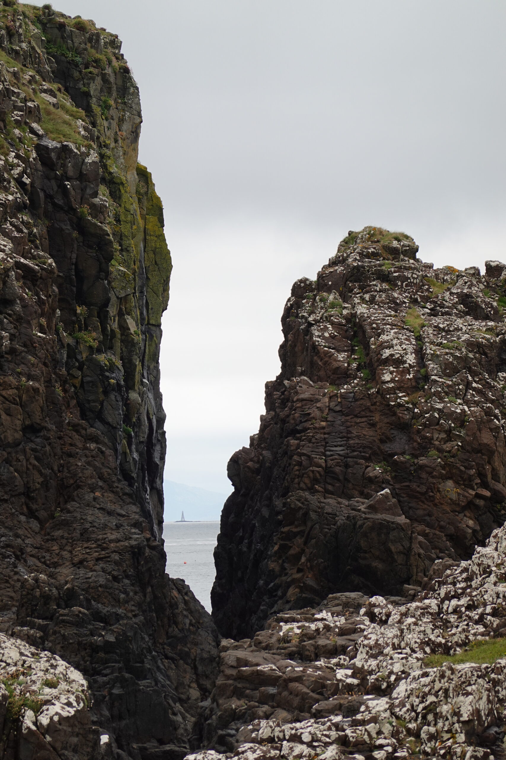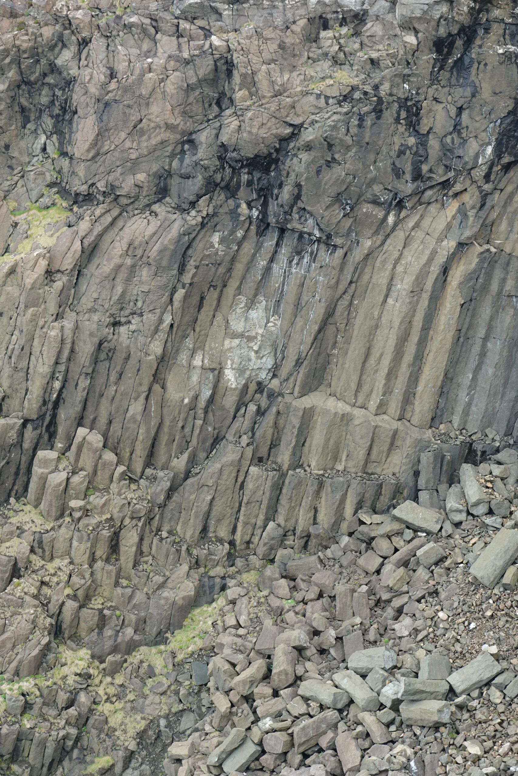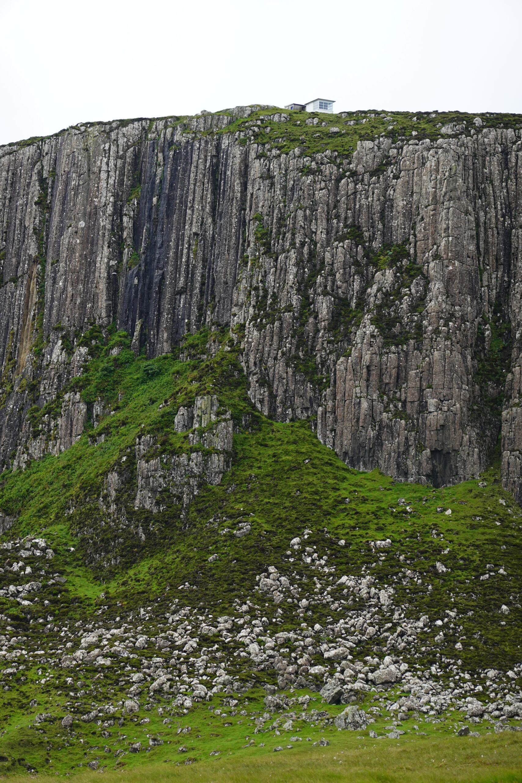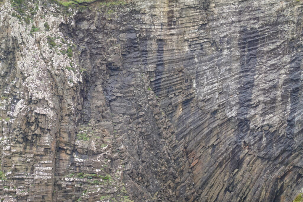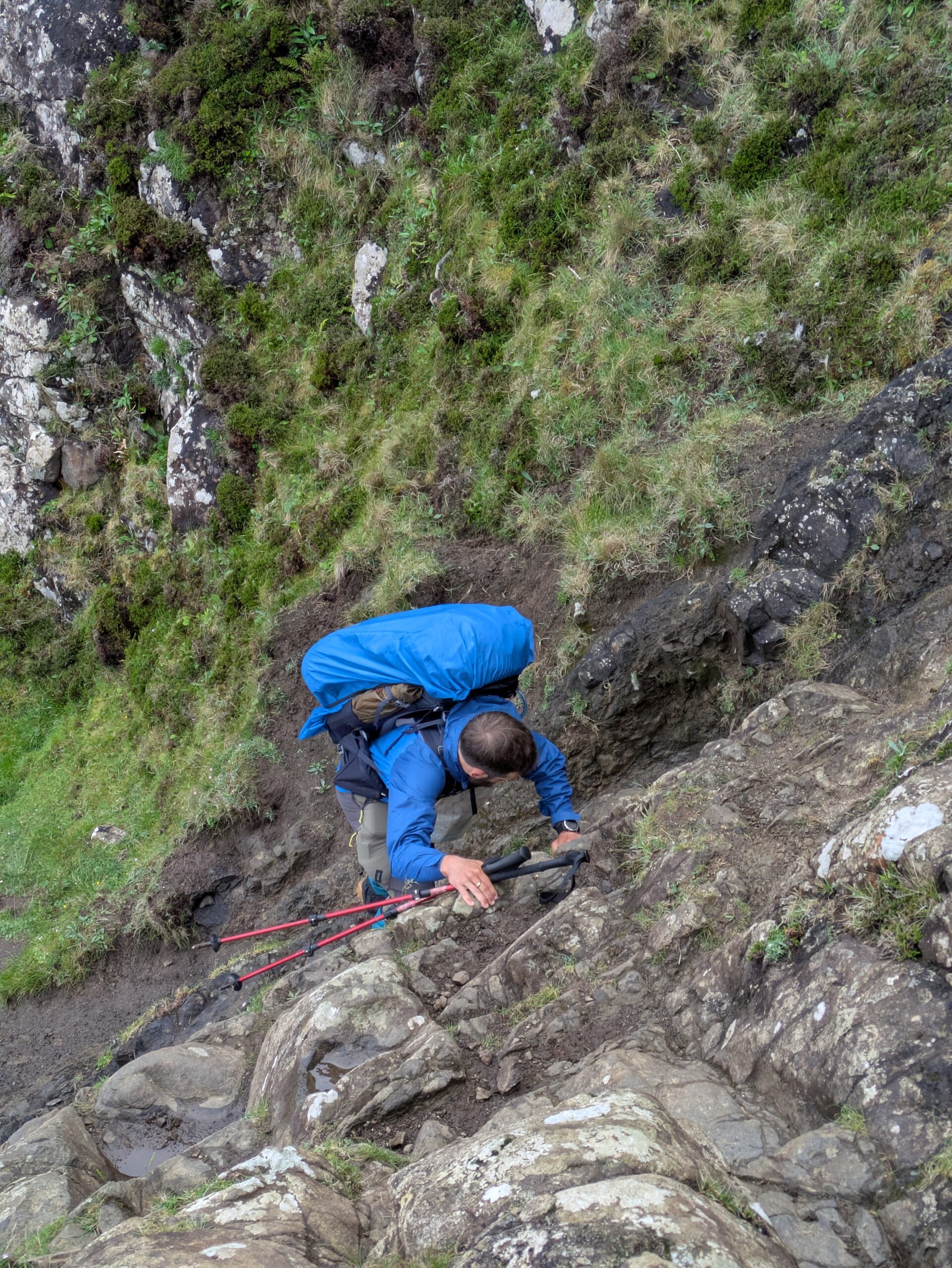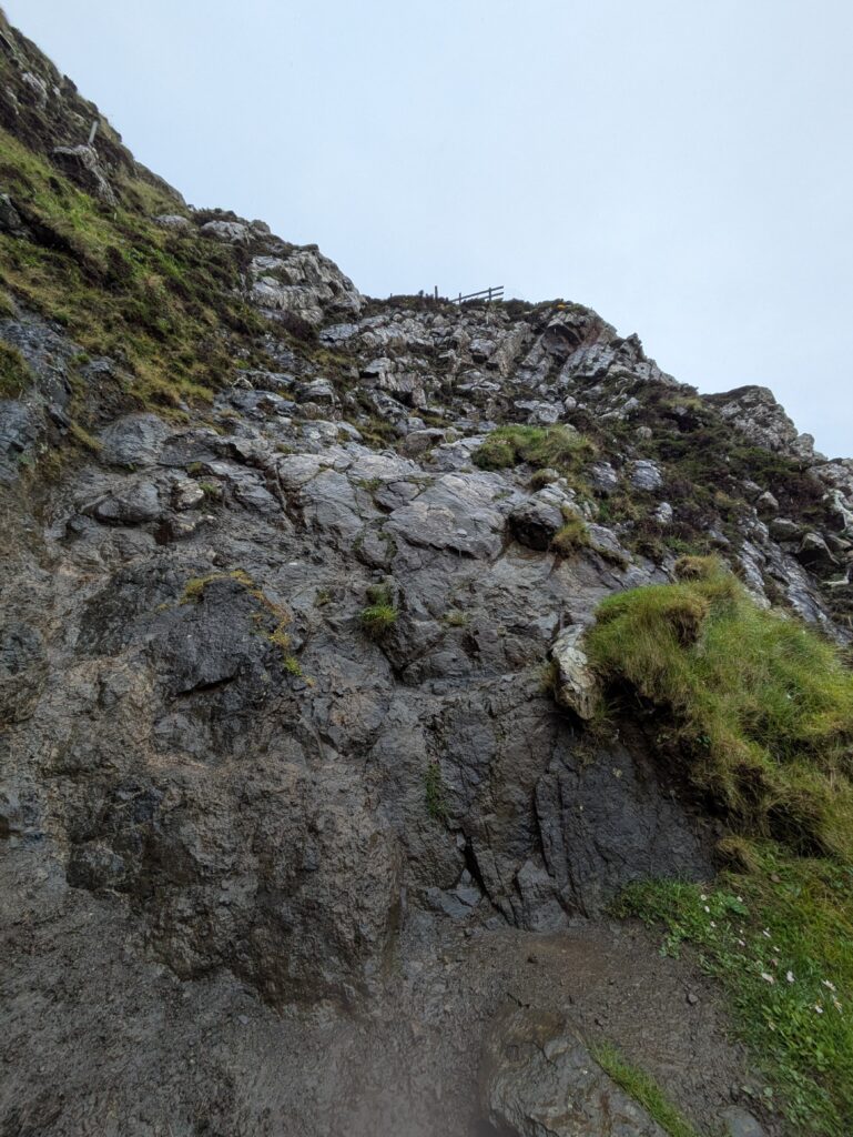 Depuis le haut de falaises aux belles colonnes de basalte, on emprunte un sentier bien raide pour descendre sur Rubha Hunish, le “headland” qui marque le point le plus septentrional de Skye (Rubha = headland). On s’émerveille devant un faucon pèlerin (et la prouesse de moutons présents en contrebas, qui sont visiblement plus agiles que nous) et le paysage, c’est grandiose même sous la pluie. Un passage scabreux nécessite un peu de scrambling sur les roches mouillées: je ne suis pas fan et je passe mon sac à José pour ce mini bout.