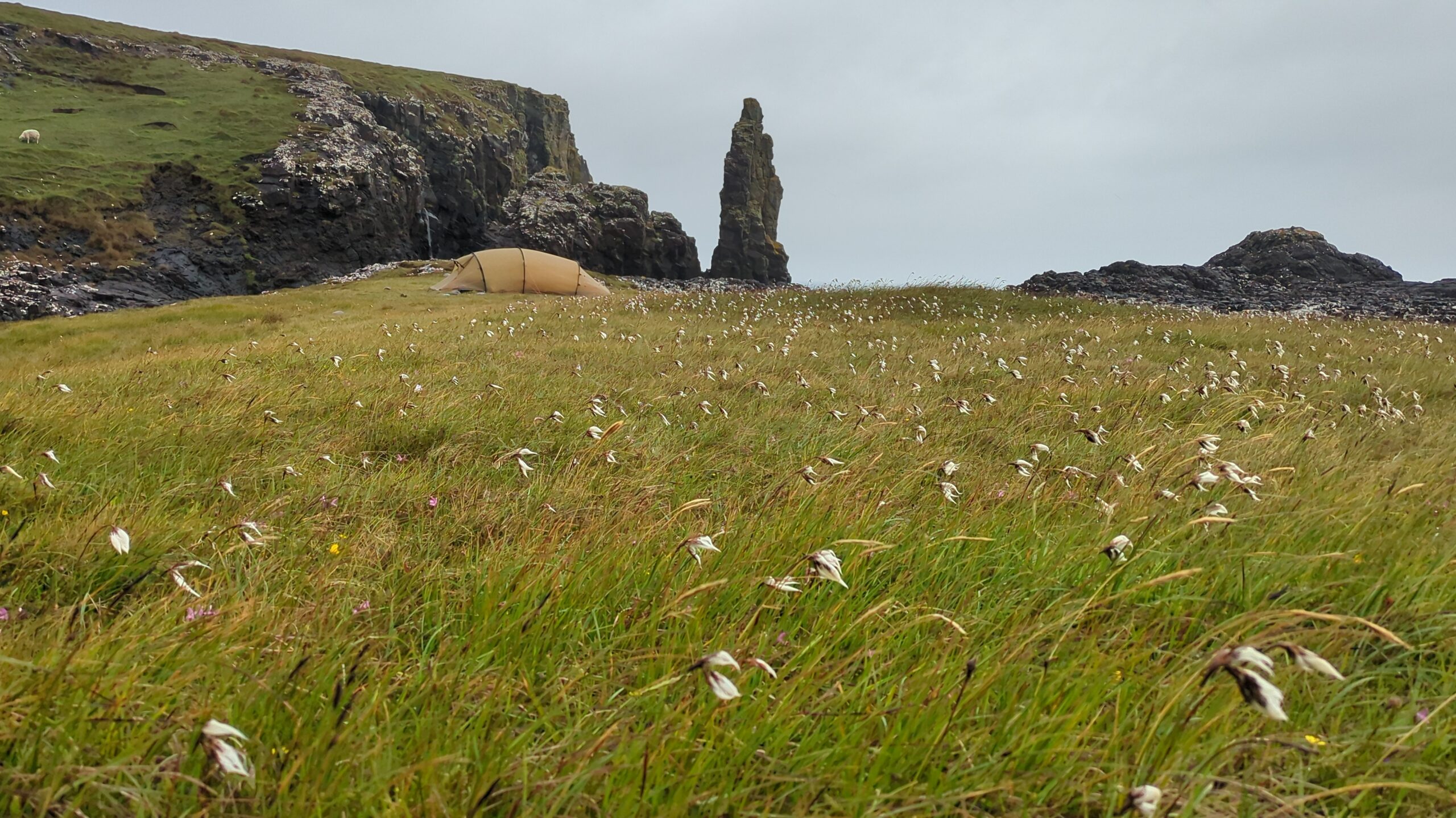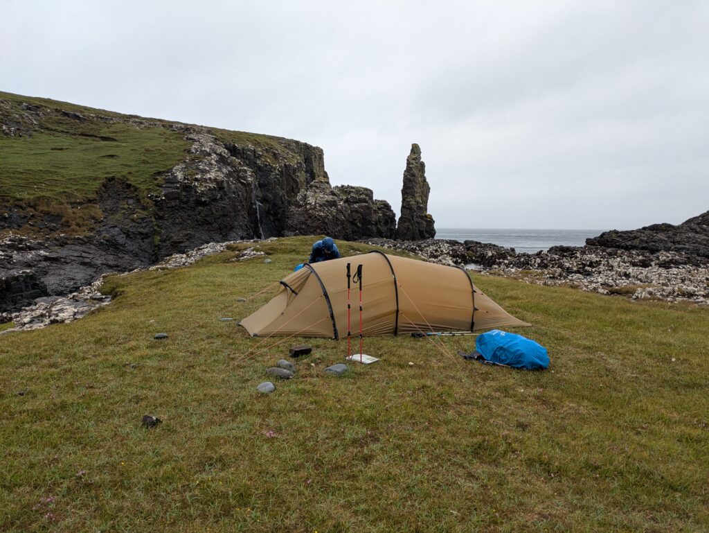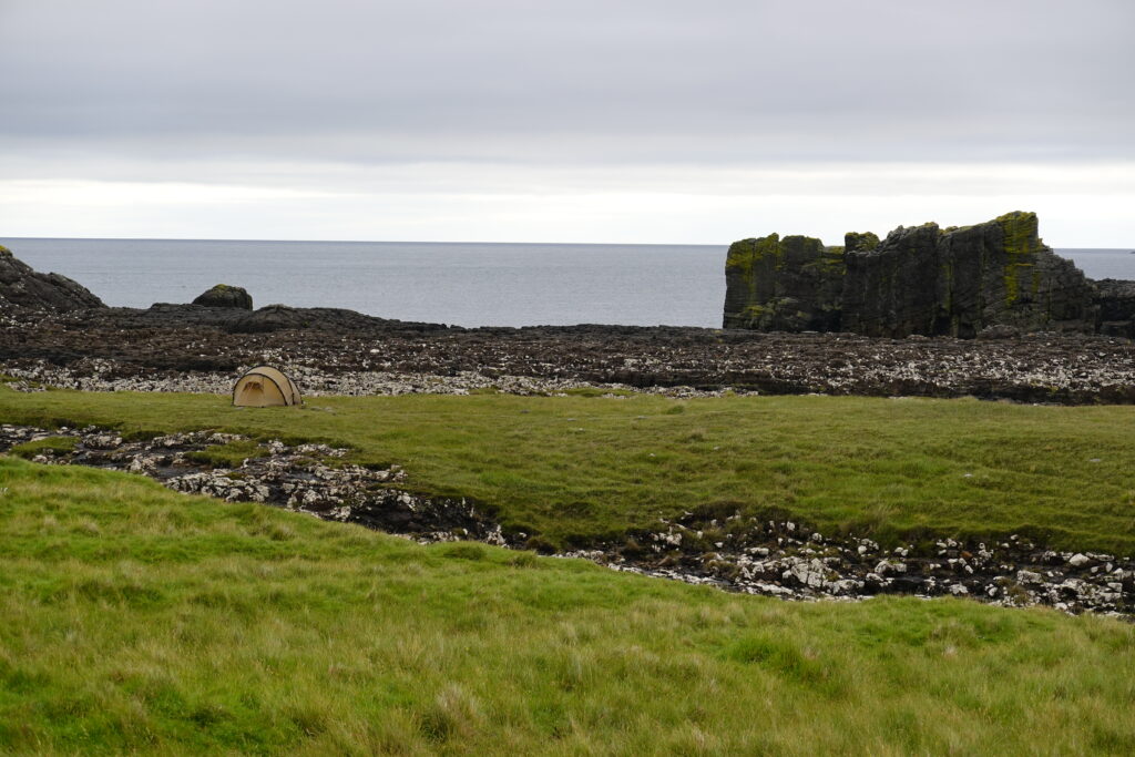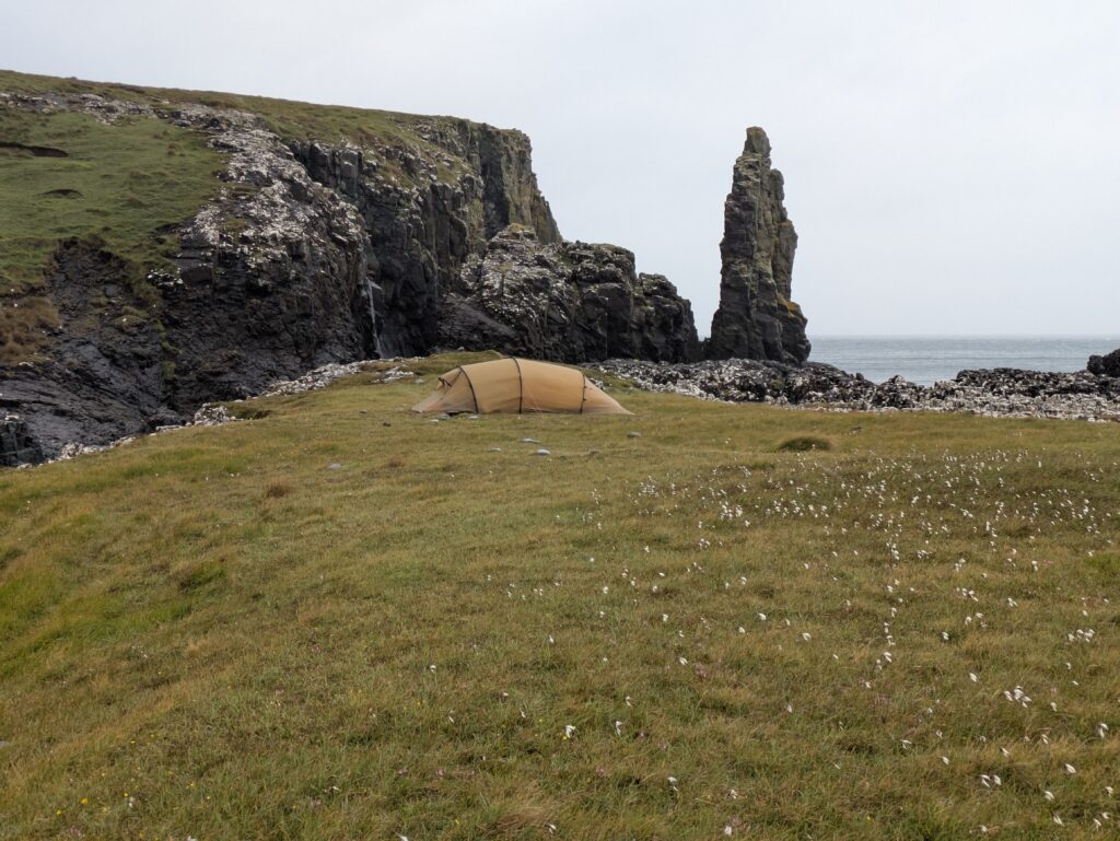Une fois sur le headland, on pitche la tente dans le vent — on a cherché un coin un peu à l’abri, mais les rafales restent impressionnantes. Sitôt installés (il est 17h), on s’octroie un cookie acheté chez Birch, puis une sieste (on avait déjà failli s’endormir dans le 2e bus, bercés par la route). On se sent crevés, les jours de “repos” à Inverness n’ayant pas vraiment été relaxants. Au réveil, on étudie le parcours pour les prochains jours, au son du coucou qui brave la pluie et chante dans le vent. On brave nous aussi les éléments pour faire, et je cite ici le carnet, “des pipis épiques dans le vent (pas des pipits, mais ça volait quand même, mouhaha)”. Bref, on était fatigués, haha. ^^’