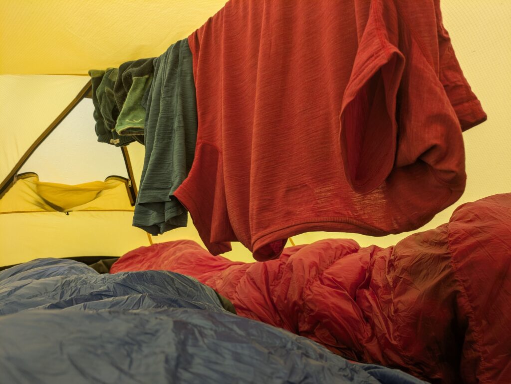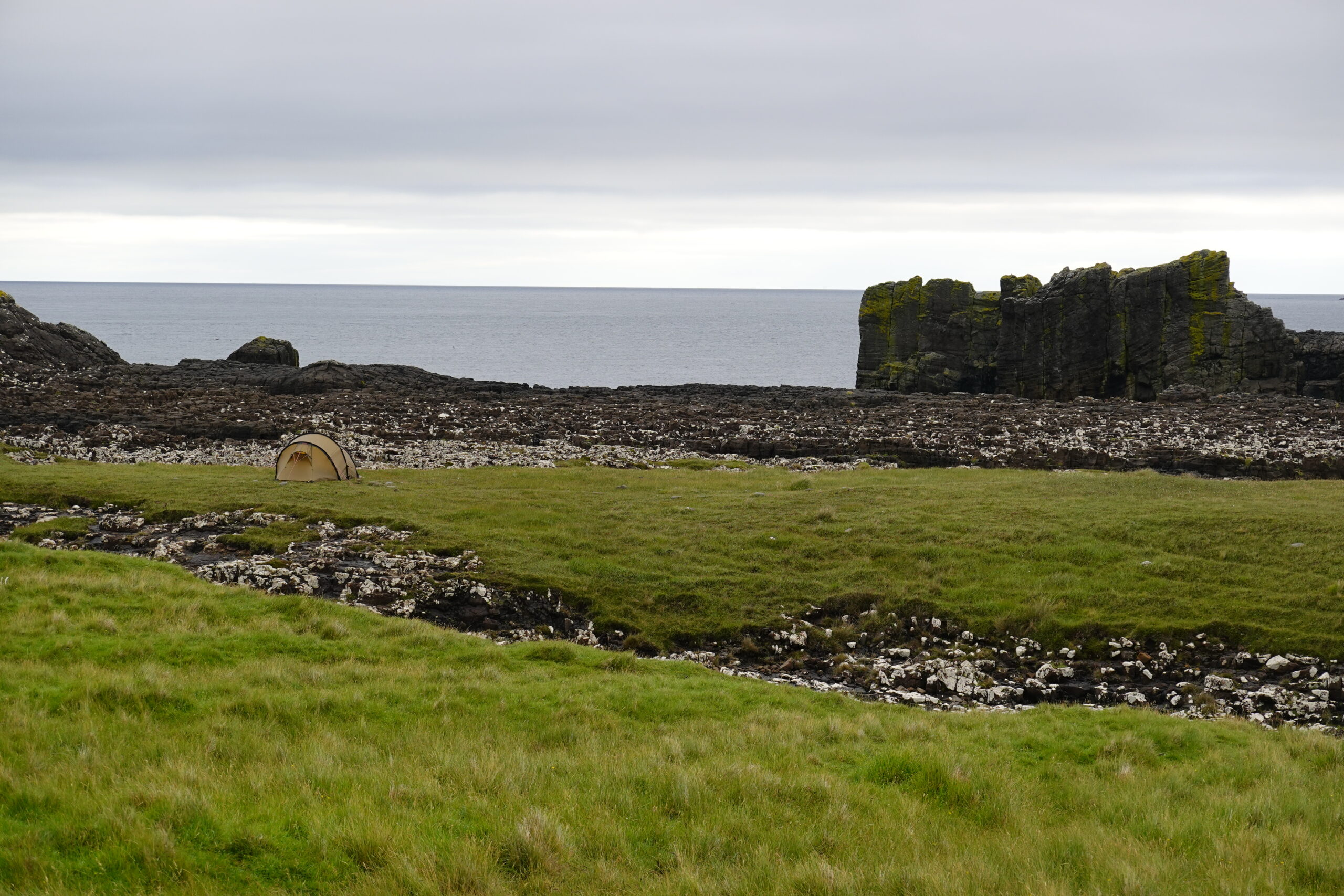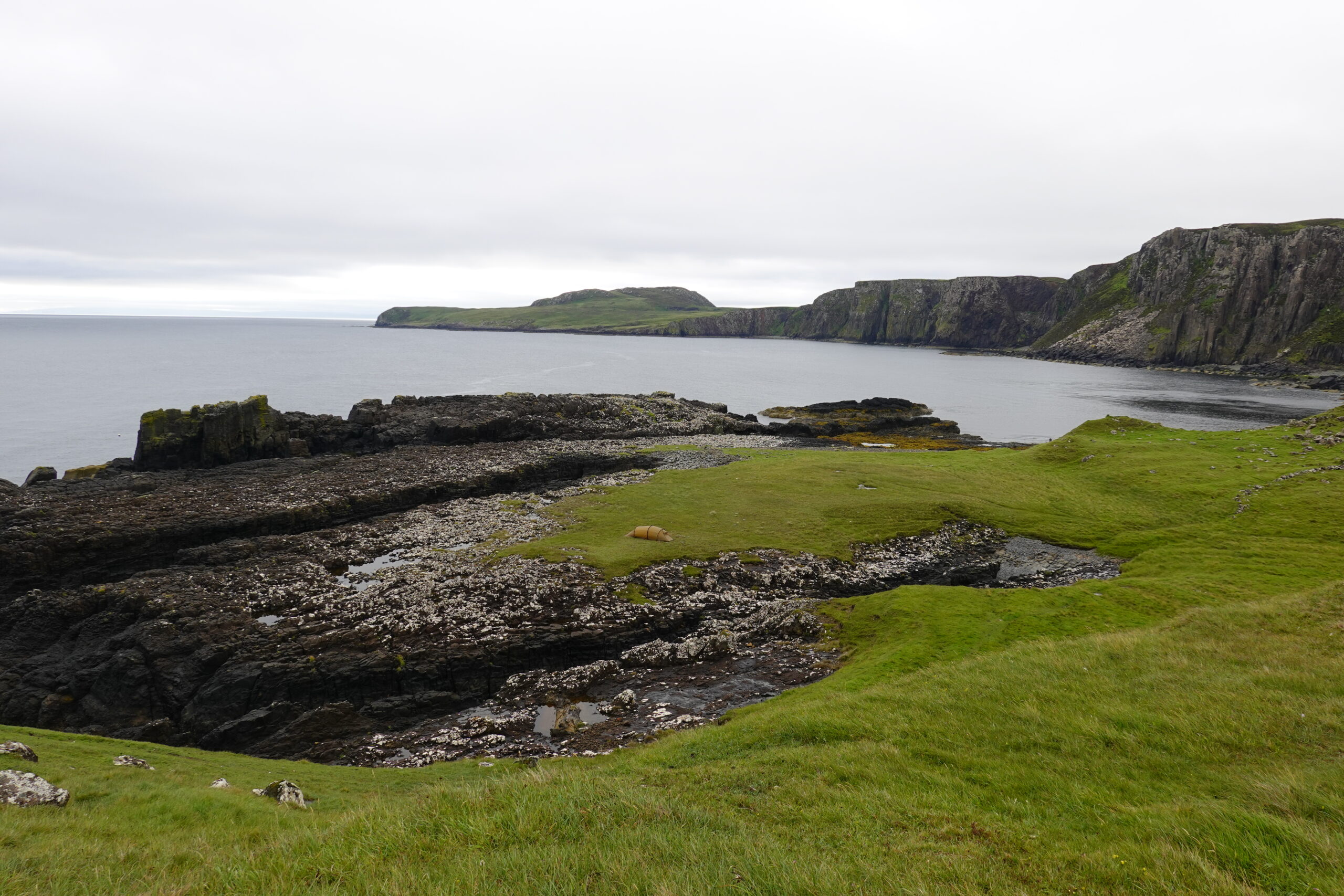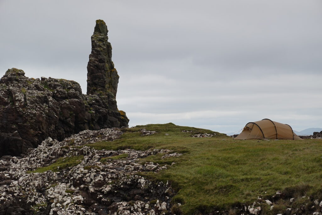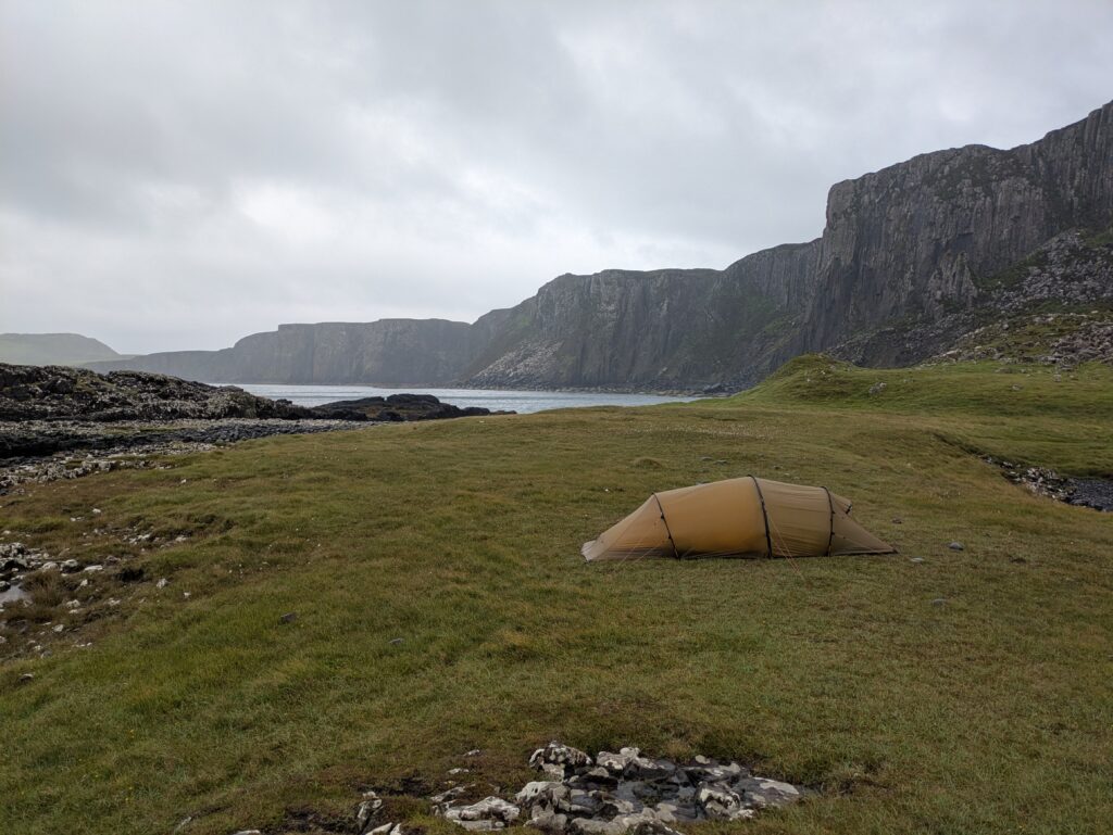 Le lendemain, le Skye Trail a véritablement commencé, avec une journée plus courte et difficile que prévu, notamment car on était très fatigués. Entre le bruit de la pluie, le vent et des maux de ventre, on a mal dormi. Mais au réveil, la pluie avait cessé, et le vent aussi! 🙂