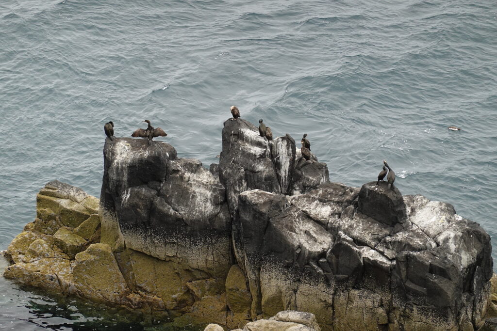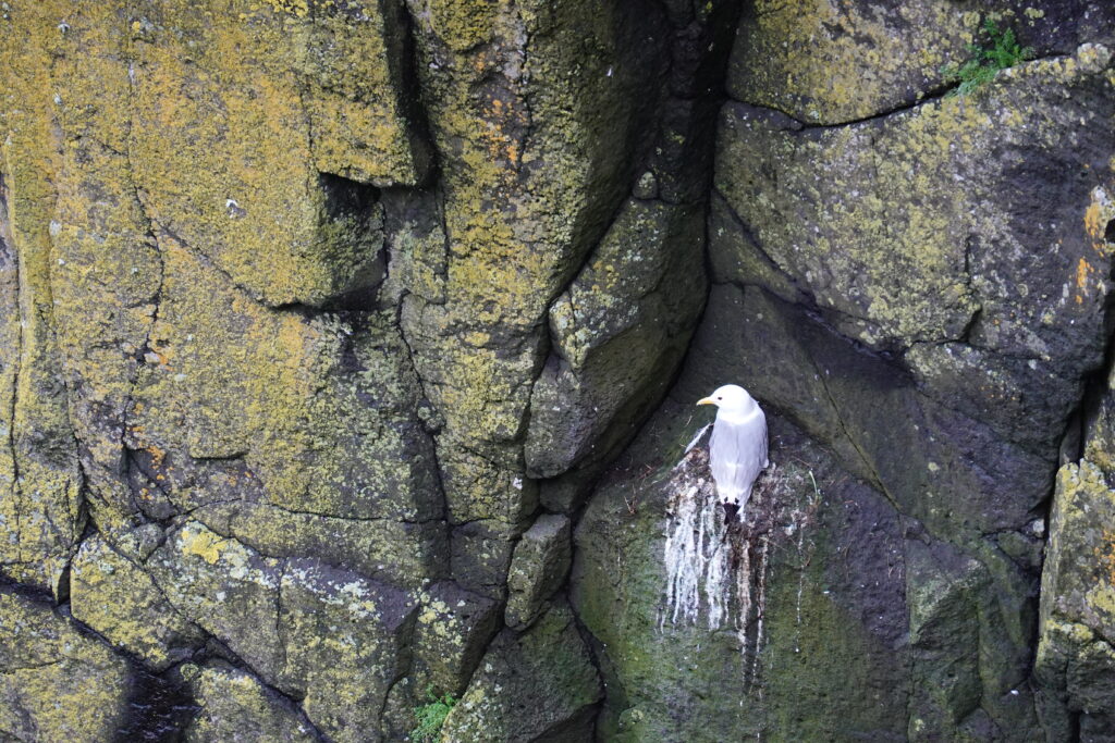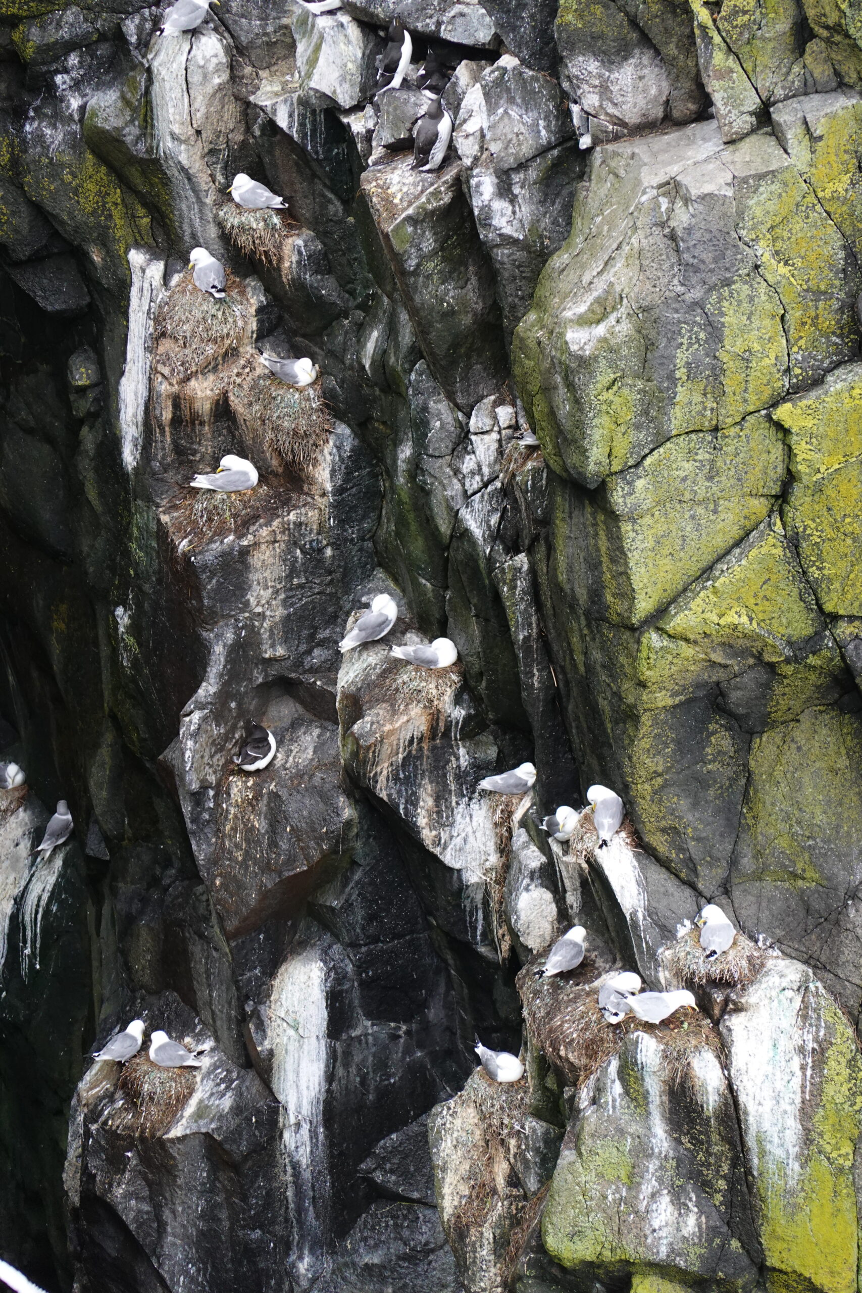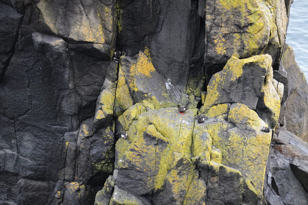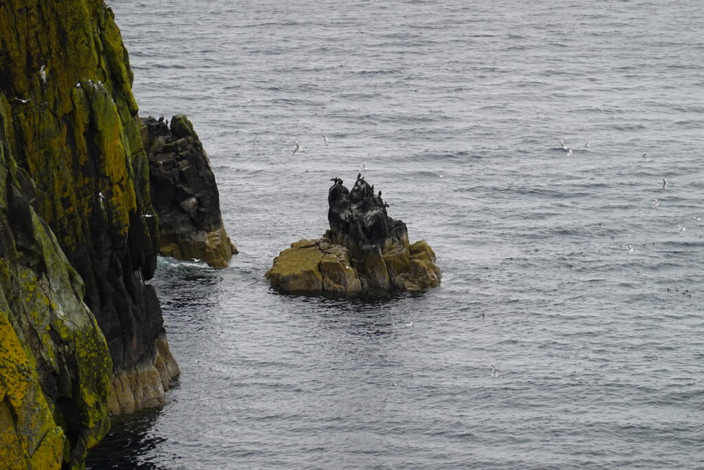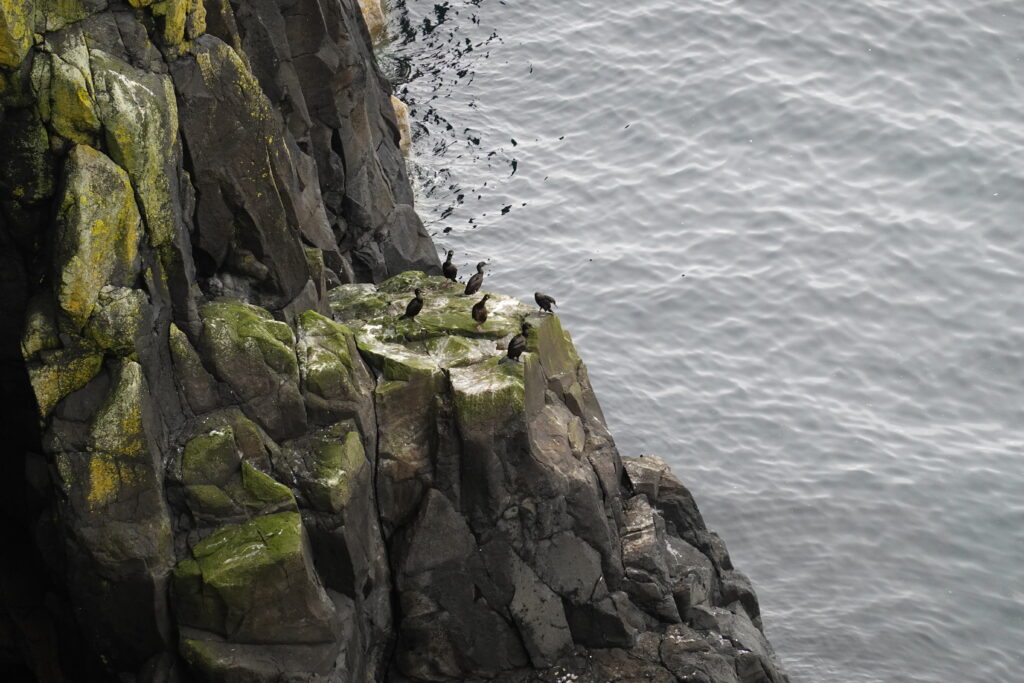 Des cormorans volent au ras de l’eau, des radeaux de razorbills flottent au bas des falaises et les kittiwakes sont présents en nombre. C’est beau et paisible.