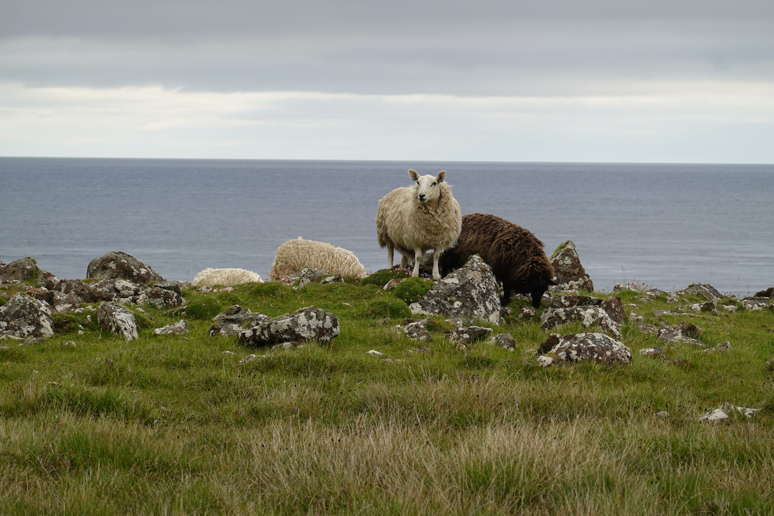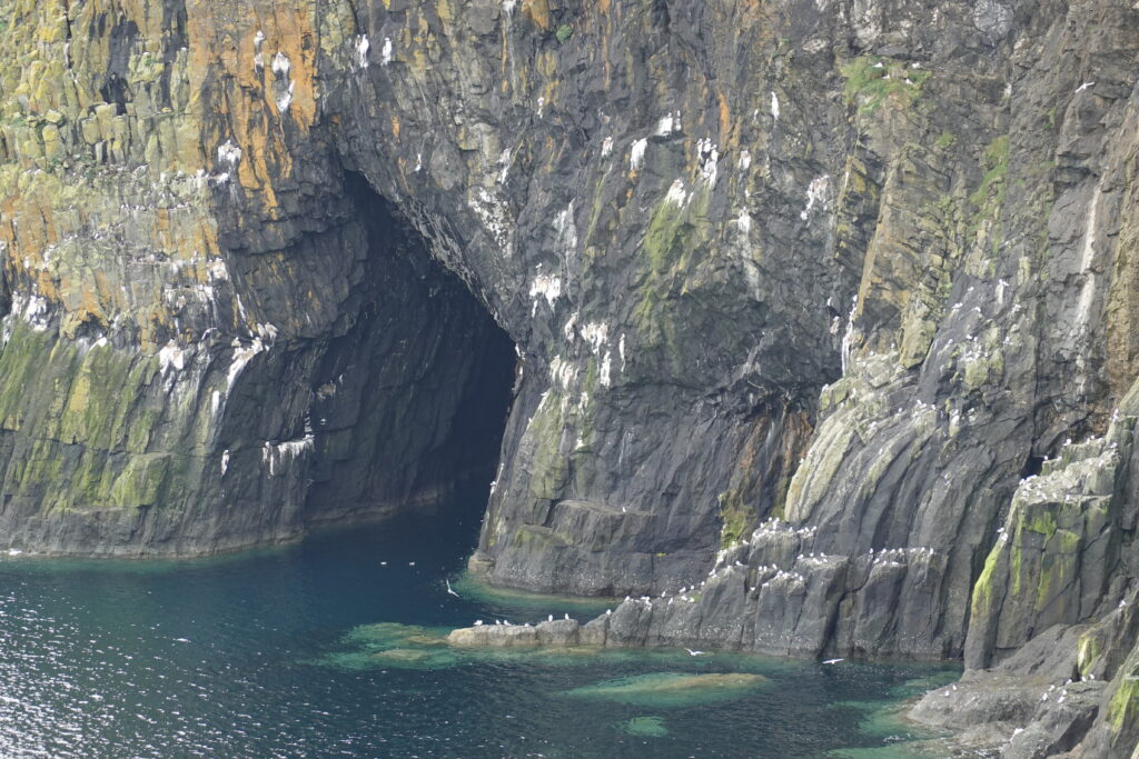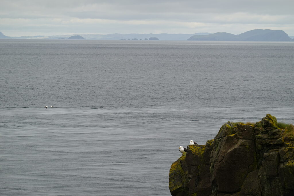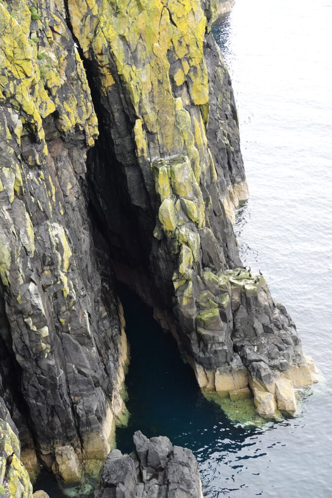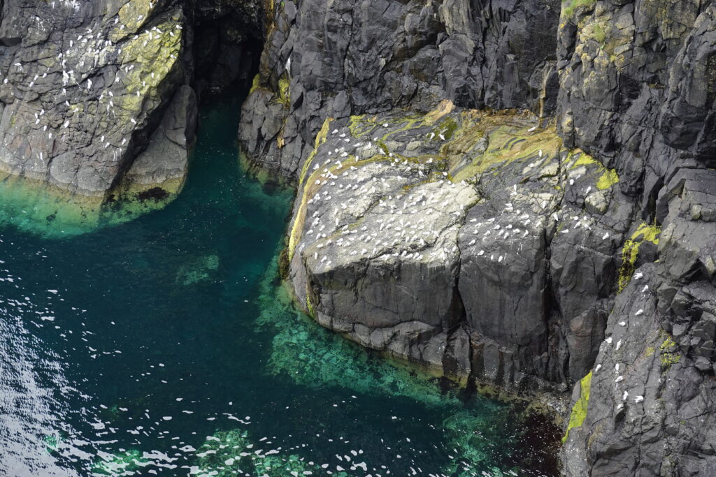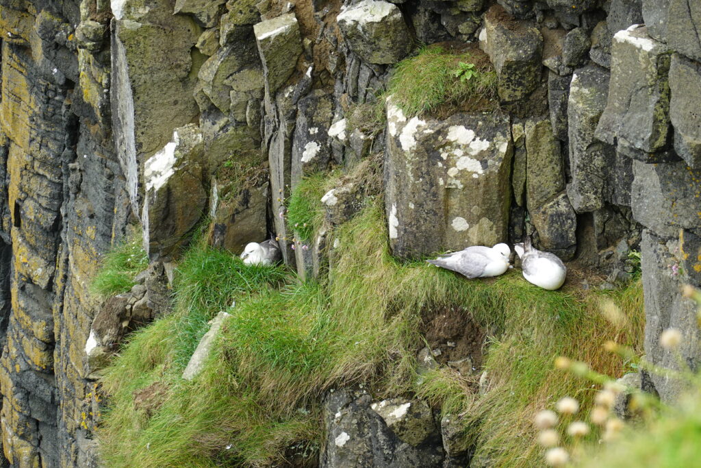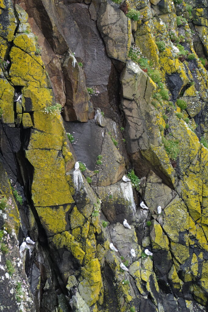 La côte est belle. Fulmars, corneilles mantelées, black-backed gulls, guillemots à miroir, grand corbeau, étourneaux… Ça piaille, siffle et roucoule partout. On voit aussi des border collies rassembler des moutons, héhé. 🙂