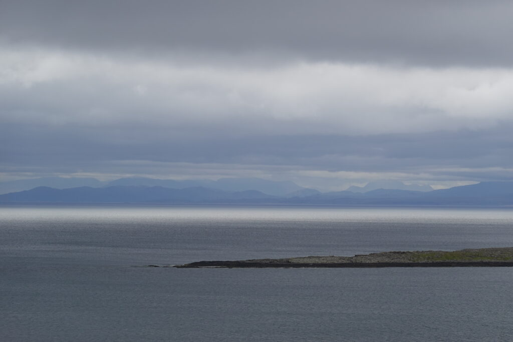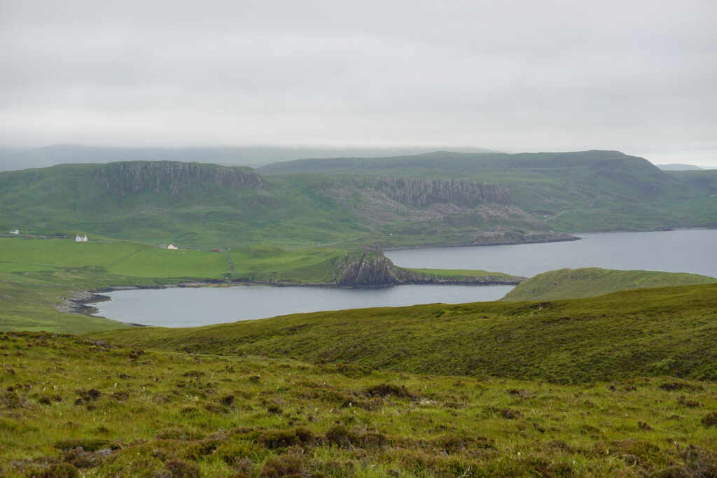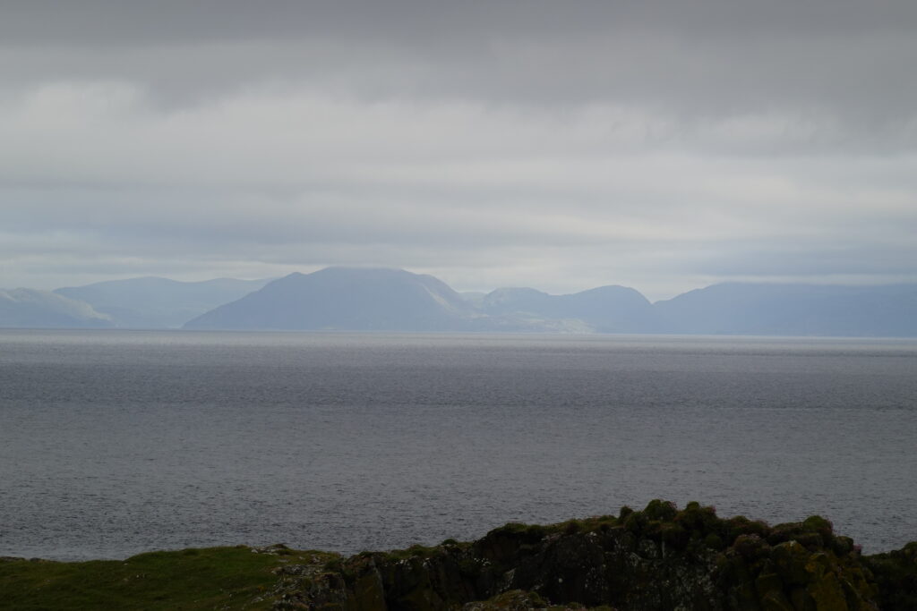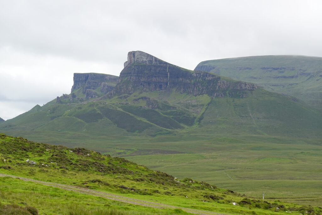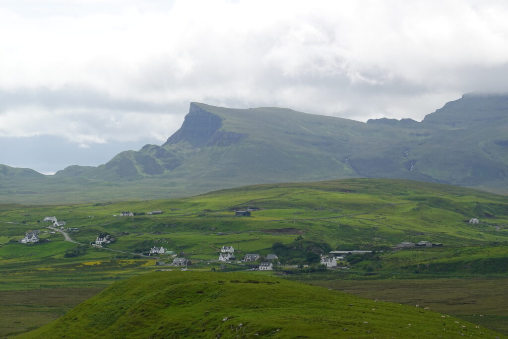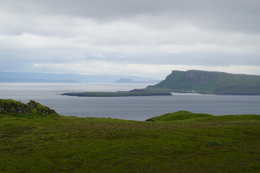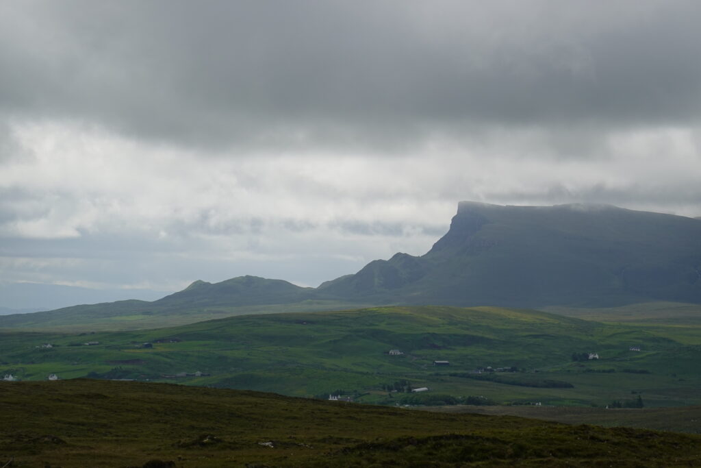 Au loin, on aperçoit déjà les montagnes autour du Quiraing, à l’allure si mystique.