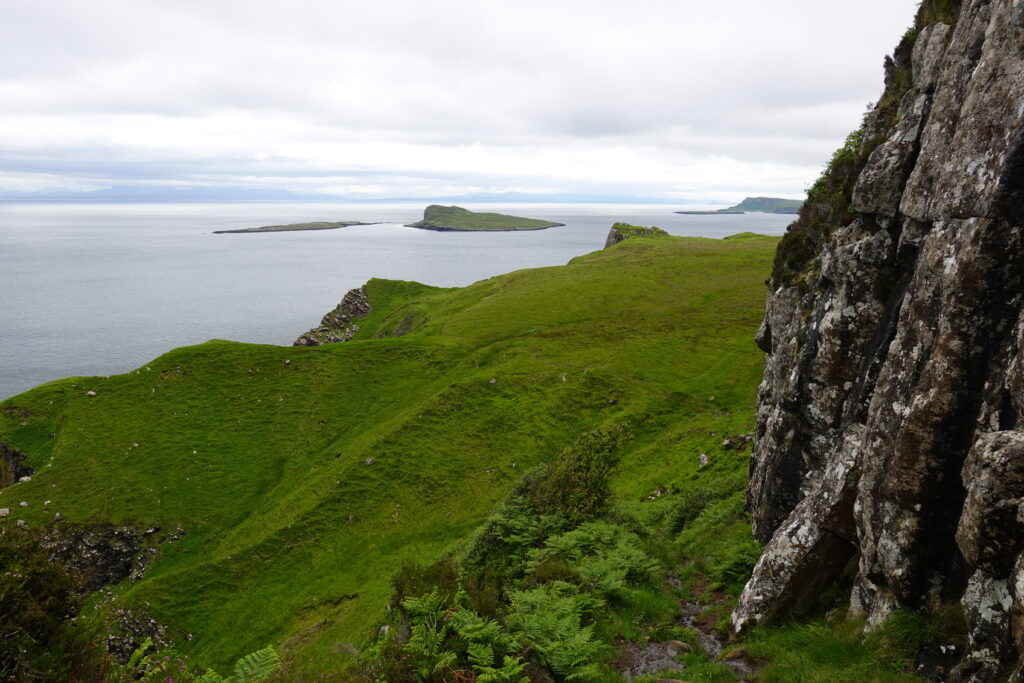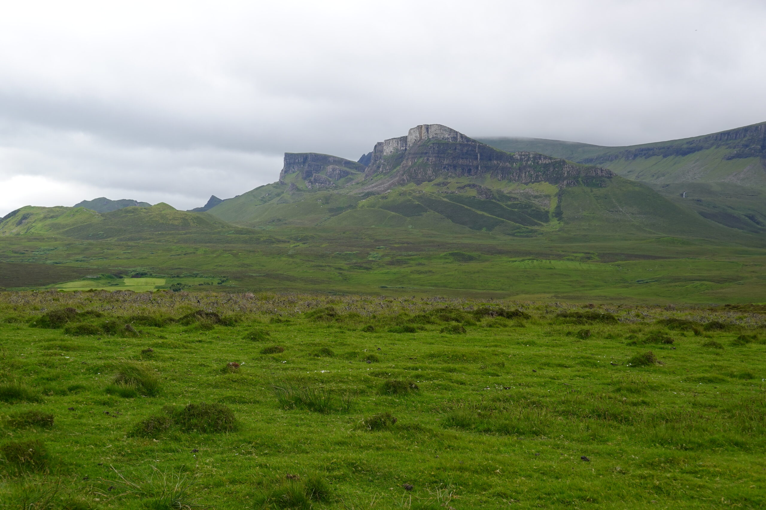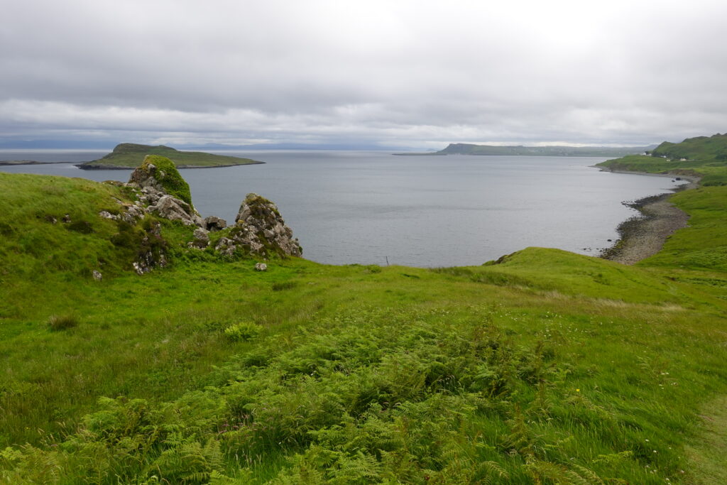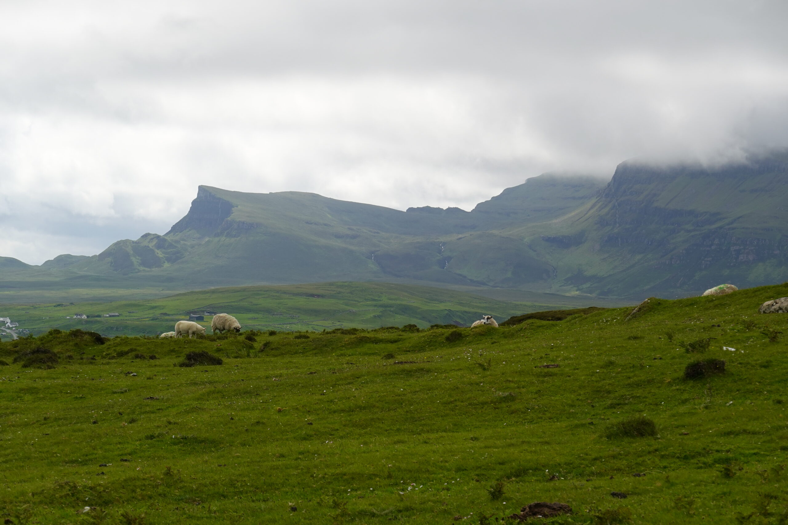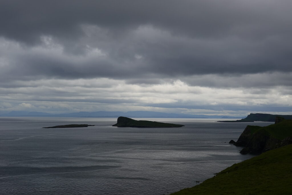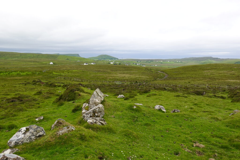 Au loin, on aperçoit déjà les montagnes autour du Quiraing, à l’allure si mystique.