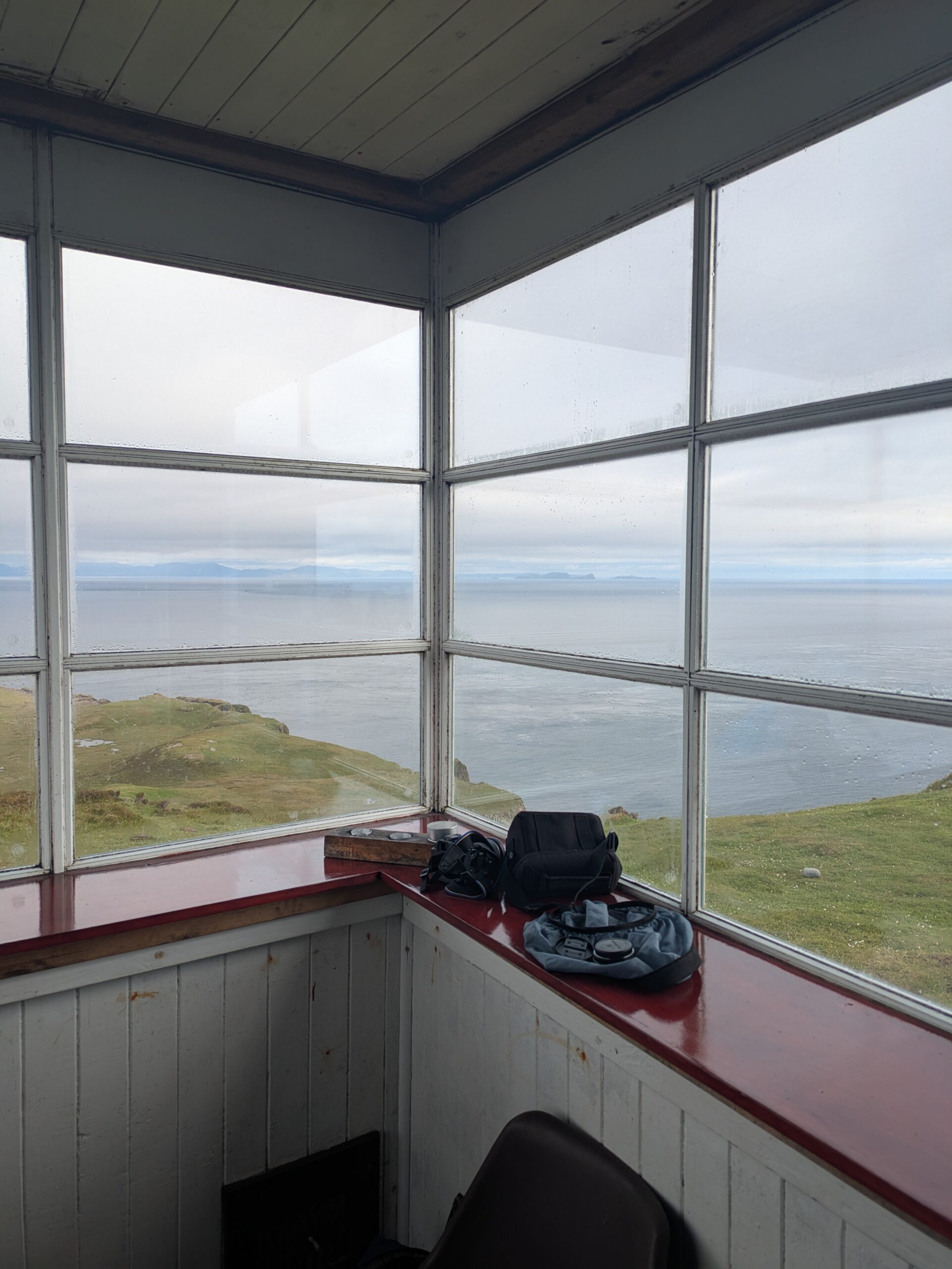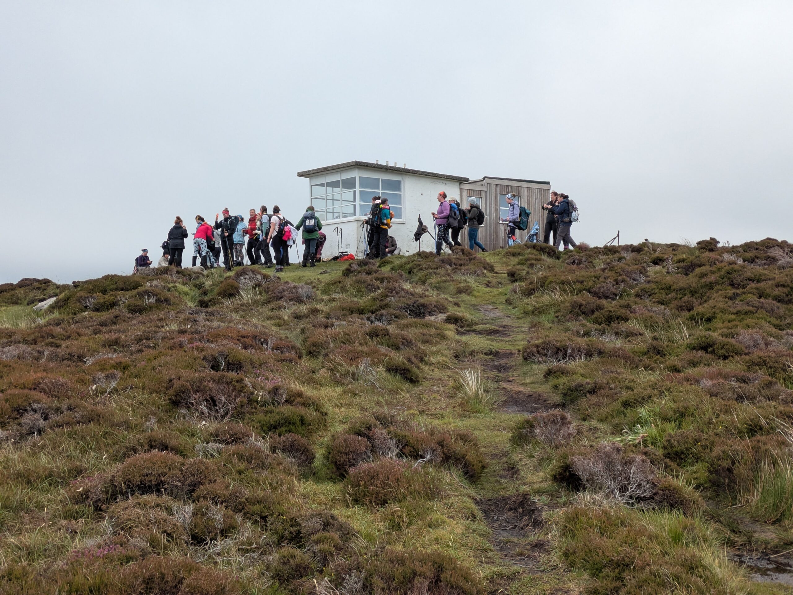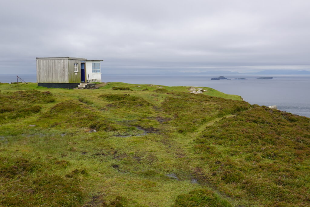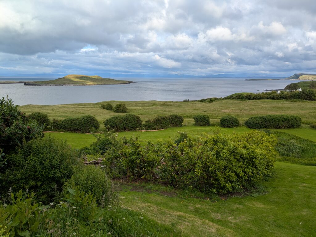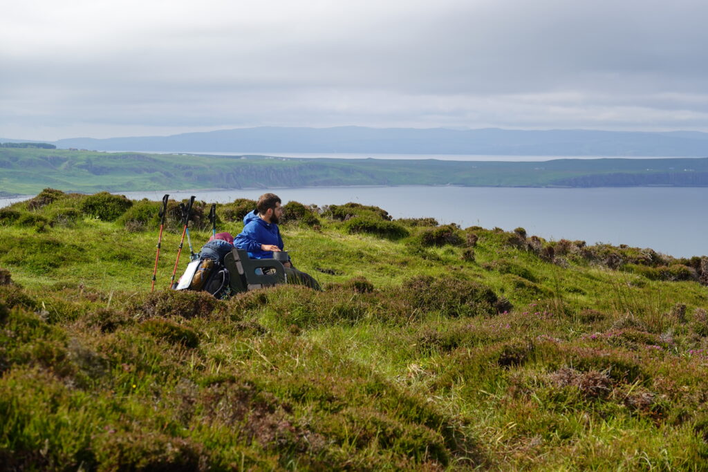 Vu le monde à l’intérieur et la petitesse du bothy, on sort préparer et manger notre porridge dehors, bien installés sur un banc avec vue sur Rubha Hunish. On discute tranquillement avec l’Ecossais, quand soudain une trentaine de femmes débarquent. Après enquête, on apprend qu’elles récoltent de l’argent pour une fondation contre le cancer du sein en marchant 100 km en 5 jours (mais heureusement pas tout à fait le long du Skye Trail).