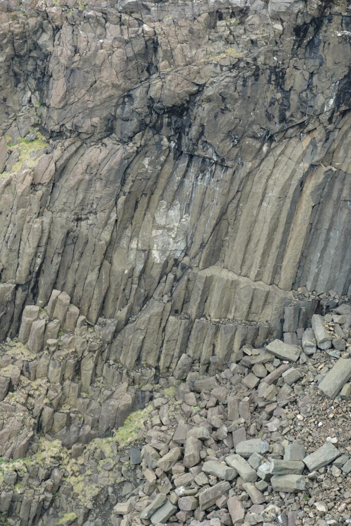 Les colonnes pliées, des bouts brisés qui jonchent le pied des falaises, les angles surprenants des montagnes au loin… On croirait évoluer dans un paysage préhistorique, et on imagine facilement un dinosaure ou deux croiser notre route.