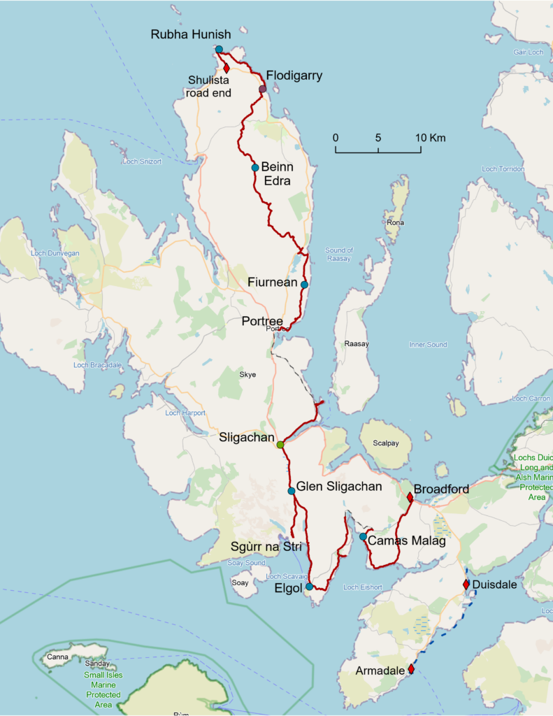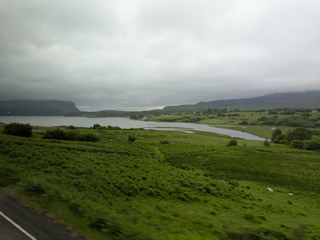 Une fois repus, on a juste le temps de passer au petit Co-op (malheureusement peu fourni en snacks sains) avant de retourner à l’arrêt de bus pour prendre le 57C de 13h20, direction le nord de l’île. Le trajet nous fait passer par Uig, d’où partent des ferries pour les Western Isles. D’ailleurs, en regardant les options d’itinéraire entre Inverness et le nord de Skye, Traveline (une appli de transports publics britannique) voulait nous faire passer par les Hébrides extérieures (et donc prendre deux longs ferries au lieu de juste un bus ^^), il avait complètement craqué! ^^’