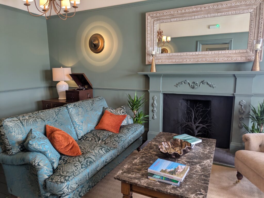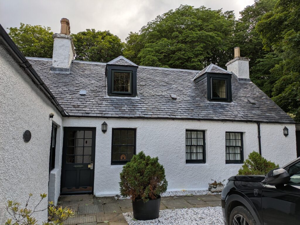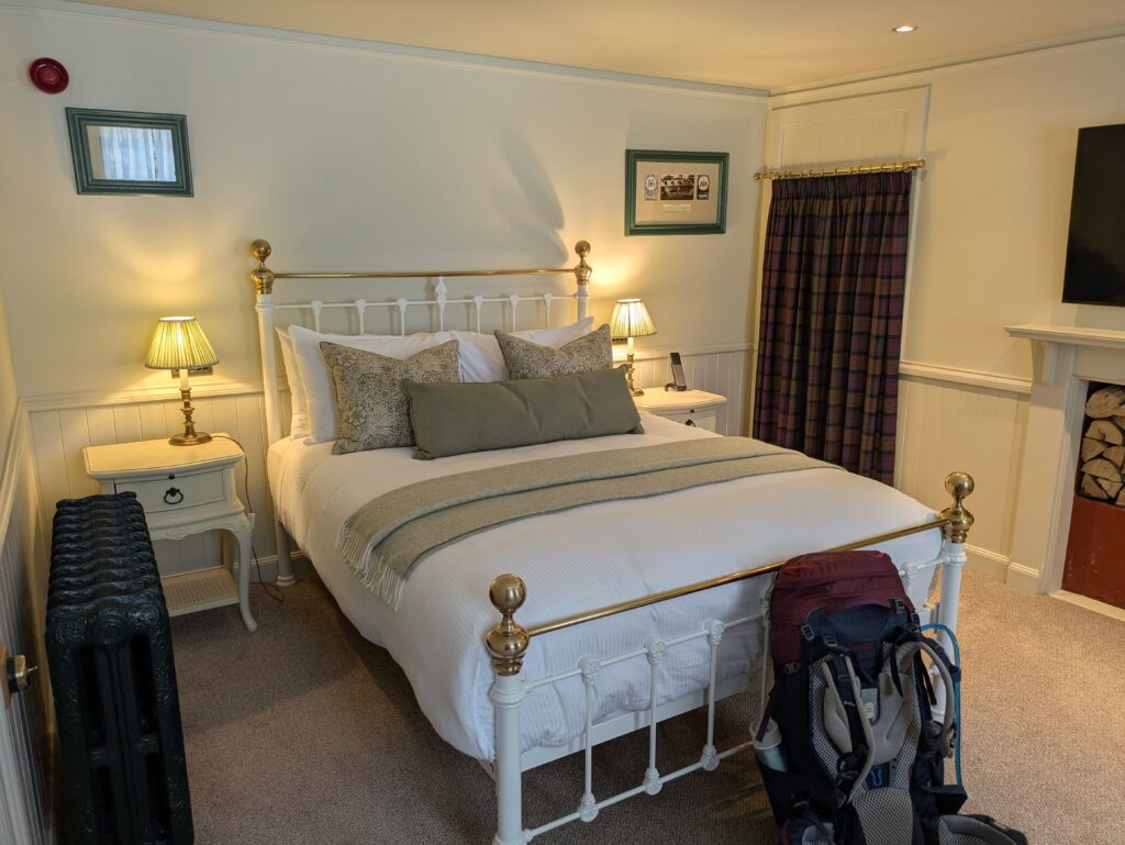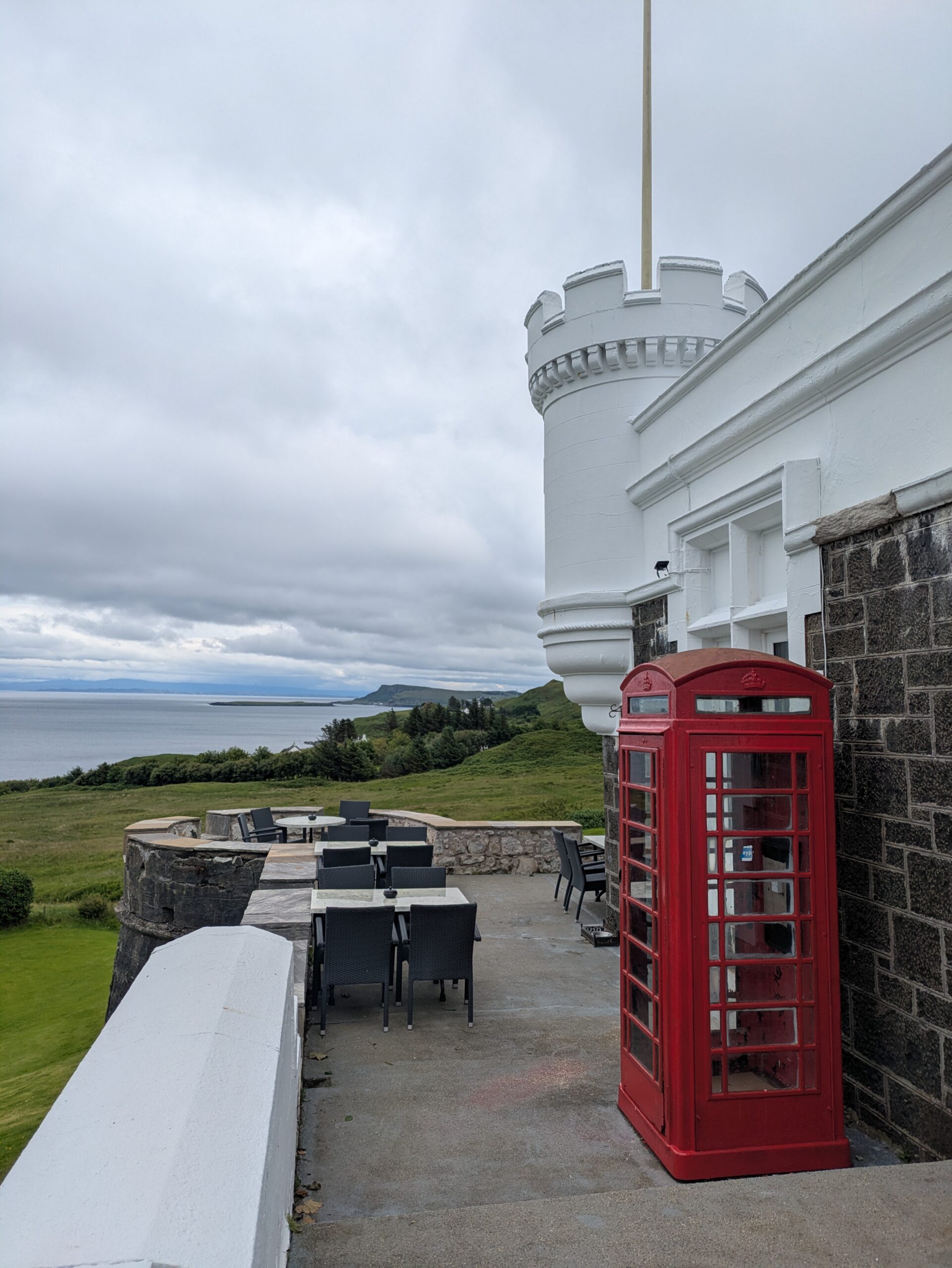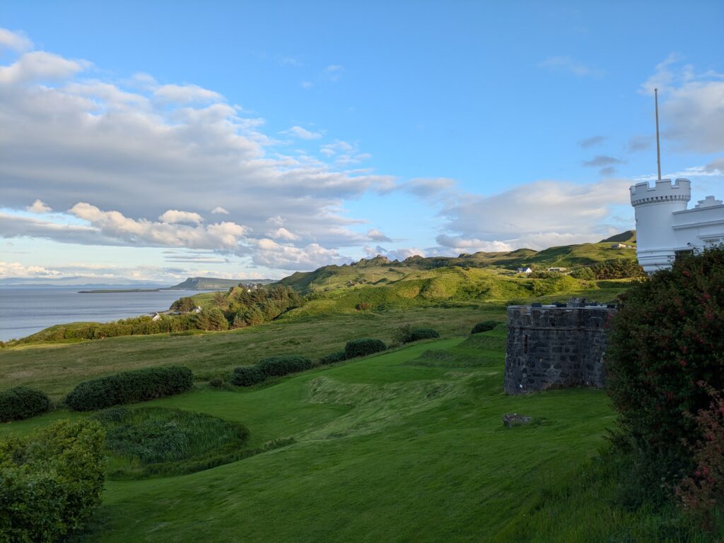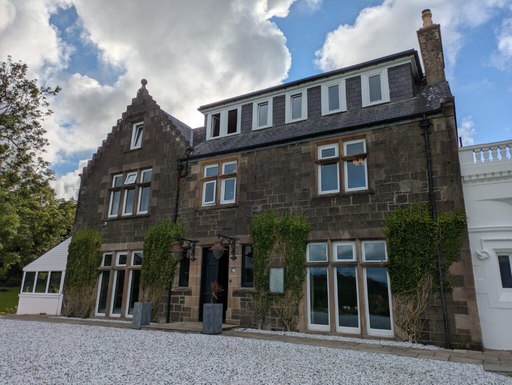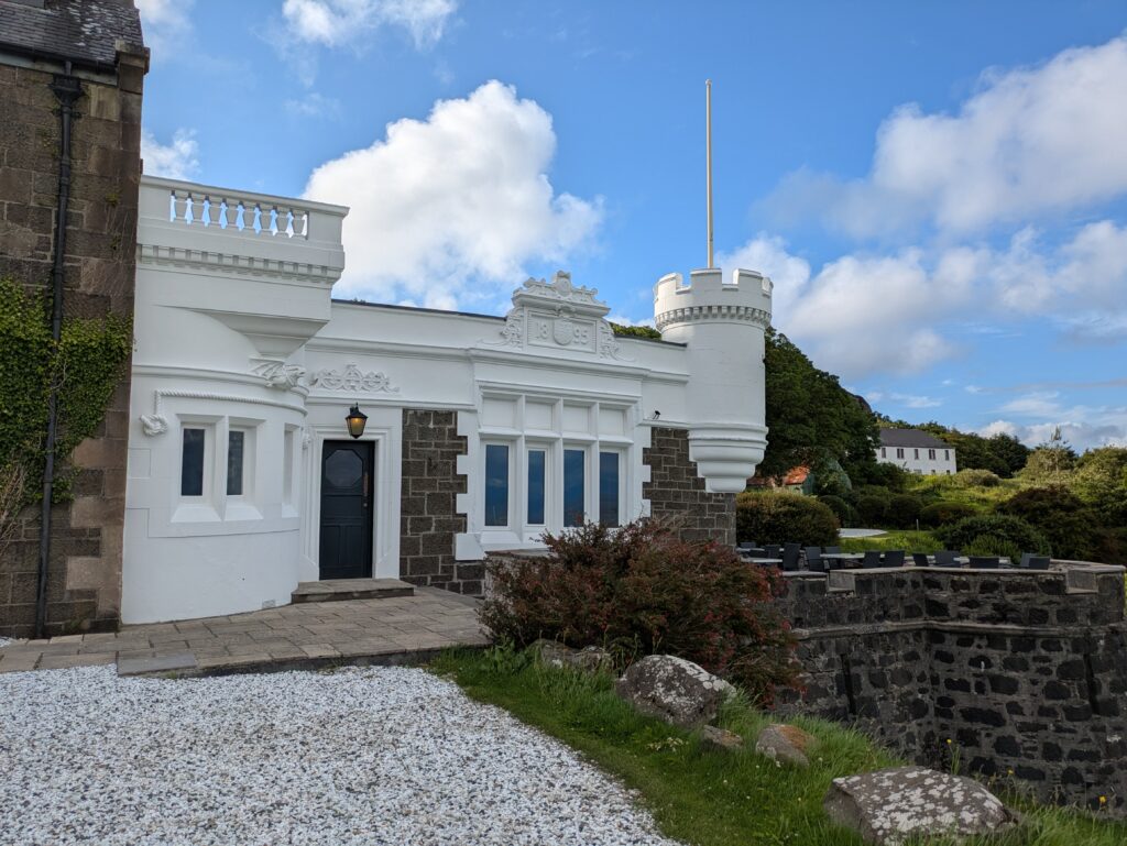 L’hôtel est très stylé, mi-maison, mi-manoir, avec une petite tourelle. On y rencontre deux autres personnes qui font le Skye Trail et profitent aussi du bar pour une pause gourmande avant de continuer pour camper vers des lochs pas loin.