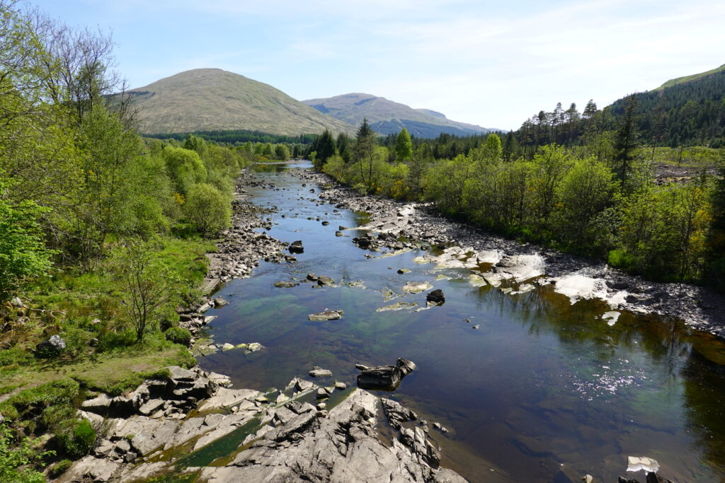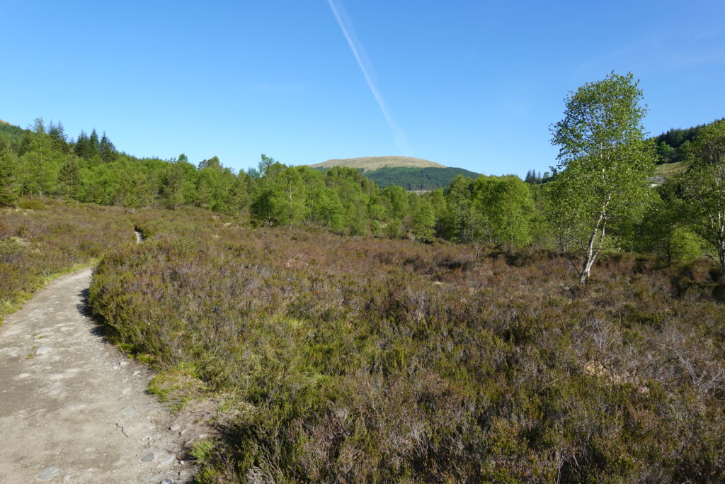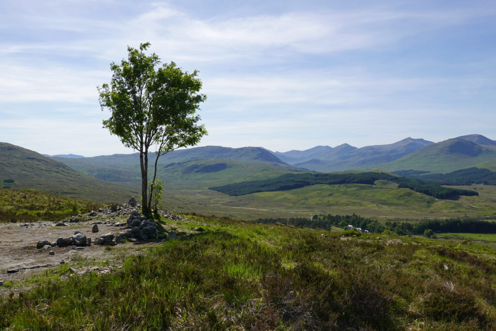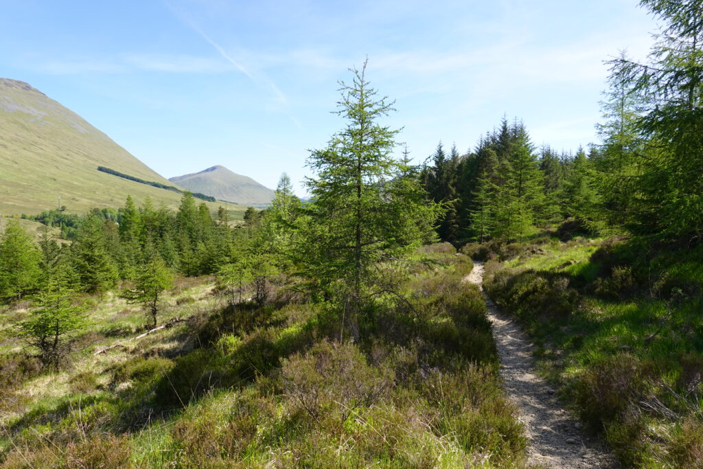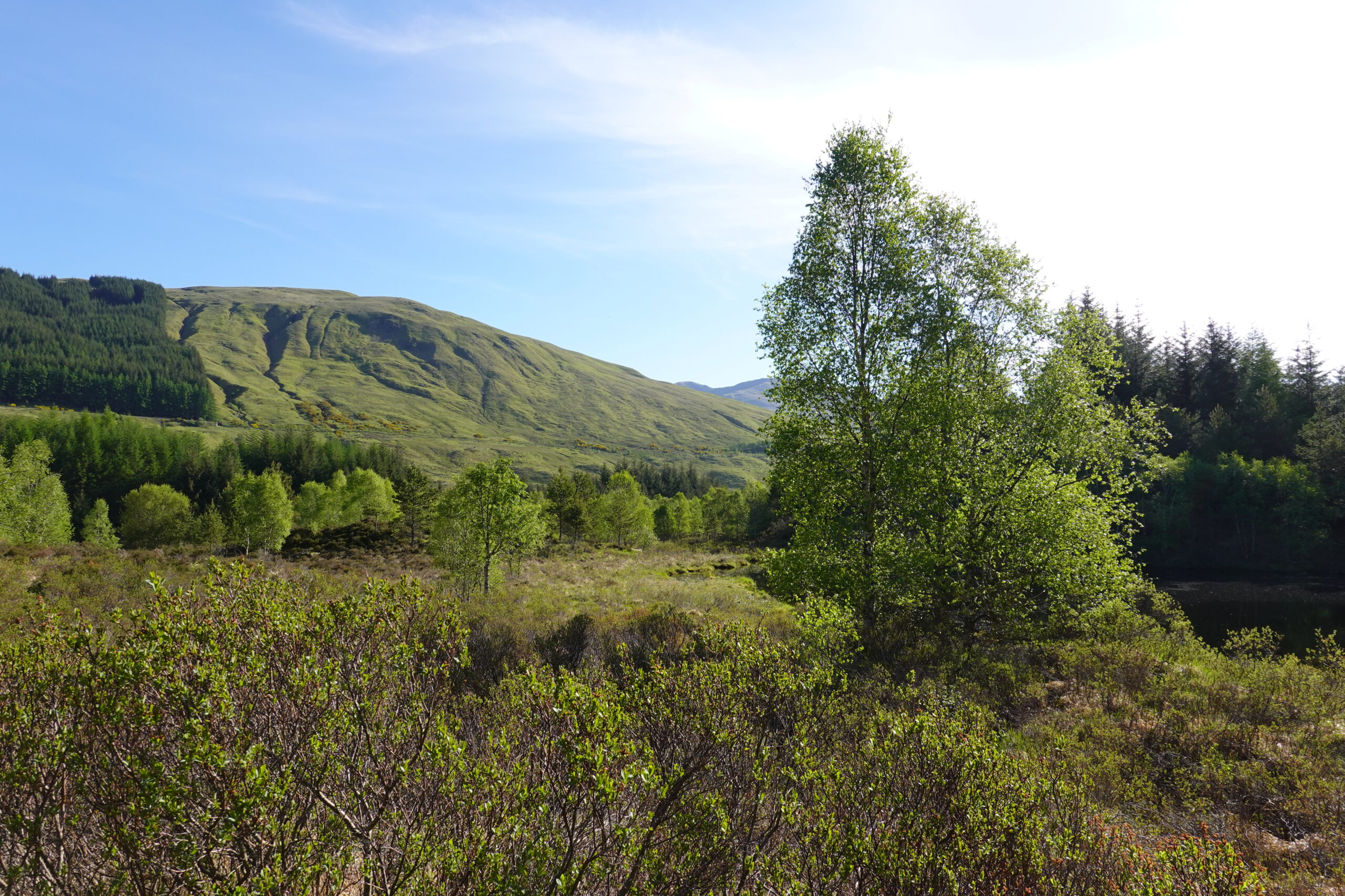 Comme le toponyme l’indique, il y a également un pont, au-dessus de la rivière Orchy. On l’a traversé avant d’attaquer la montée vers Mam Carraigh, une colline s’élevant à 361 m. Le sentier traverse un joli bois, puis une ancienne plantation désolante, entièrement rasée, avant de déboucher sur du moorland.