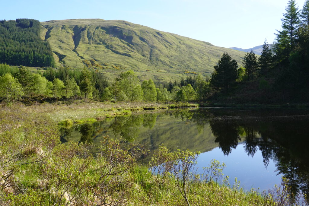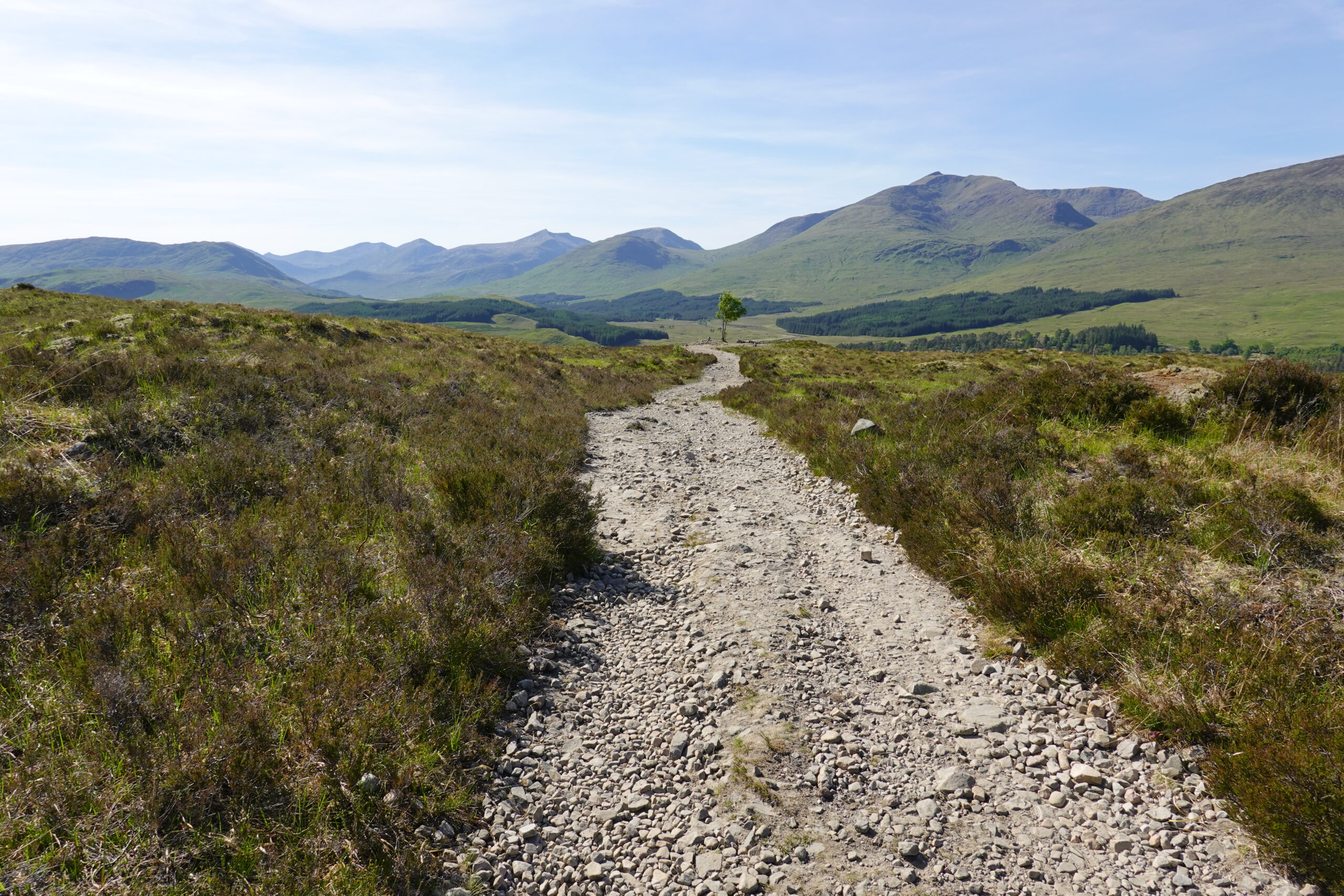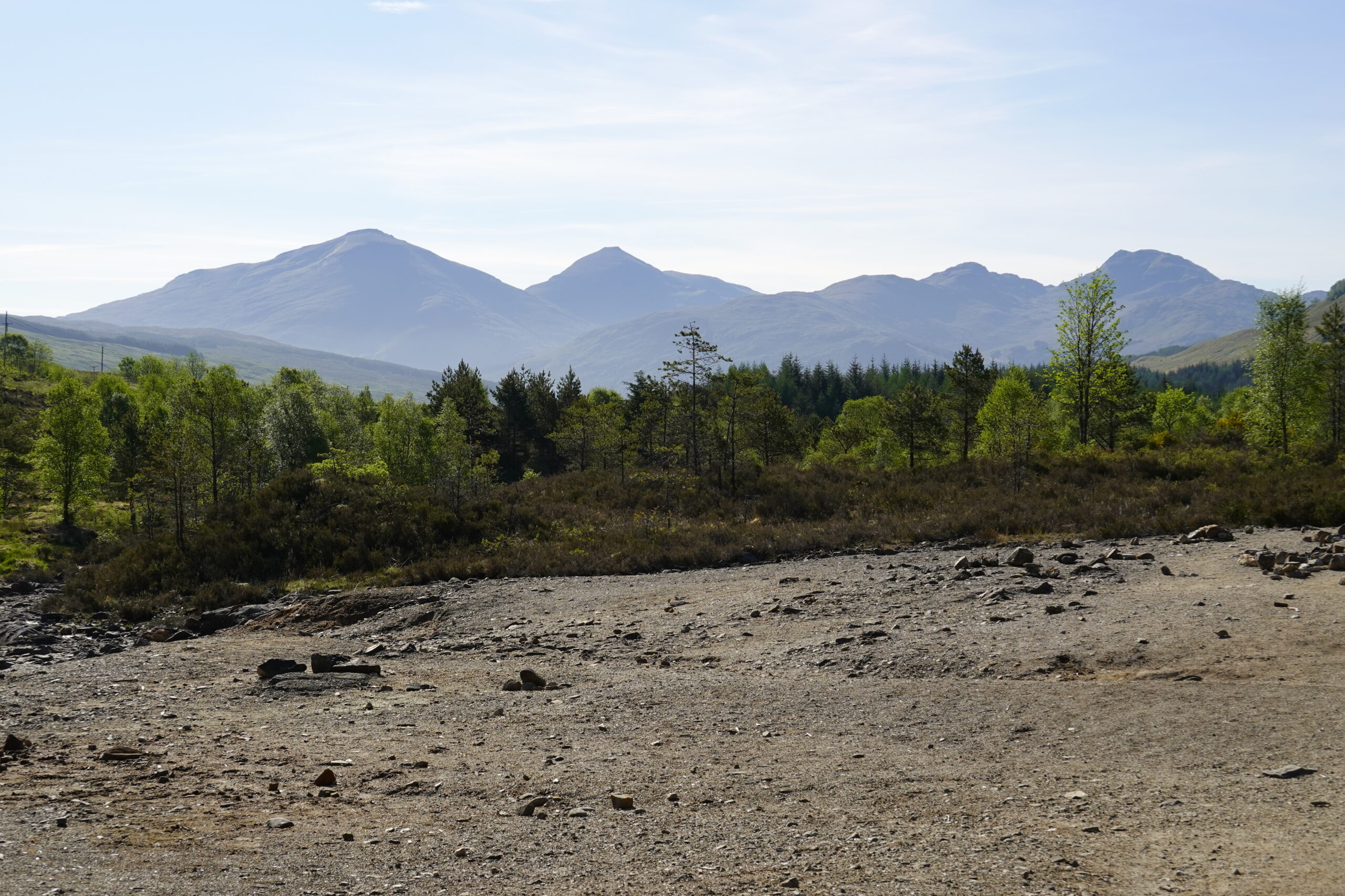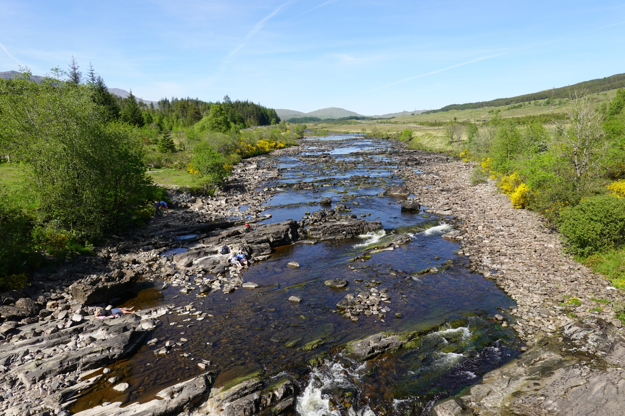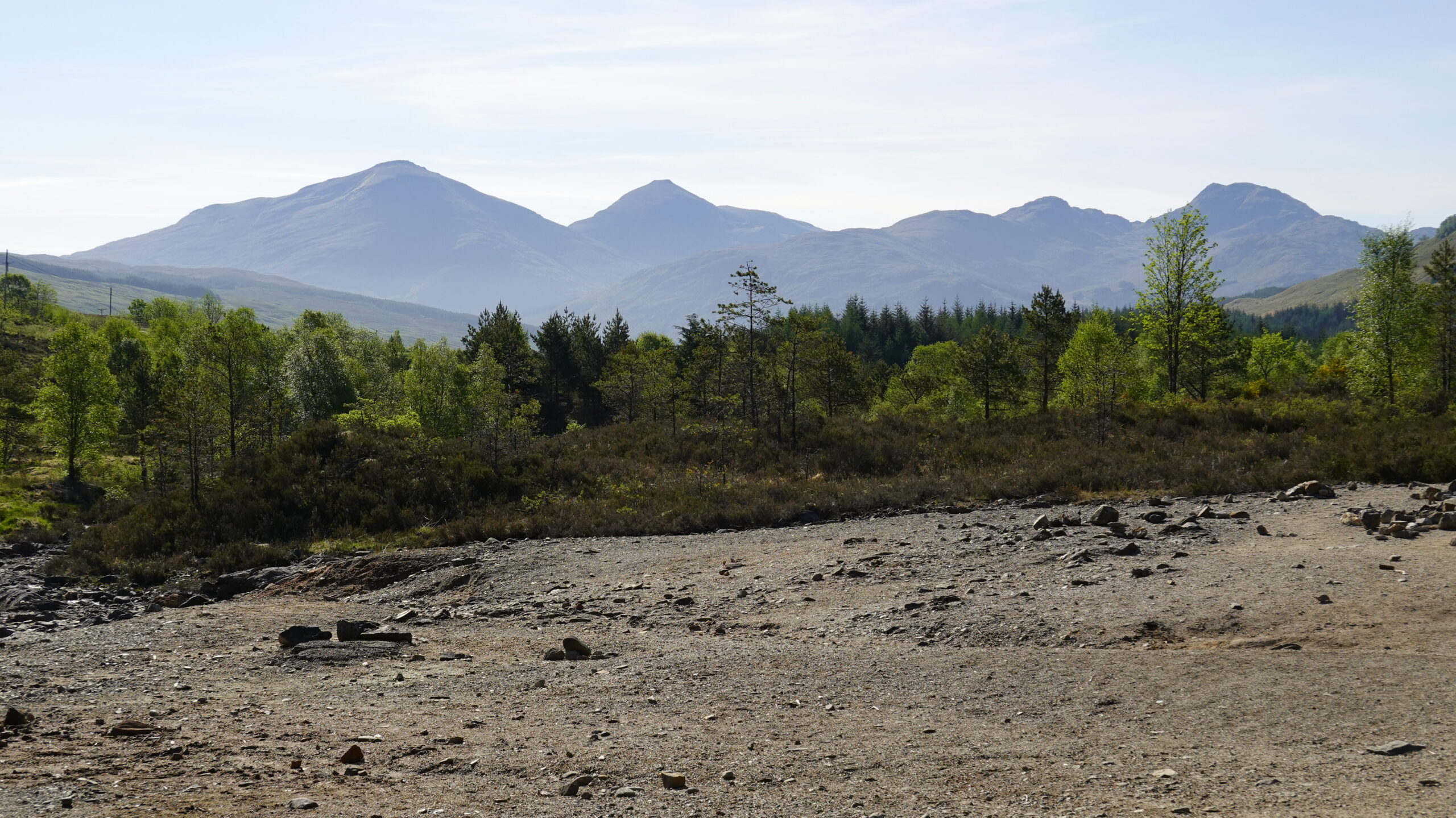 Comme le toponyme l’indique, il y a également un pont, au-dessus de la rivière Orchy. On l’a traversé avant d’attaquer la montée vers Mam Carraigh, une colline s’élevant à 361 m. Le sentier traverse un joli bois, puis une ancienne plantation désolante, entièrement rasée, avant de déboucher sur du moorland.