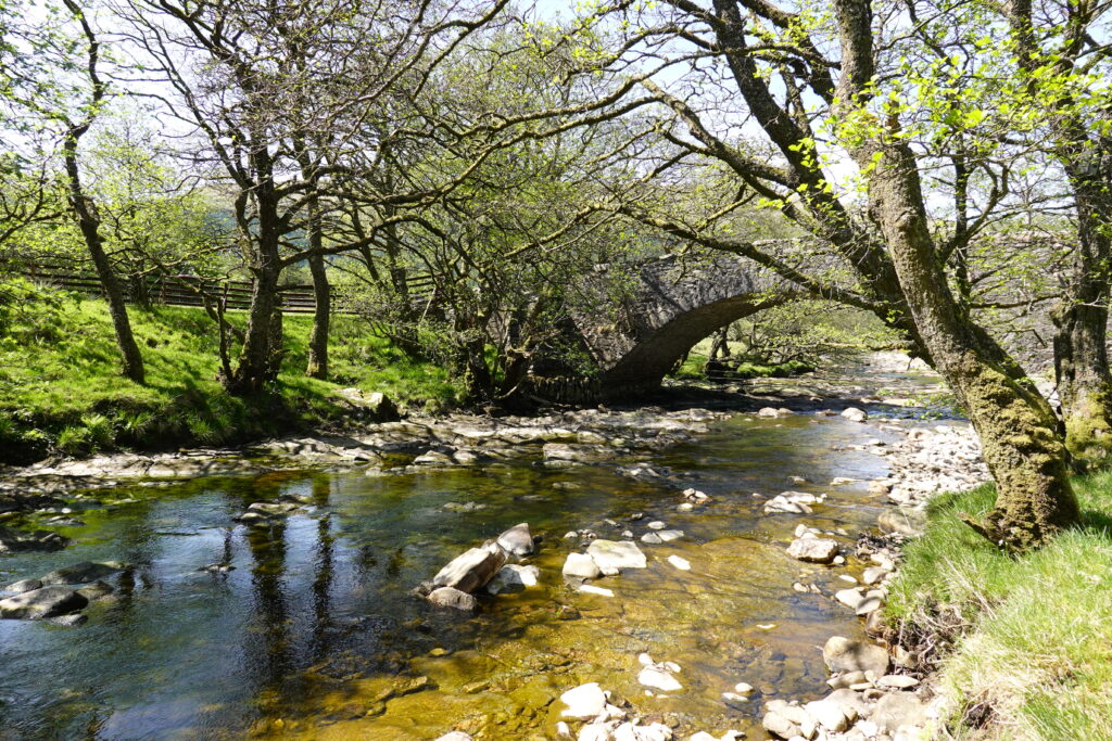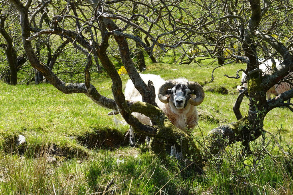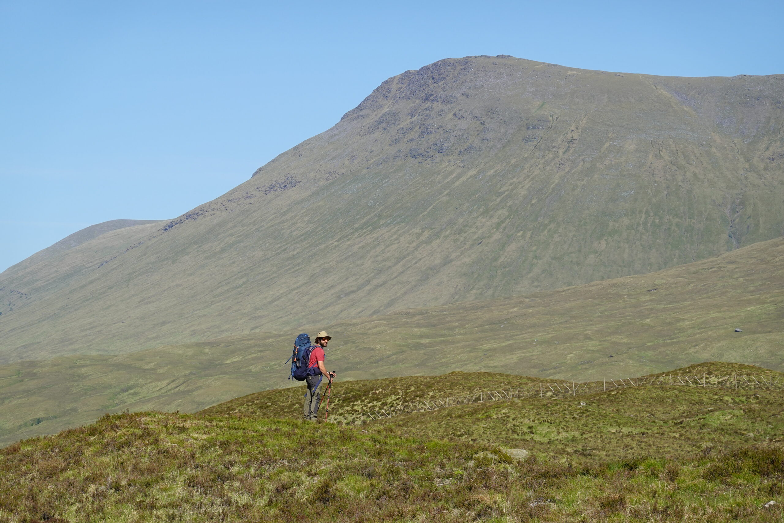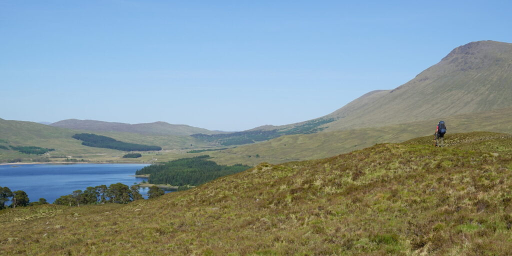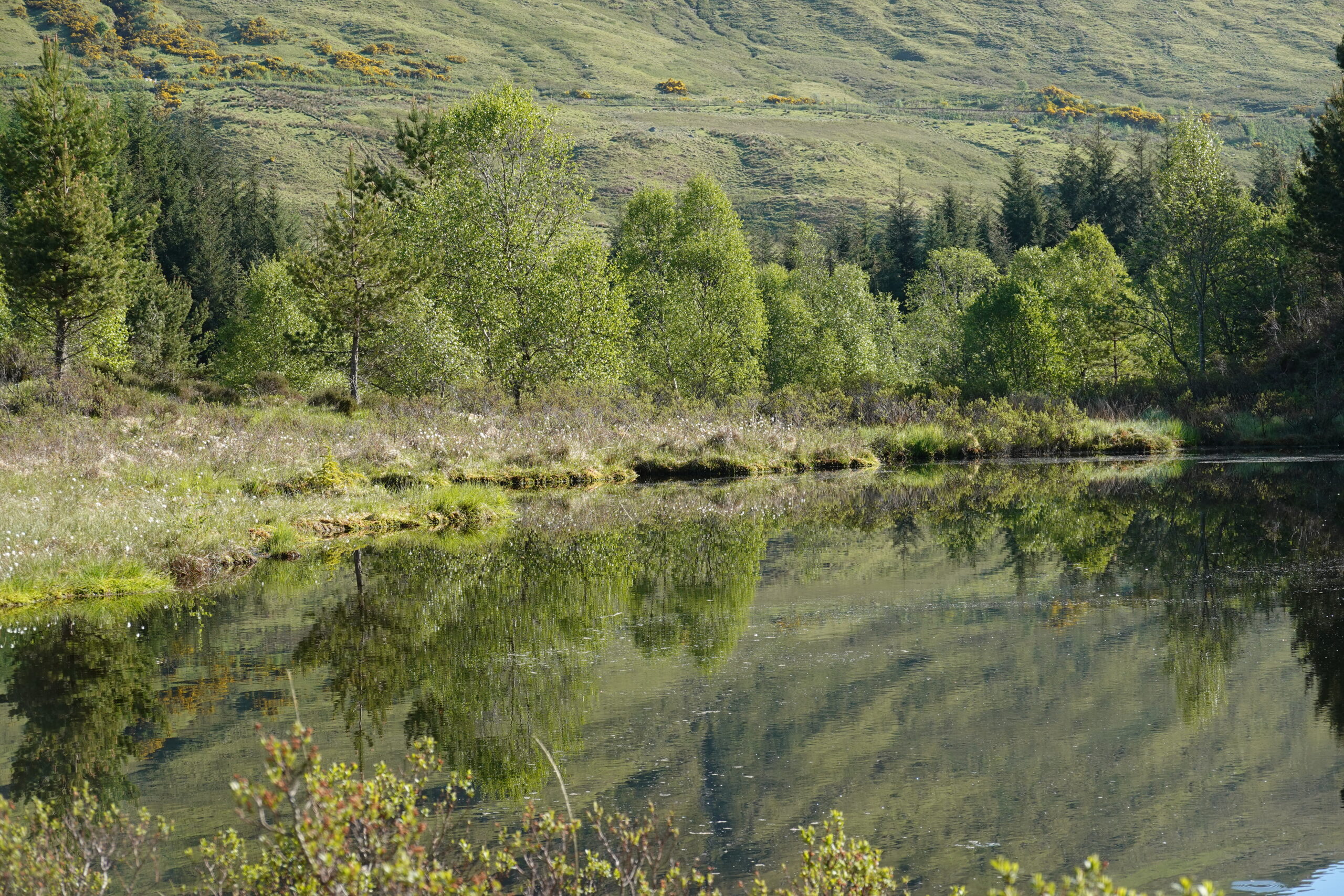 Comme le toponyme l’indique, il y a également un pont, au-dessus de la rivière Orchy. On l’a traversé avant d’attaquer la montée vers Mam Carraigh, une colline s’élevant à 361 m. Le sentier traverse un joli bois, puis une ancienne plantation désolante, entièrement rasée, avant de déboucher sur du moorland.