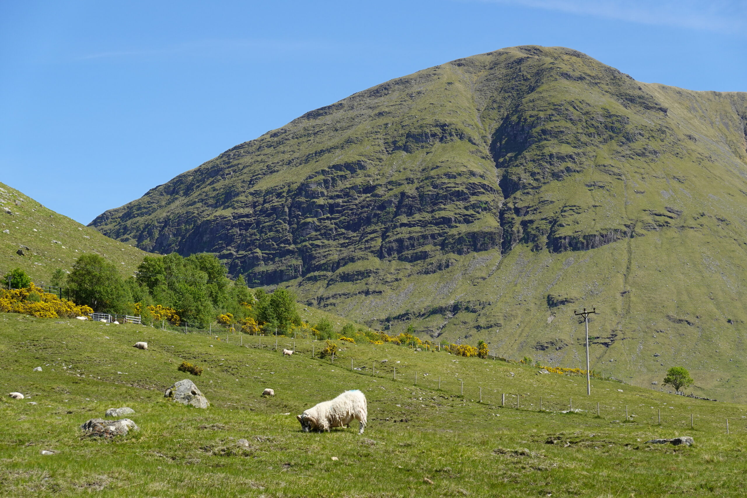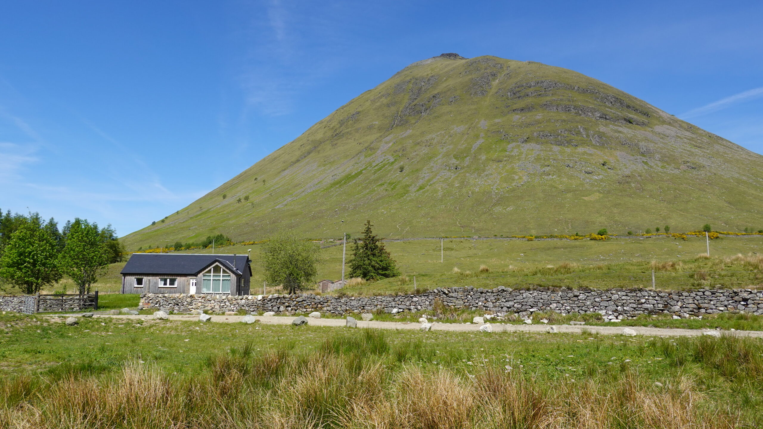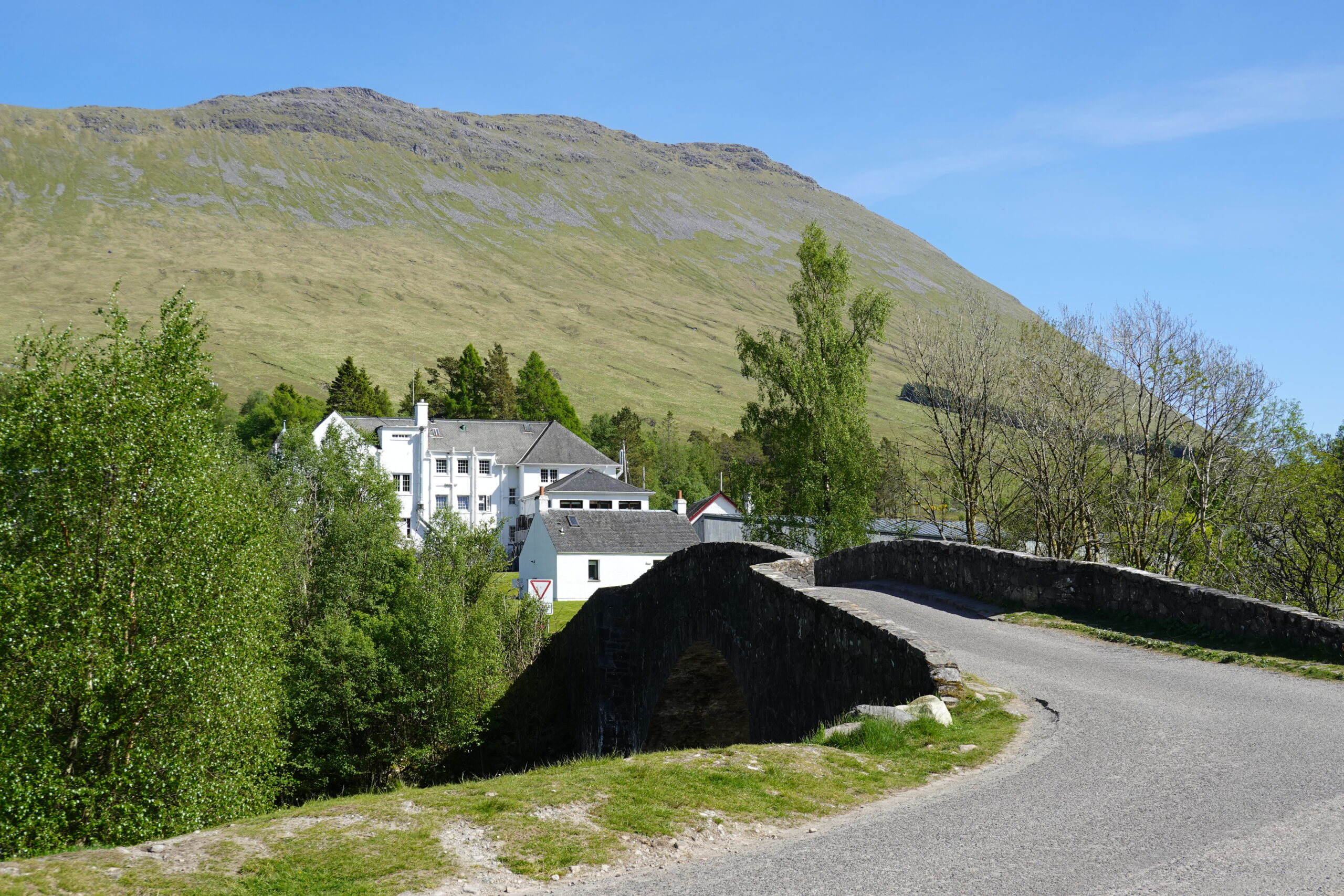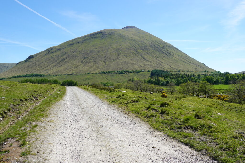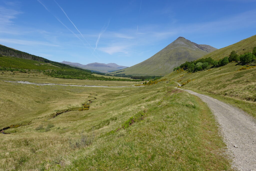Face à nous se dresse Beinn Dorain, imposant. Puis on arrive au Auch Estate et à un joli pont de pierre au-dessus d’Allt Kinglass (vous l’aurez compris, “allt” désigne un cours d’eau en gaélique écossais).