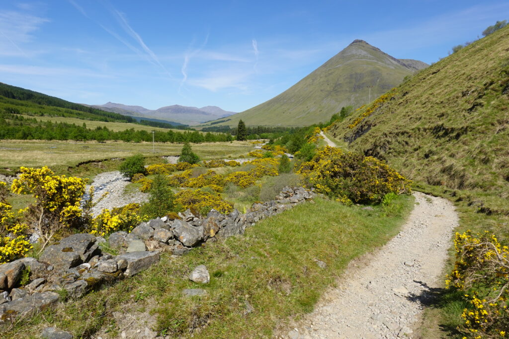 Puis on attaque la section du jour. On suit un moment les rails de train et la route, ainsi que la petite rivière Crom Allt. Le tracé alterne entre petit sentier caillouteux et large track, c’est plutôt agréable. On est entourés de montagnes et ça sent les ajoncs (= la noix de coco).