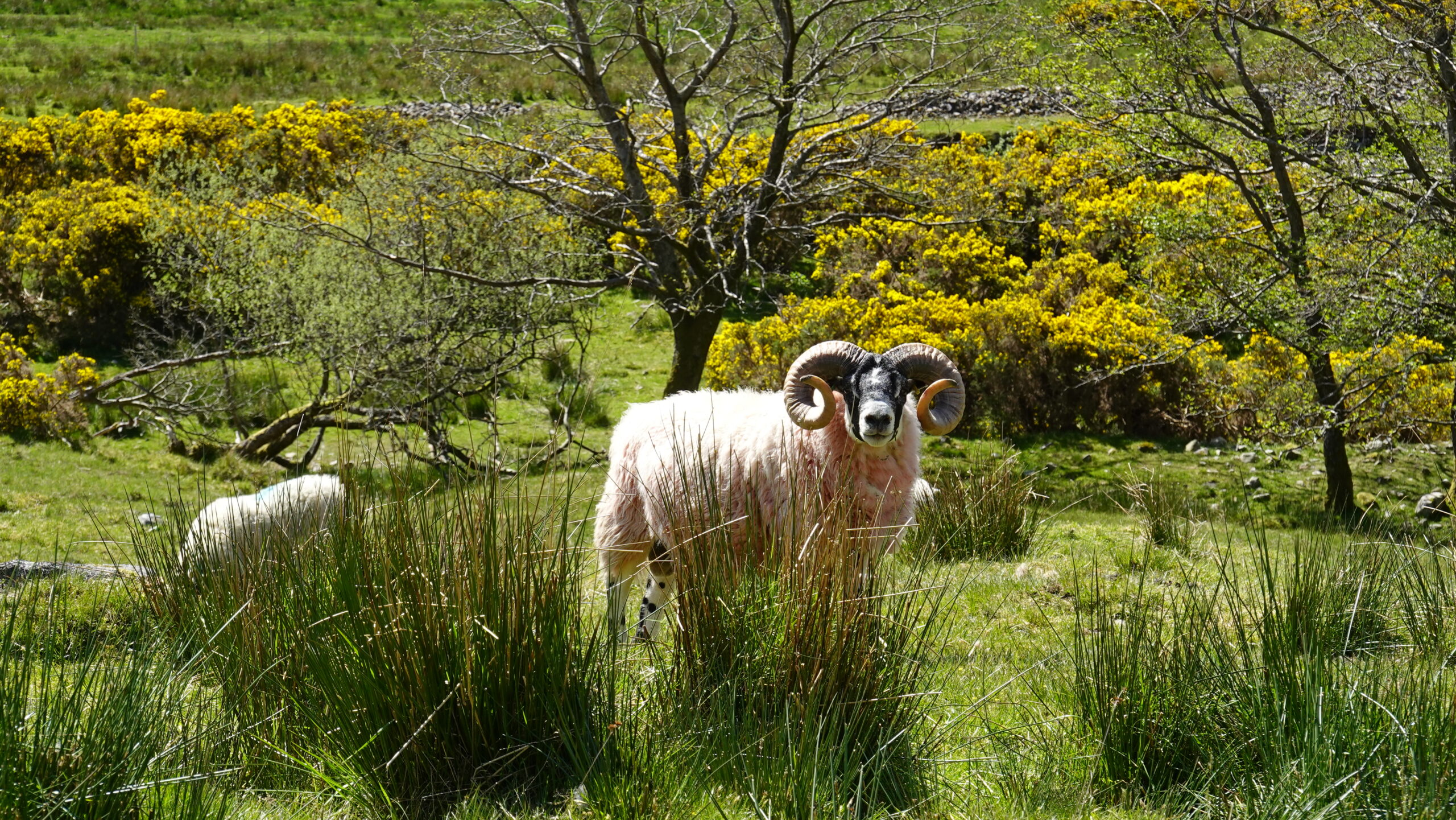 On croise des moutons aux cornes impressionnantes (sur certains individus, on se dit qu’elles doivent carrément entraver le champ de vision!), des agneaux pas farouches, des corneilles mantelées et, une première pour ce séjour, des libellules à quatre taches!