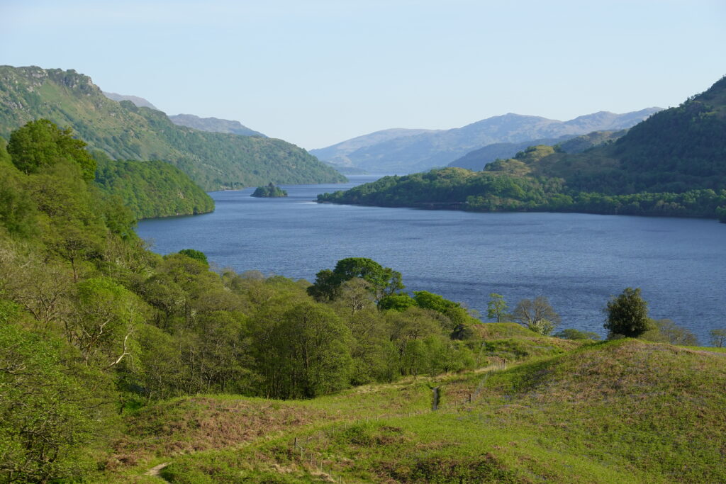 On prend un peu de hauteur et les vues sont splendides. Face à nous, les montagnes se rapprochent. Dans notre dos, le loch continue de scintiller au soleil.