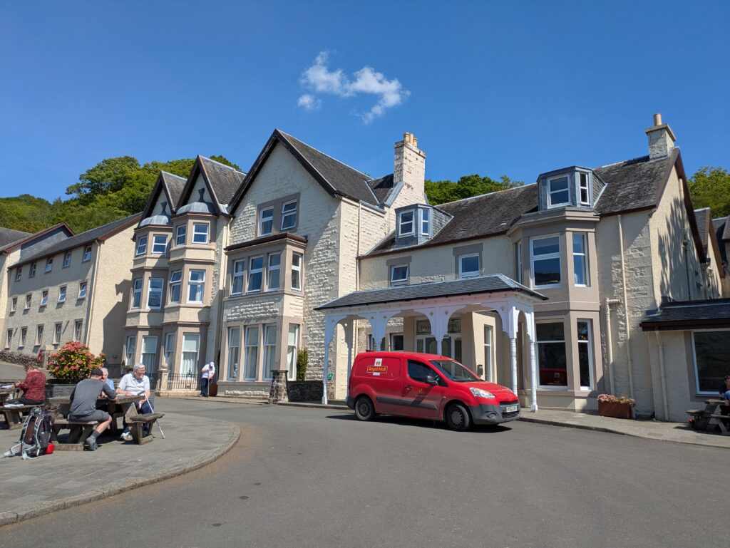 Elle est à côté d’Inversnaid Hotel, où on s’offre une pause lunch bien méritée, avec soupe et sandwiches. C’est un hôtel un peu paumé, et le seul établissement sur cette rive du loch au nord de Rowardennan. Les chaussures de marche (et les sacs à dos) sont interdites dans le bar, au sol couvert de moquette, donc tout le monde se balade en chaussettes, c’est assez comique.