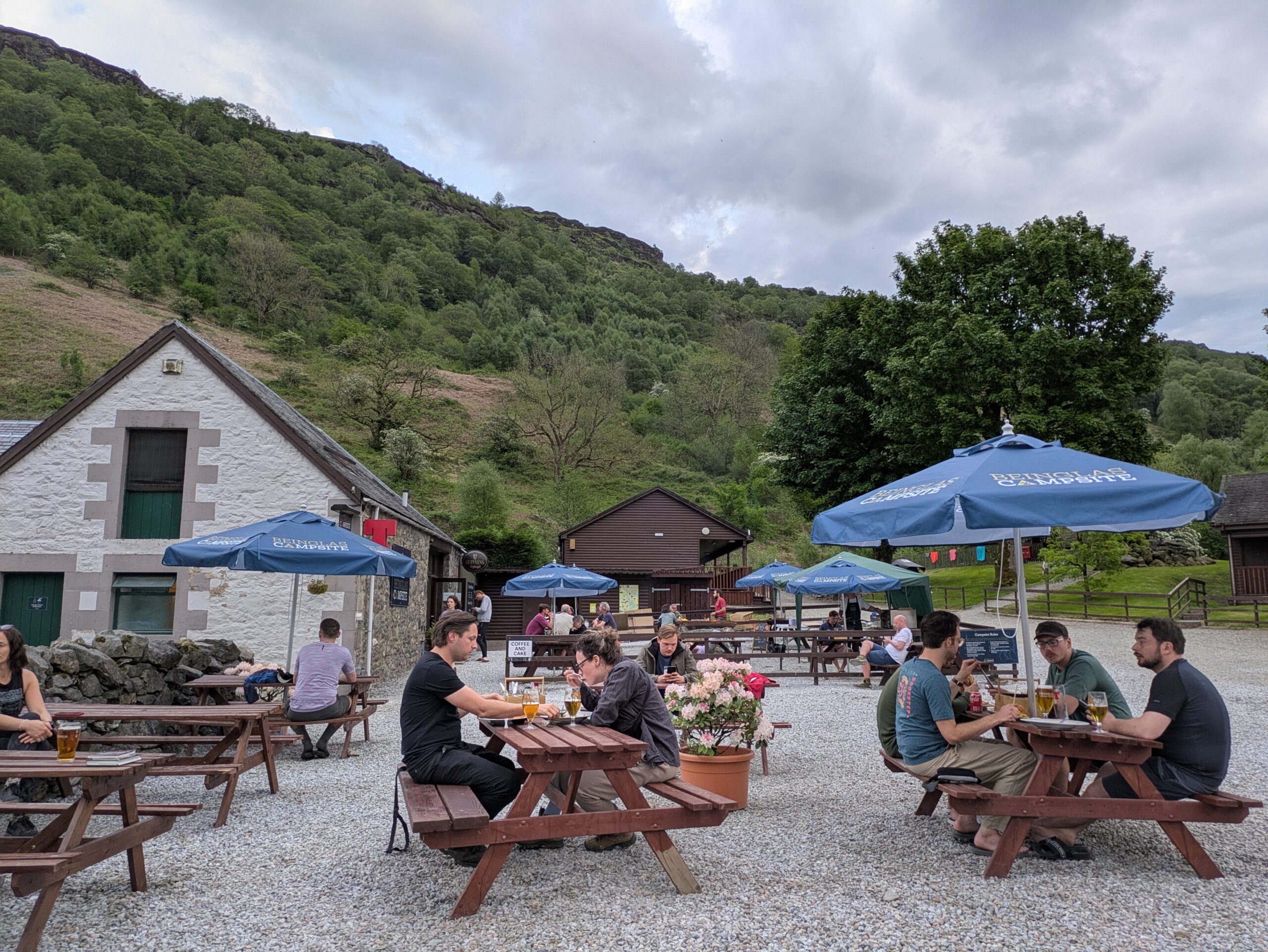 Elle est à côté d’Inversnaid Hotel, où on s’offre une pause lunch bien méritée, avec soupe et sandwiches. C’est un hôtel un peu paumé, et le seul établissement sur cette rive du loch au nord de Rowardennan. Les chaussures de marche (et les sacs à dos) sont interdites dans le bar, au sol couvert de moquette, donc tout le monde se balade en chaussettes, c’est assez comique.