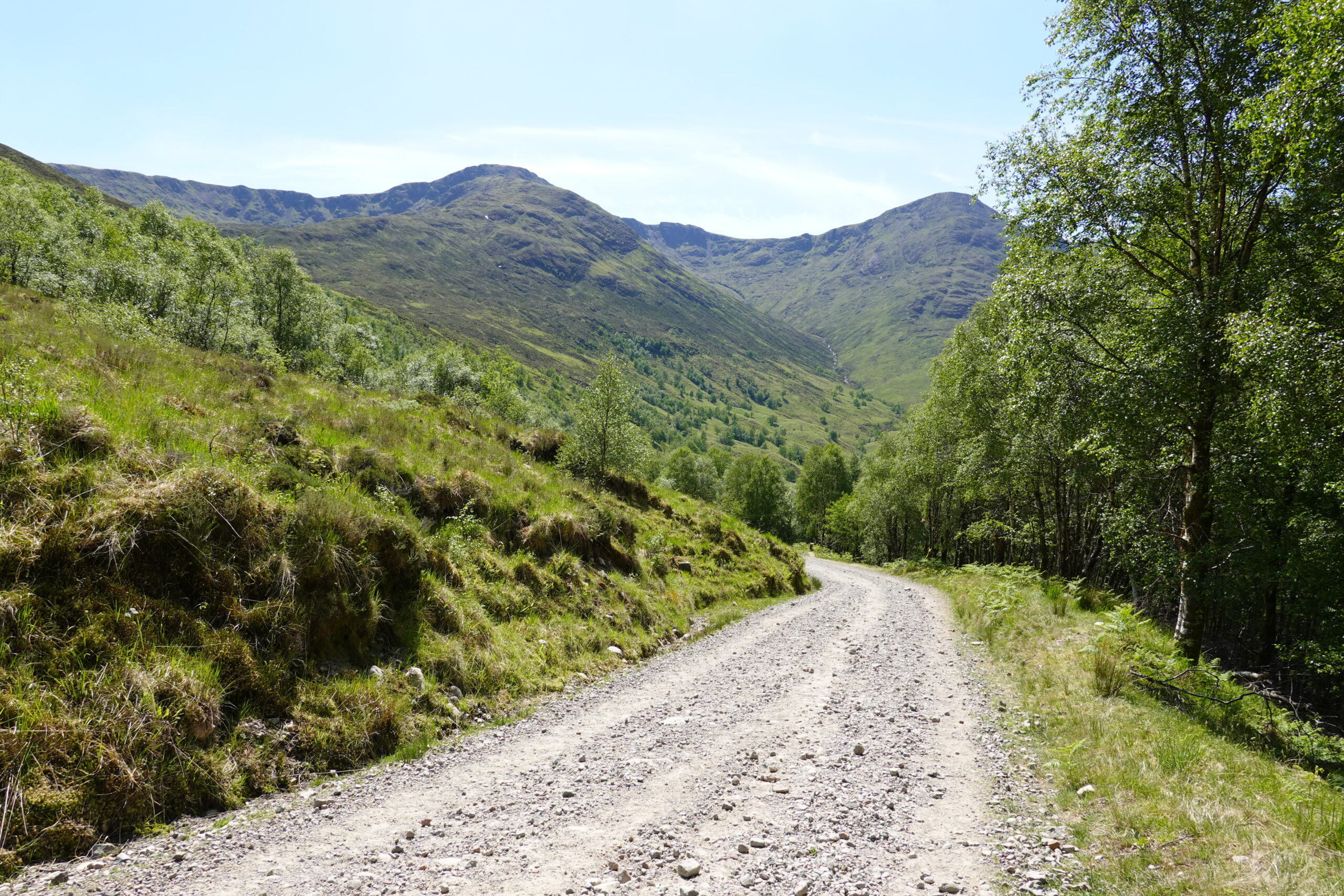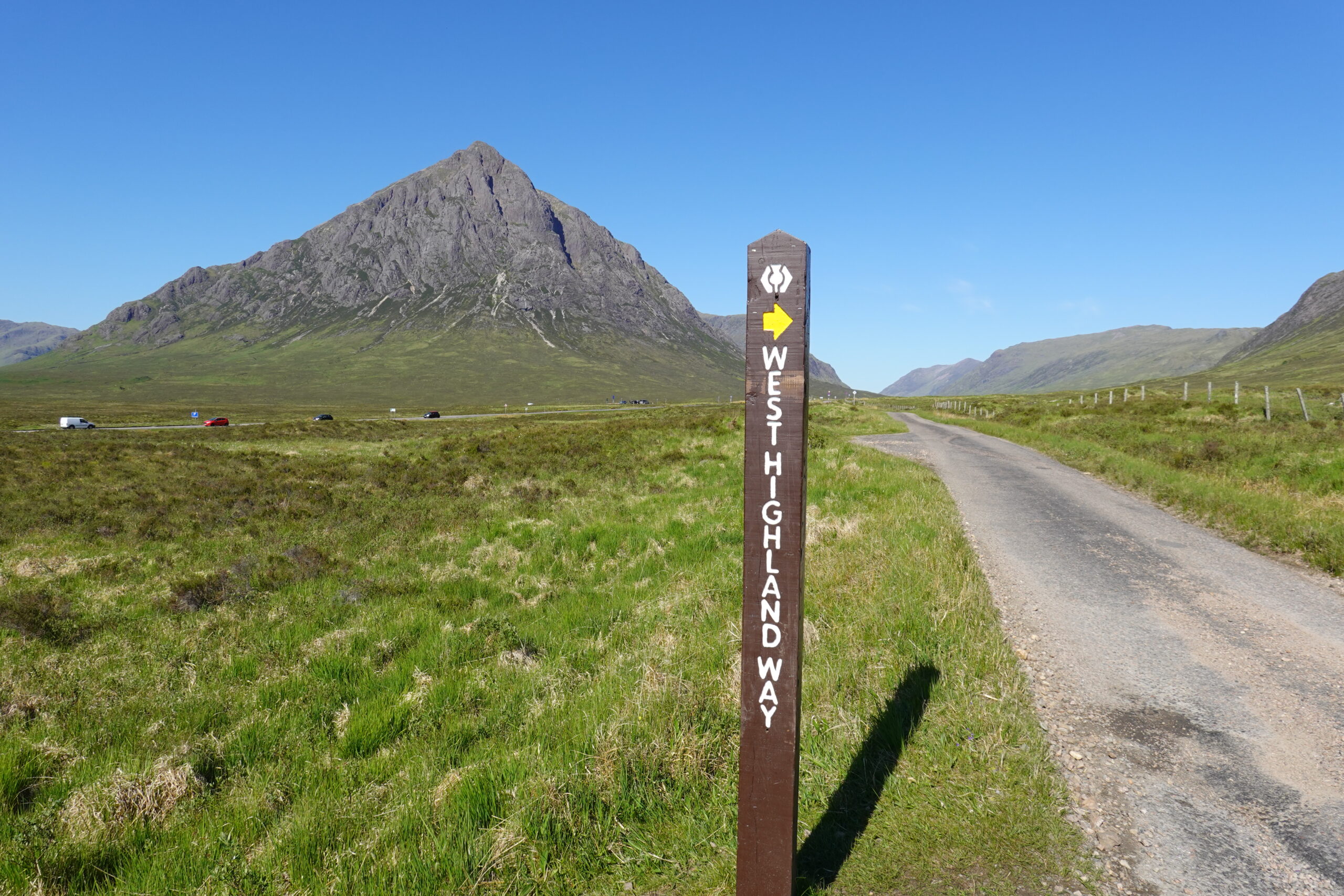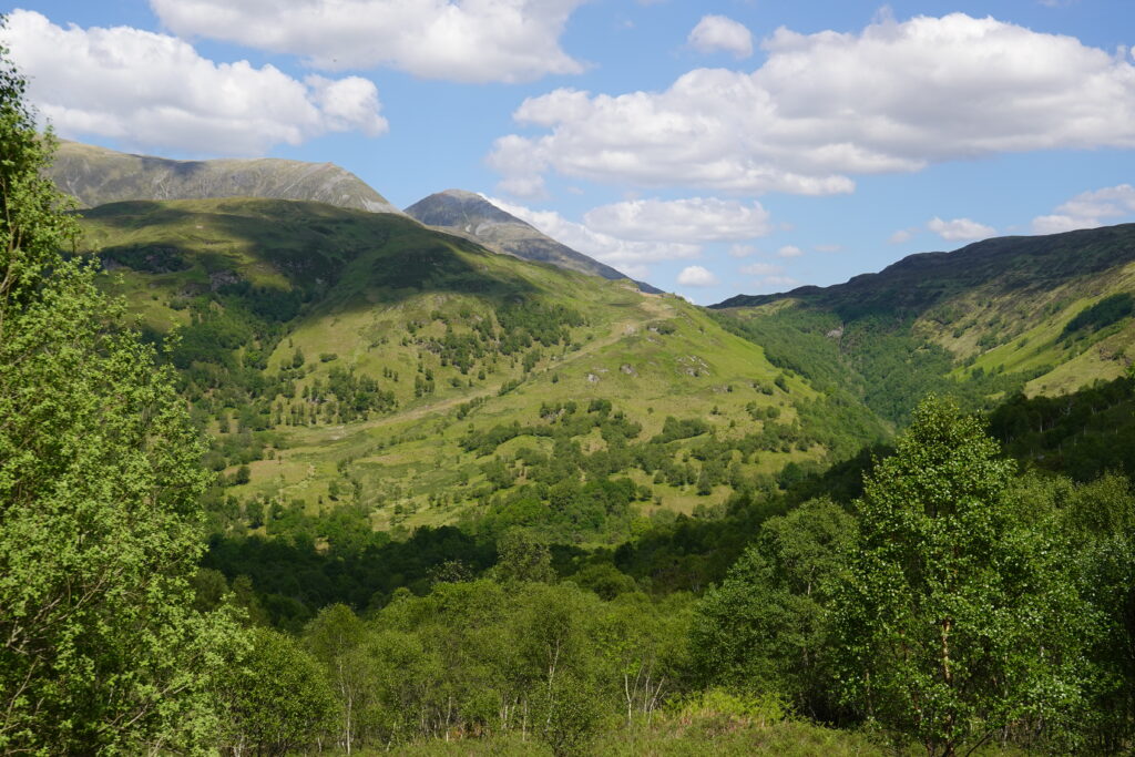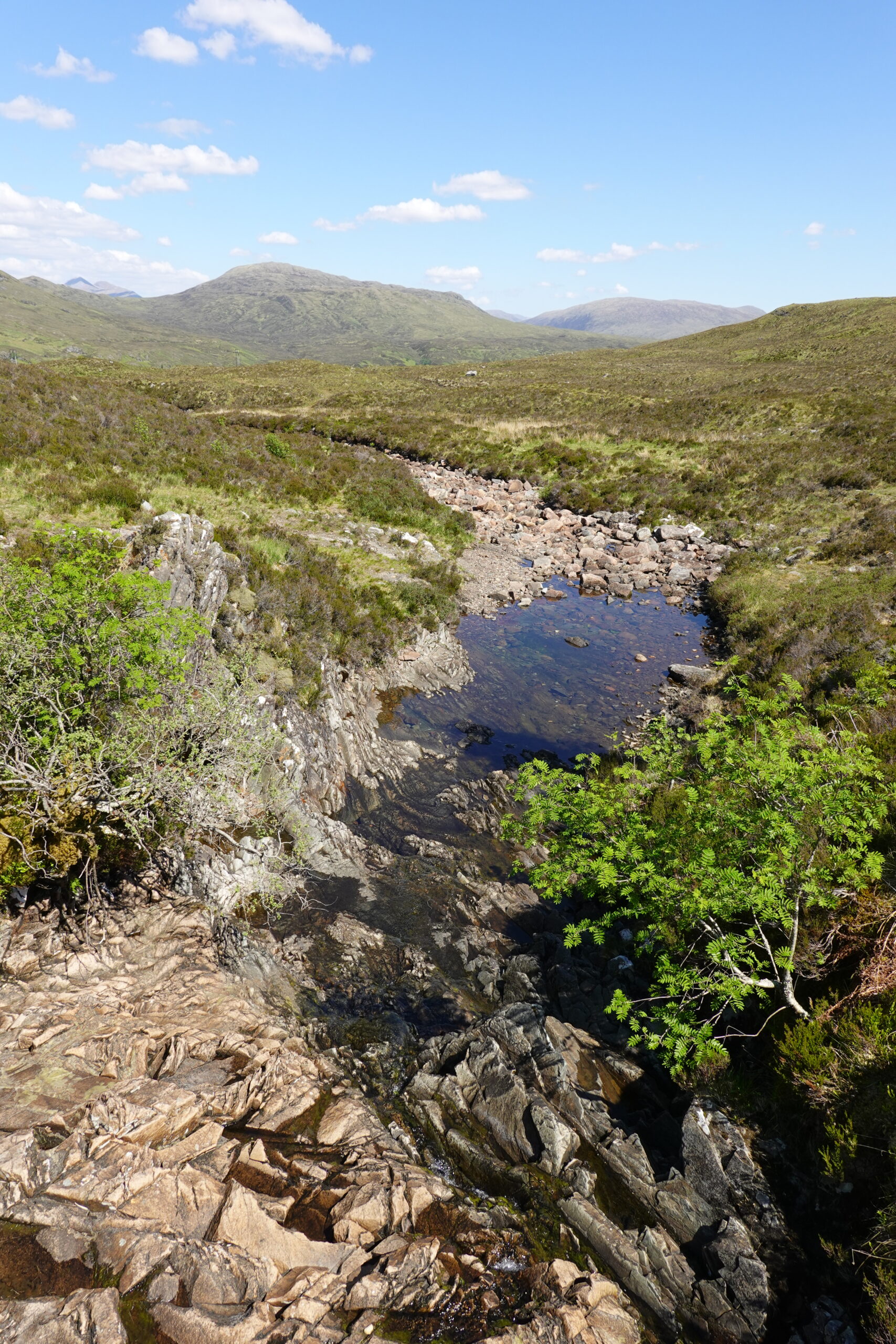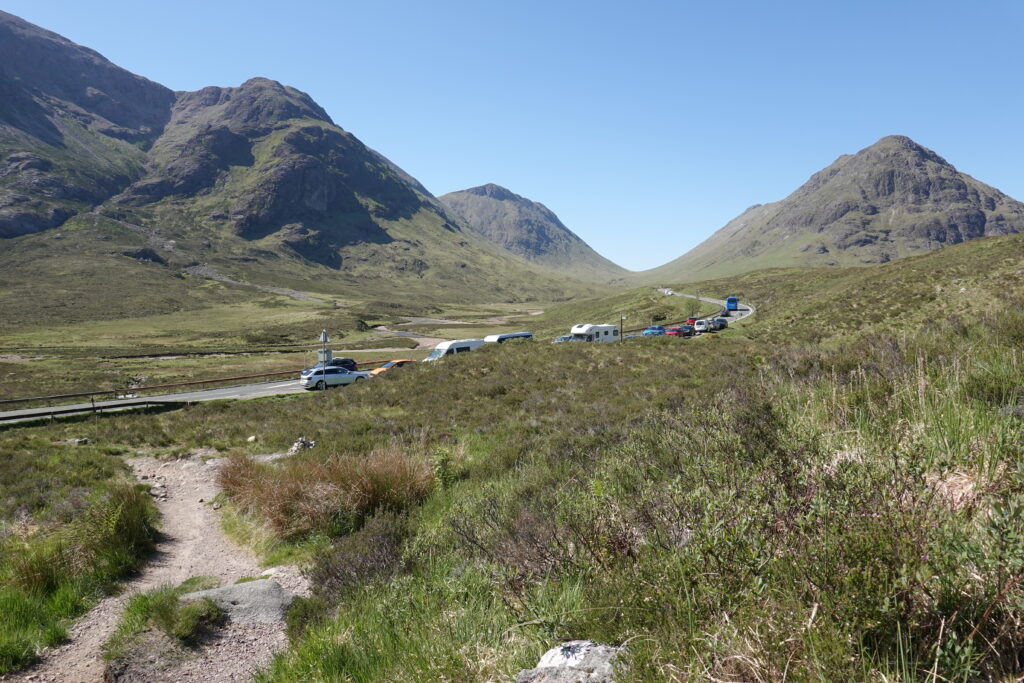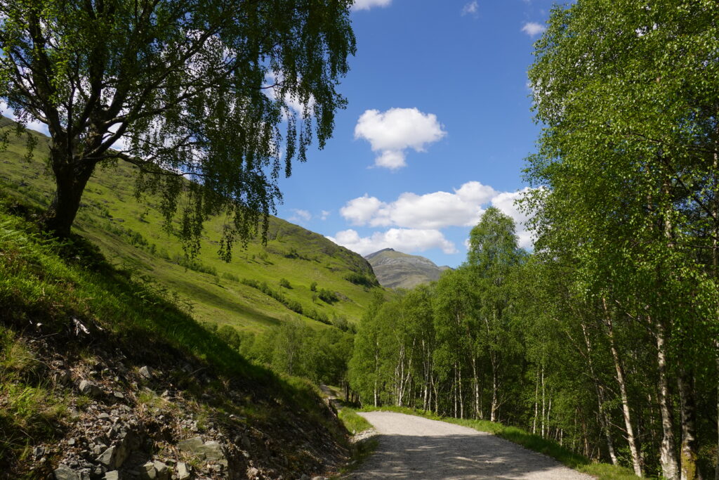 On a très bien dormi dans le campement informel de Kingshouse et on a même pu prendre un super petit-déj’ au bar (Full Scottish + Continental, à volonté, pour seulement 10£!). Puis on plie la tente et on part sur le chemin, qui longe un petit moment l’A82, très, très fréquentée en ce samedi ensoleillé.