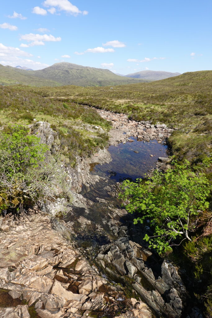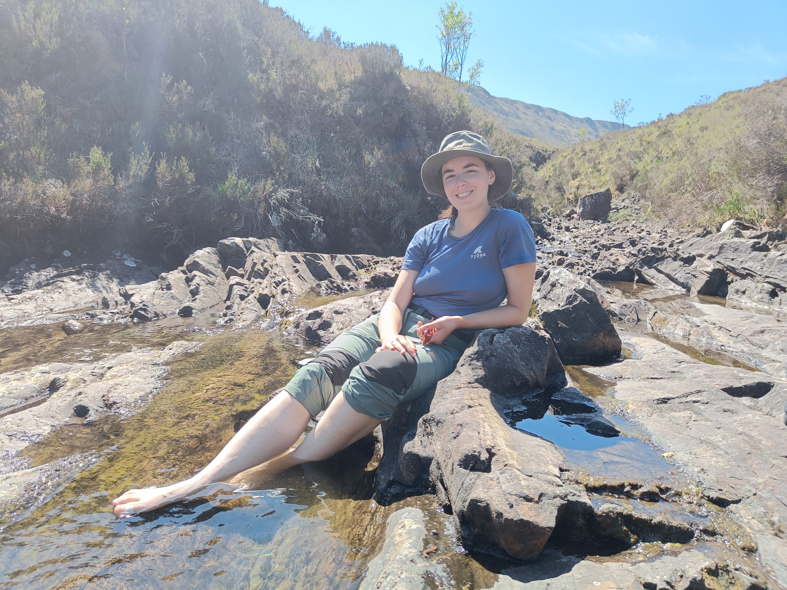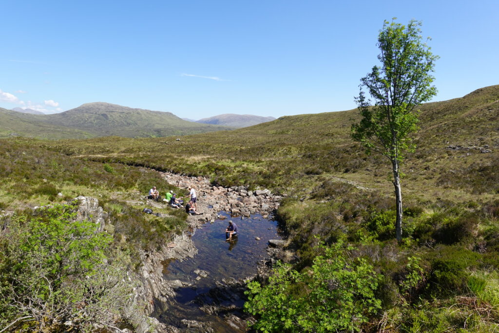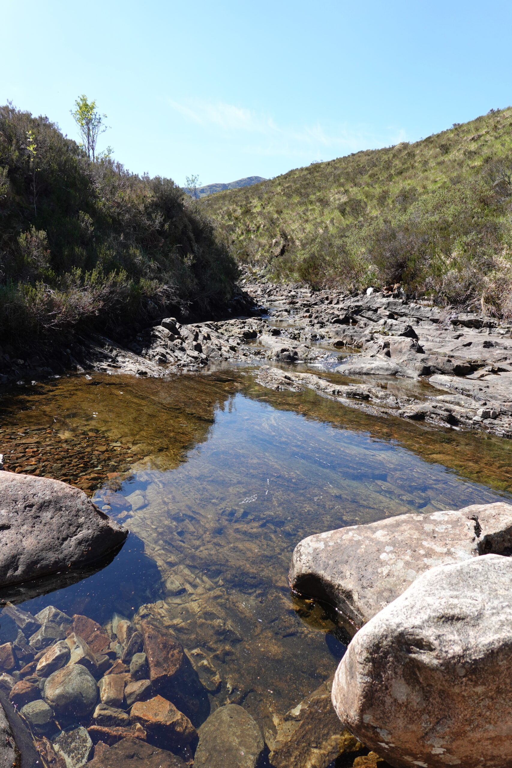 On a fait une pause pour tremper nos pieds dans la rivière Allt a’ Choire Odhair-mhòir et on a observé des larves d’invertébrés bouger dans l’eau, héhé. Il en faut vraiment peu pour être heureux! 😉
