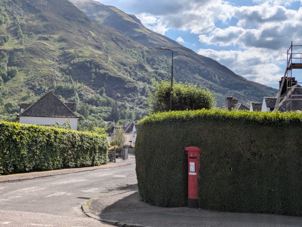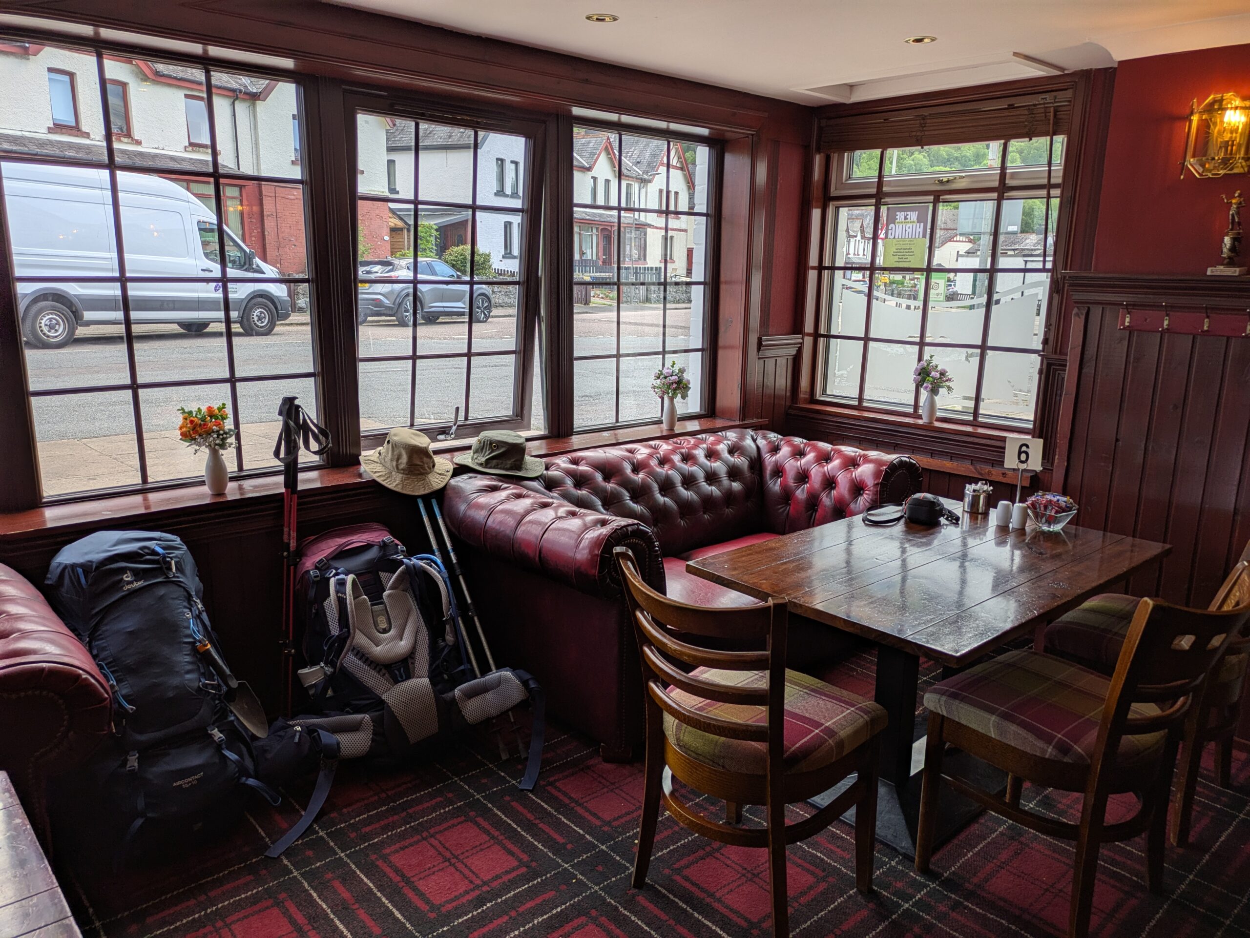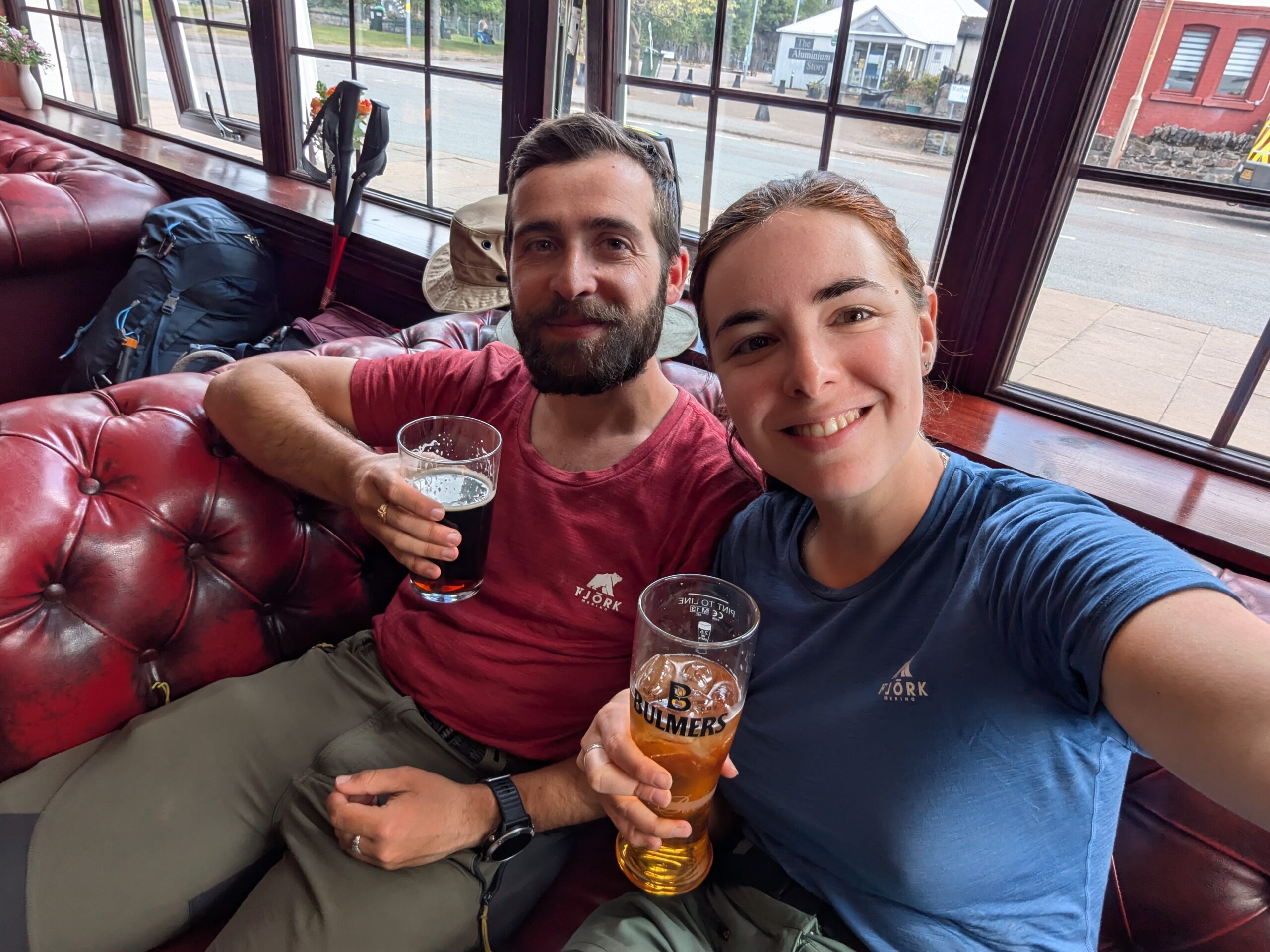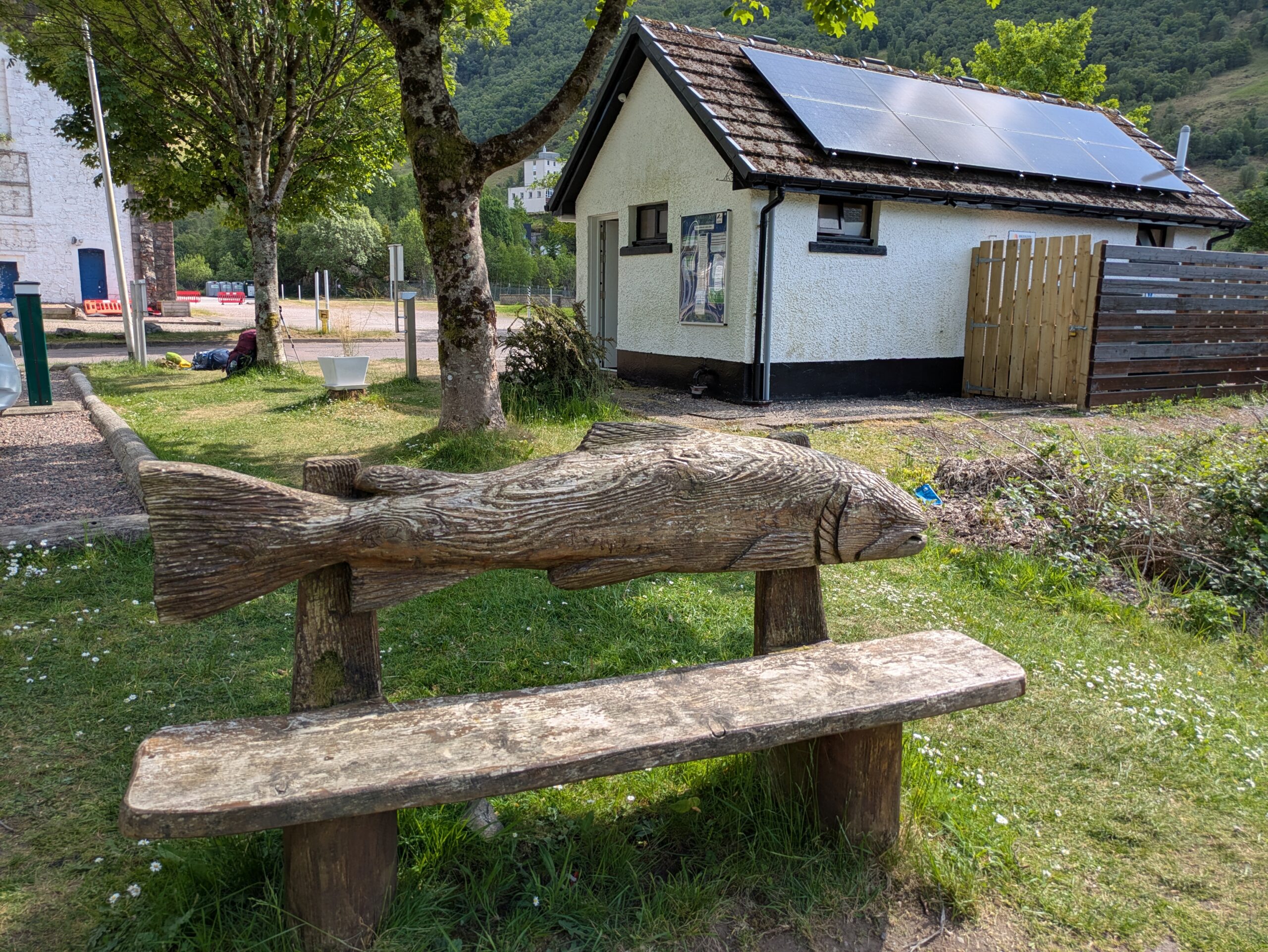 On arrive à 15h à Kinlochleven, en passant devant sa grosse station hydro-électrique. On voulait visiter une épicerie recommandée par une amie, mais celle-ci était malheureusement déjà fermée, malgré l’heure de fermeture de 17h annoncée sur Maps. On commençait à avoir l’habitude de ne pas pouvoir faire confiance aux horaires, qui étaient souvent restreints à cause du manque de main d’oeuvre — il y avait d’ailleurs plein d’annonces de jobs partout, dans les fenêtres des magasins, des hôtels… A la place, on s’est donc posés dans un pub pour un verre et une part de cake, yum!