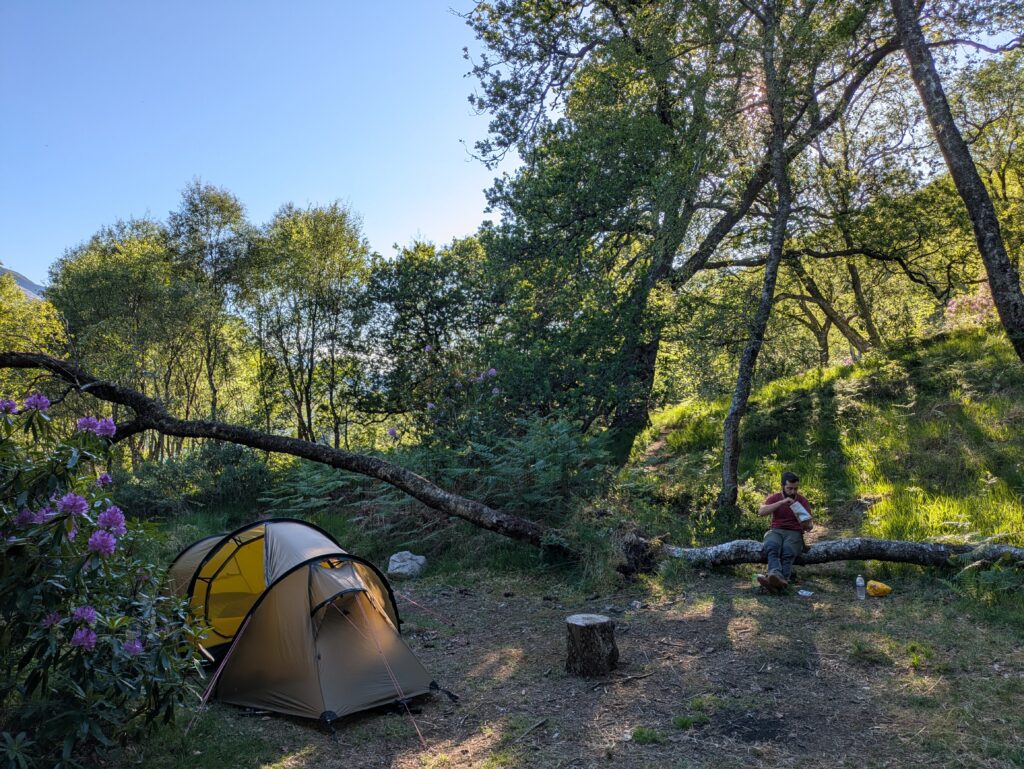 On a mangé deux plats lyophilisés, assis sur un arbre tombé (lors d’une récente tempête?), en admirant la lumière filtrant à travers la forêt. Puis on a passé une soirée habituelle dans la tente: tick check, écriture, lecture! Et grâce au carnet dans lequel j’ai diligemment écrit tous les soirs, je peux d’ailleurs ajouter des détails ultra importants: ce jour-là, on a vu un grand corbeau ainsi qu’une bataille aérienne entre un héron et un goéland. Et, vers 21h30, on a entendu un hélico voler super près, ça faisait trembler le sol! On a appris le lendemain qu’il était venu chercher un cycliste qui s’était blessé.