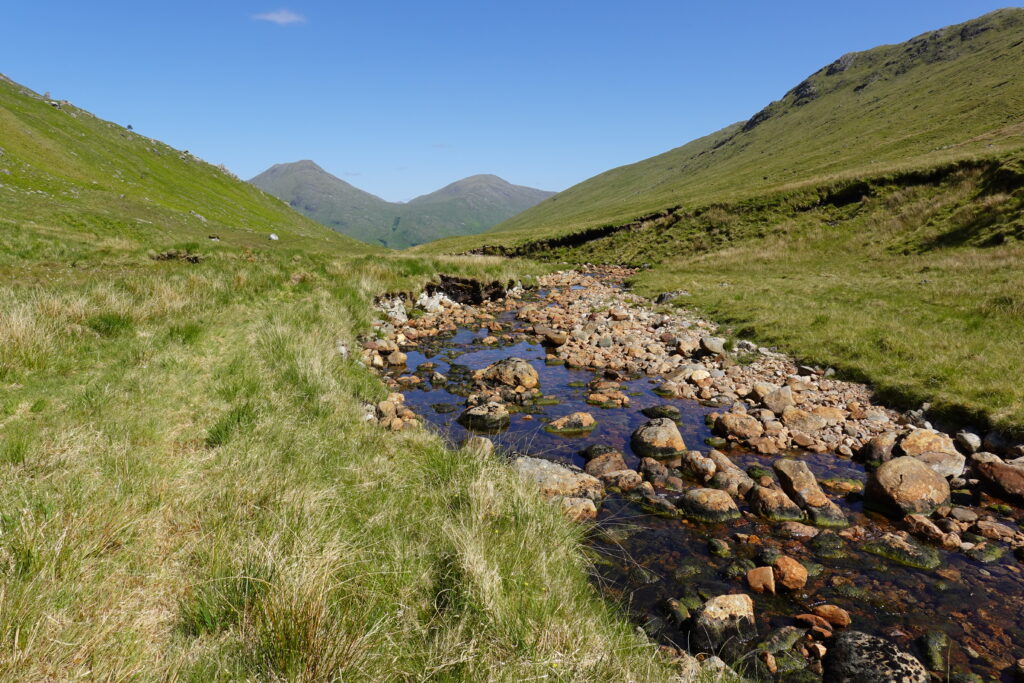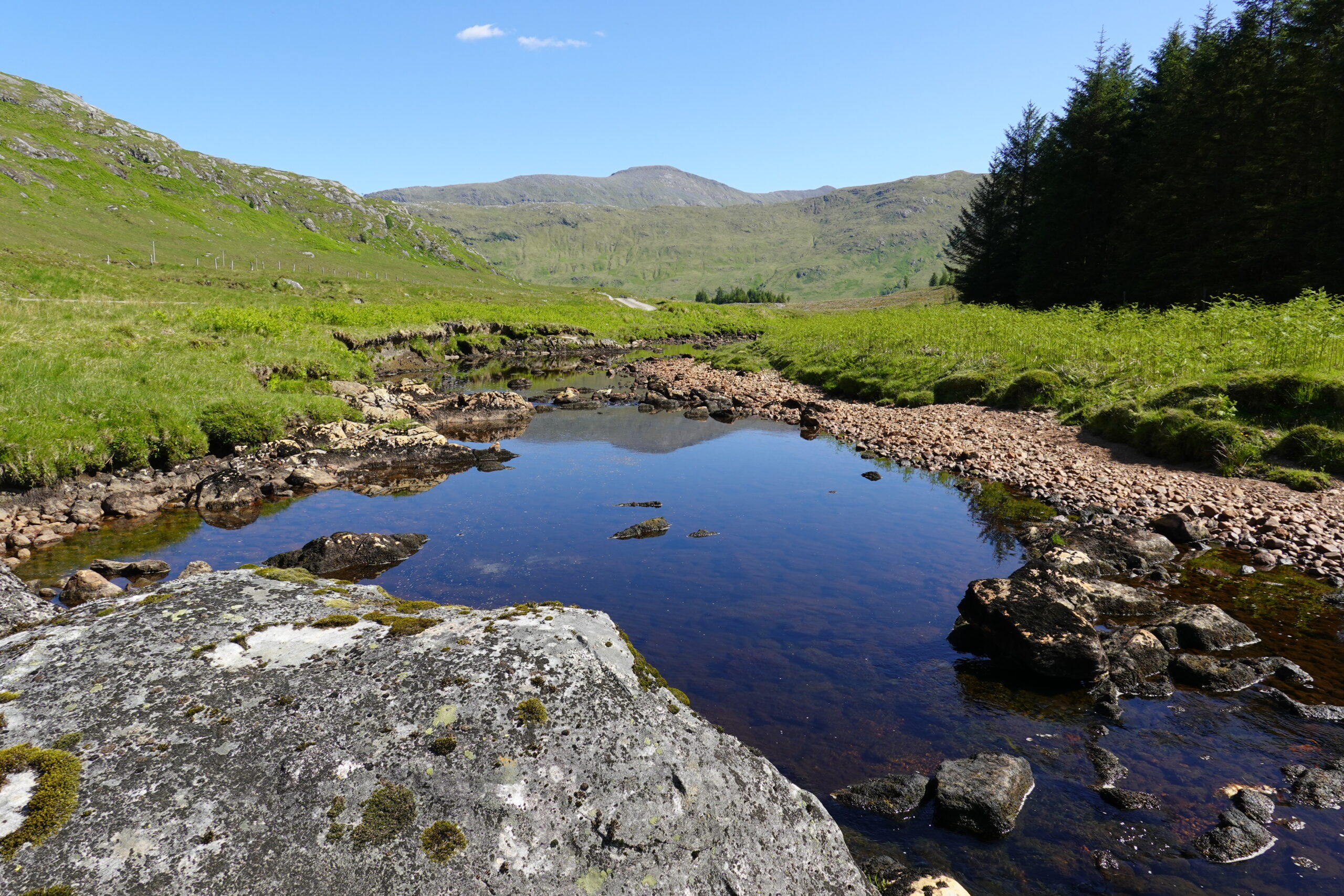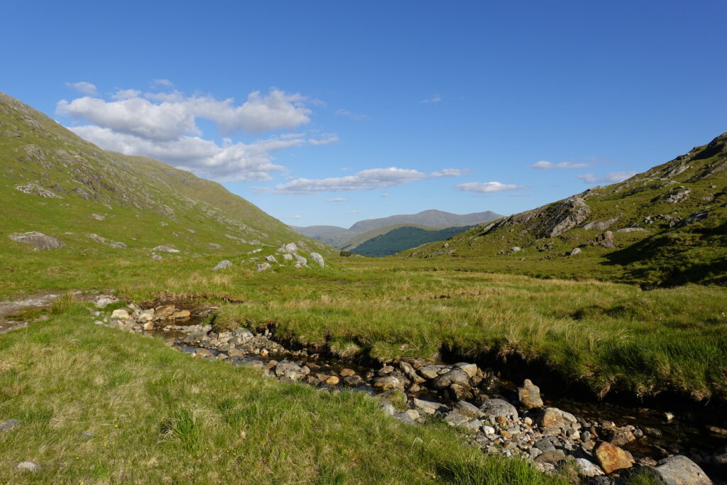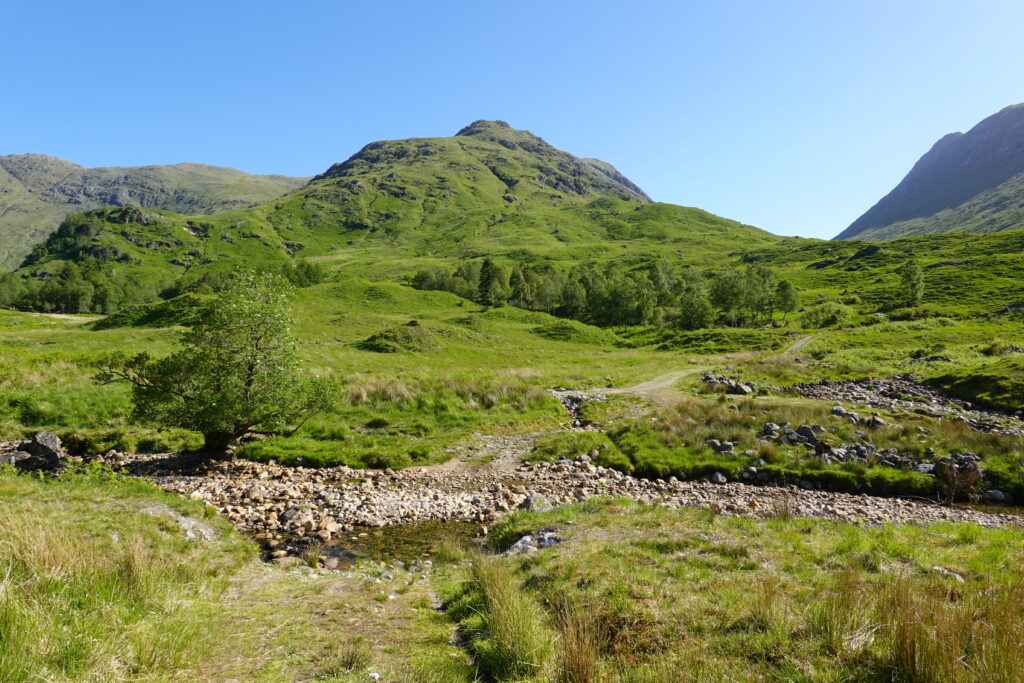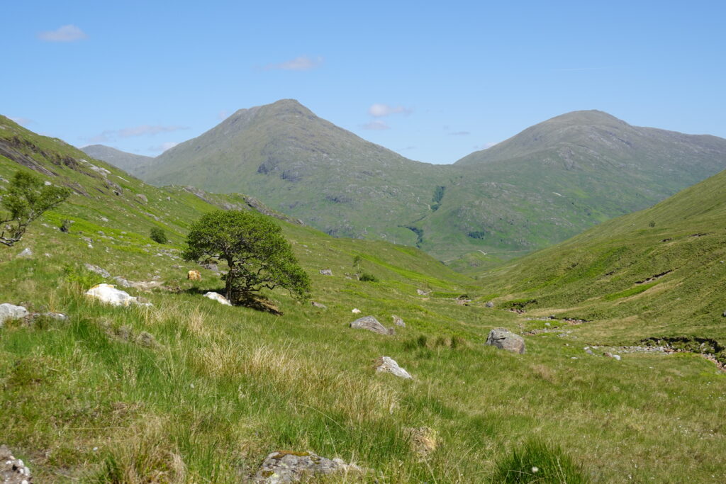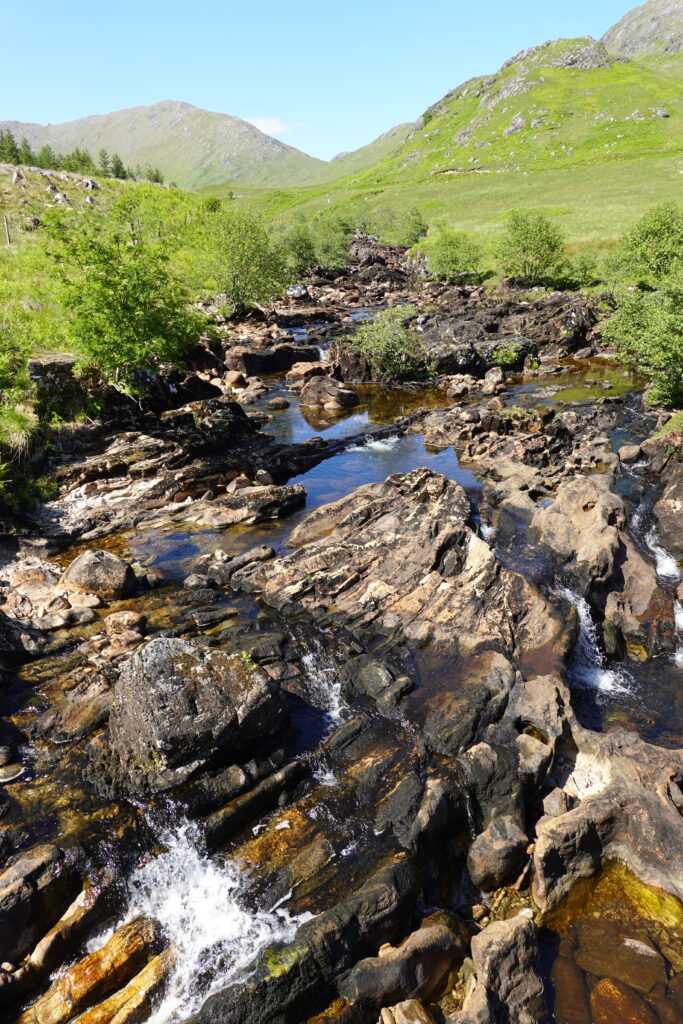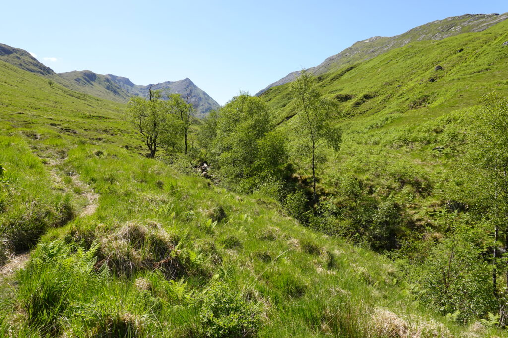 On descend ensuite Gleann Cuìrnean, avec ses méandres de la rivière Cuìrnean et ses arbres qui s’accrochent aux pentes rocheuses et aux gorges.