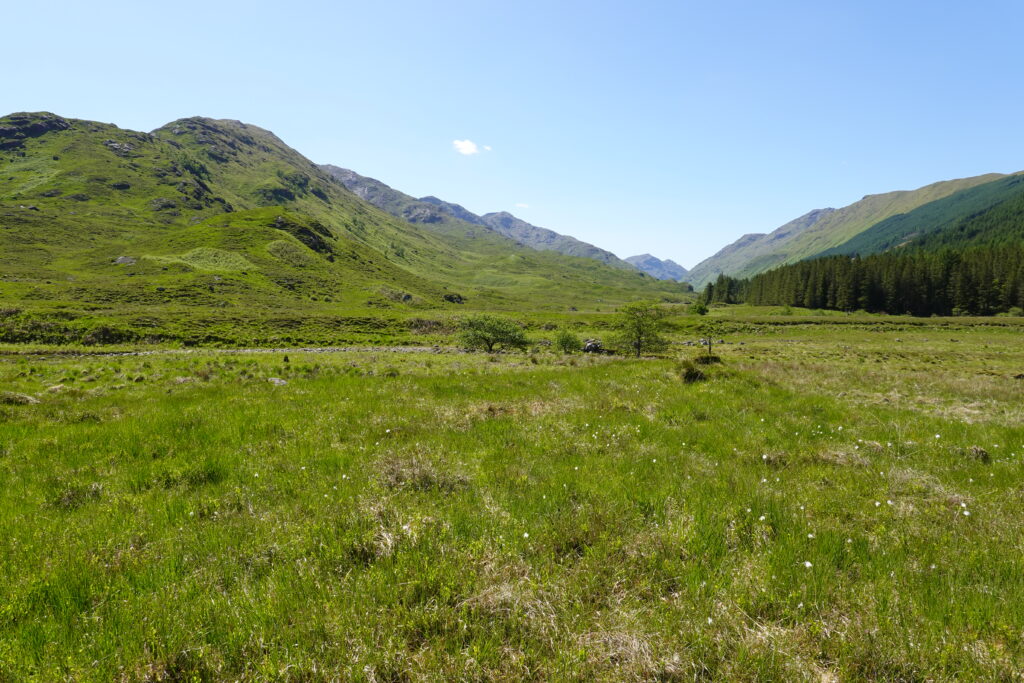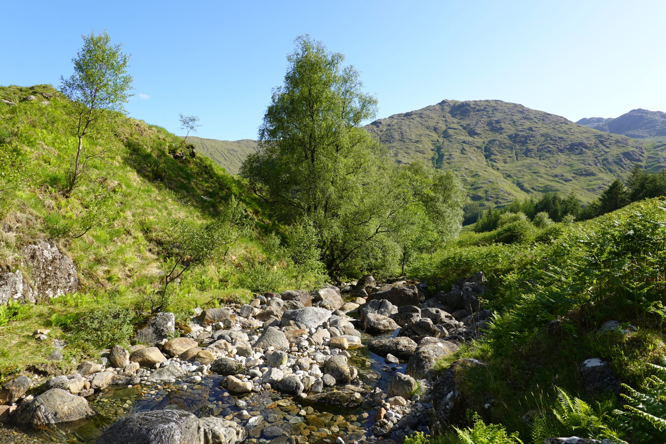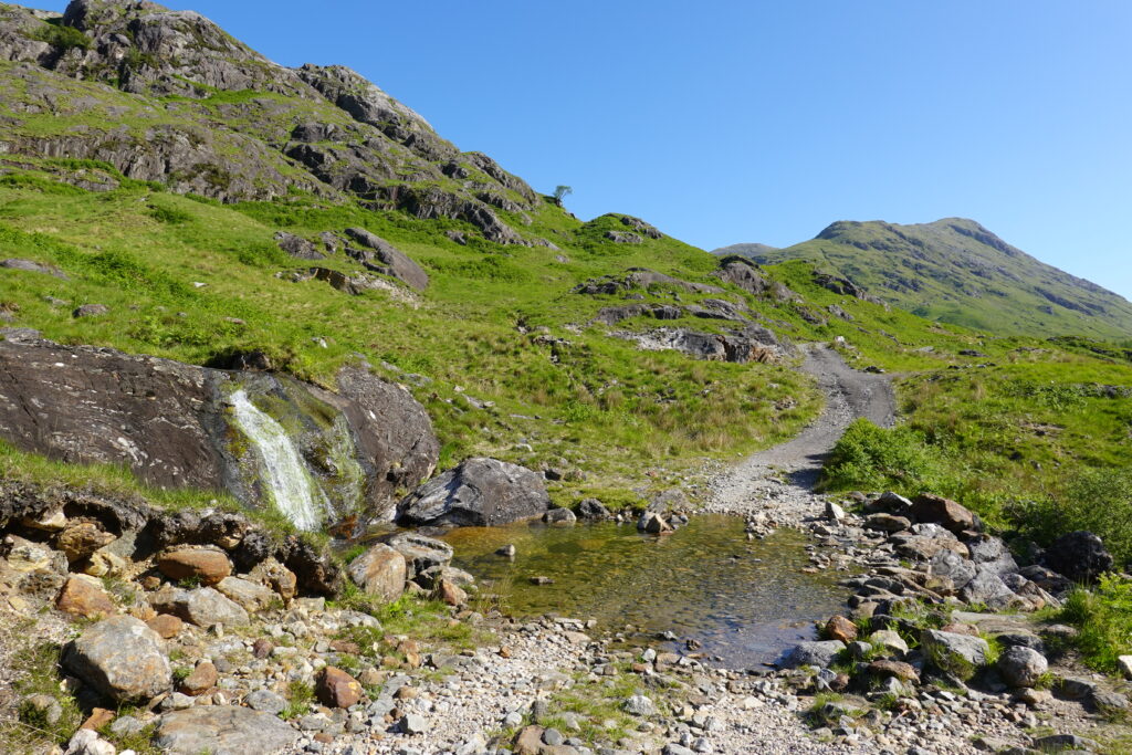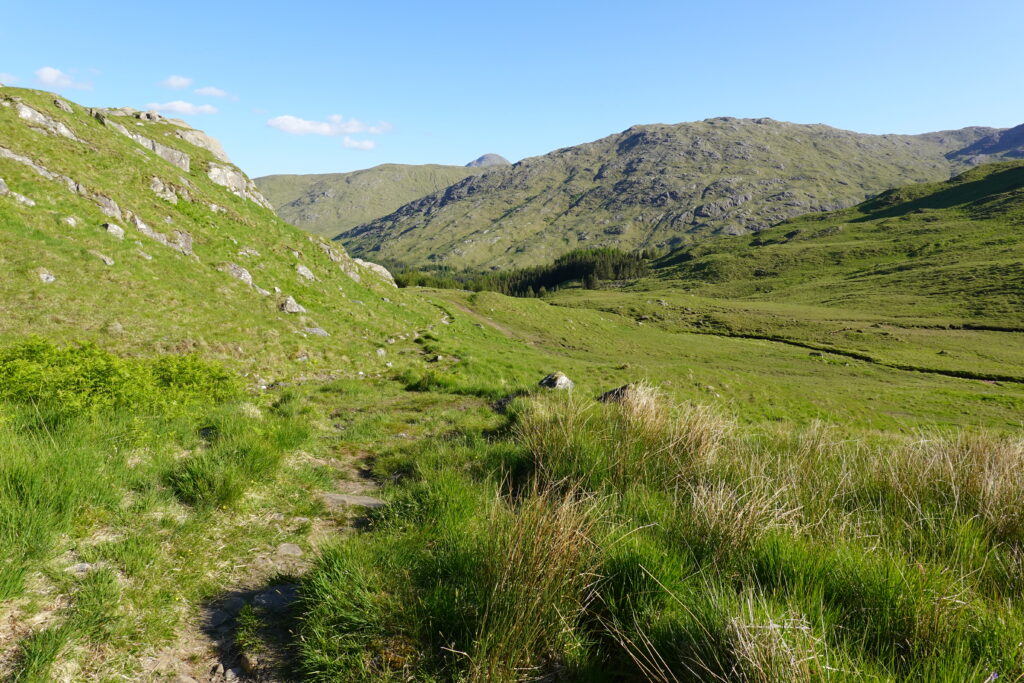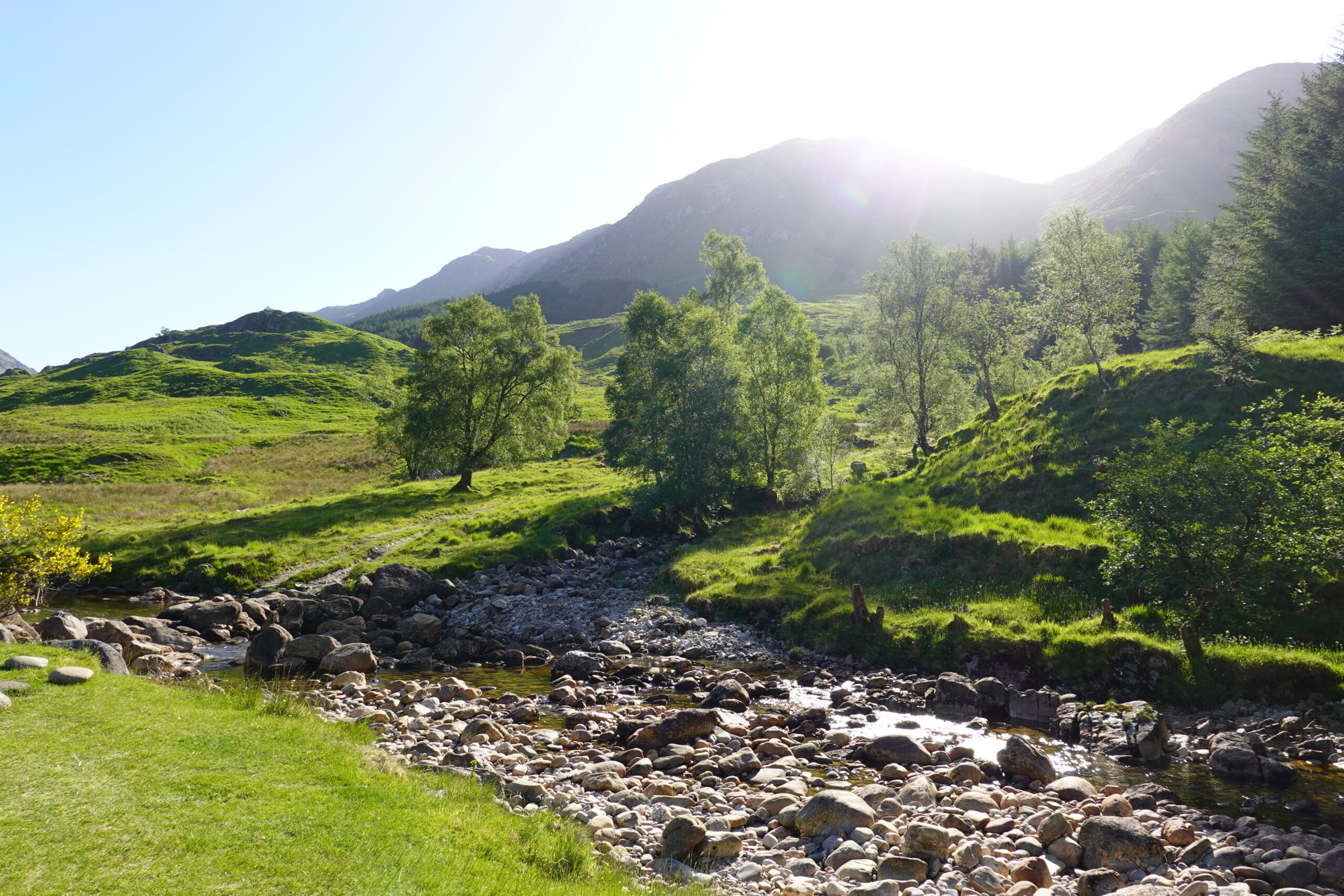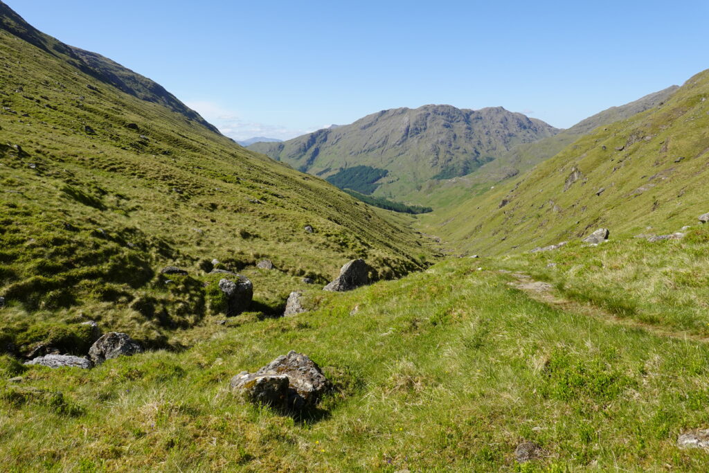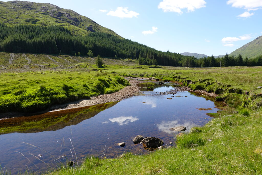 On descend ensuite Gleann Cuìrnean, avec ses méandres de la rivière Cuìrnean et ses arbres qui s’accrochent aux pentes rocheuses et aux gorges.