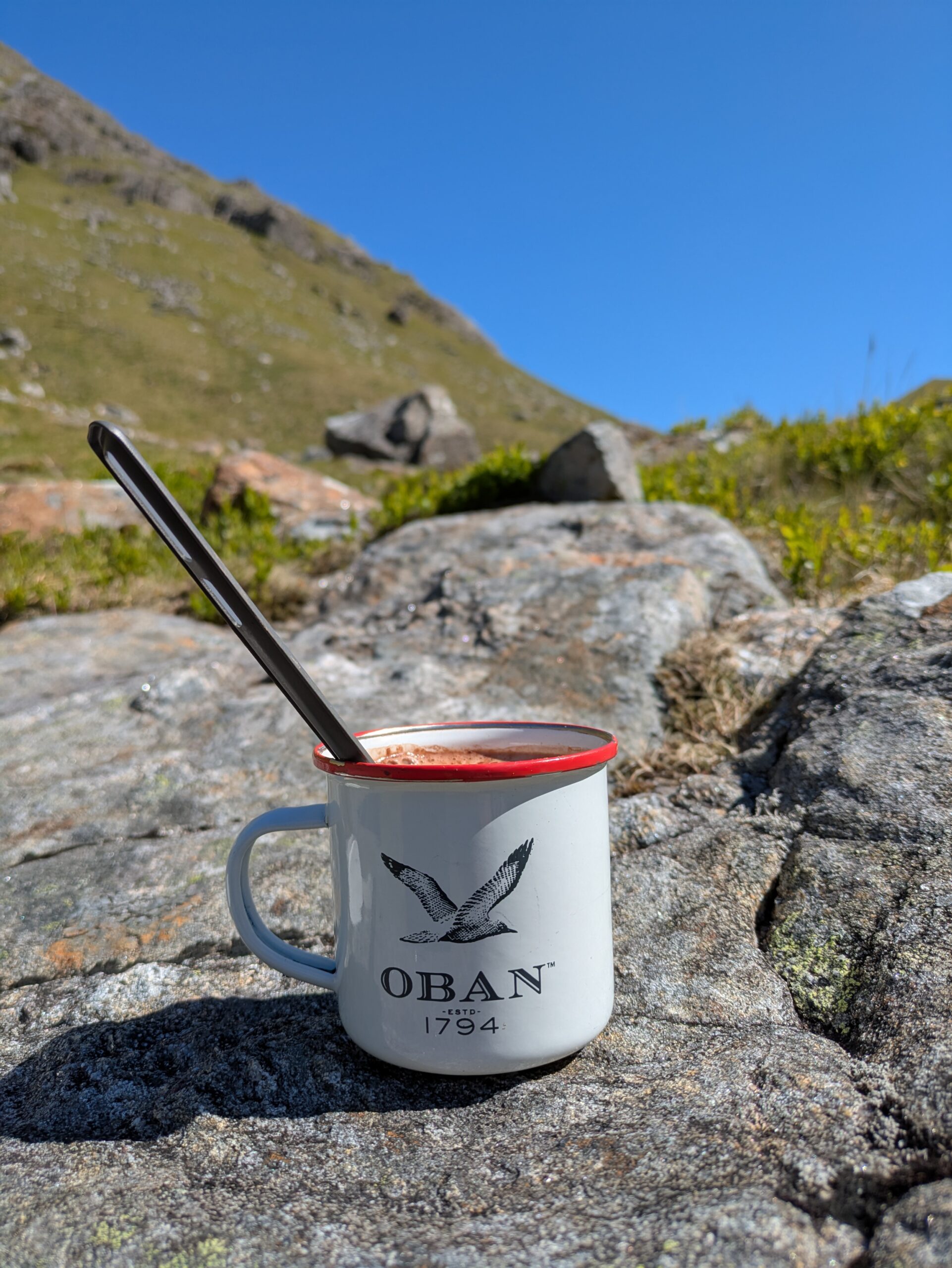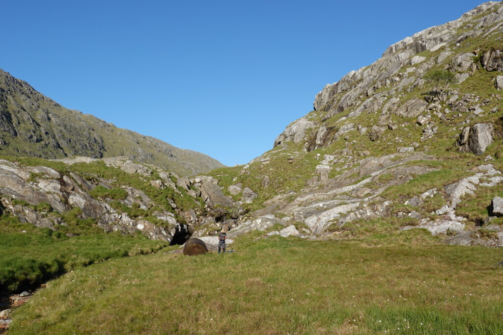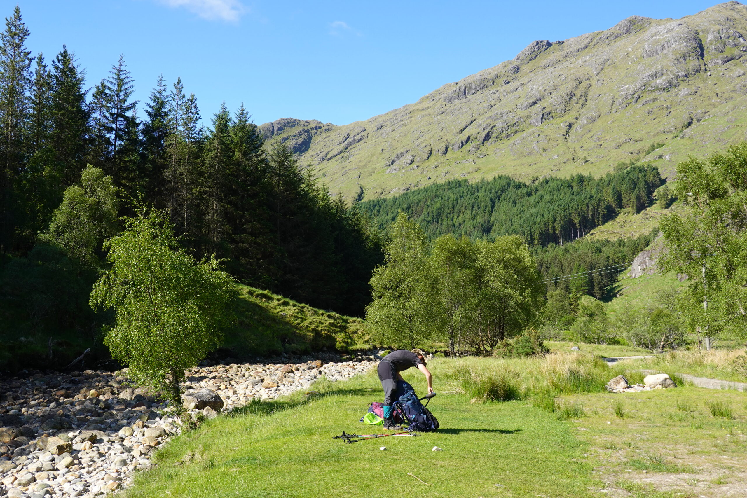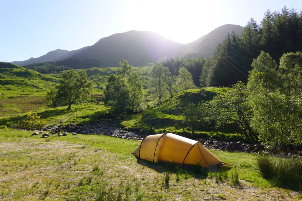 On trouve un beau spot de bivouac à côté de la rivière Finiskaig, peu avant Lochan à Mhaim. Le lieu est si beau dans la lumière du soir! On plante la tente et on prépare direct à manger.