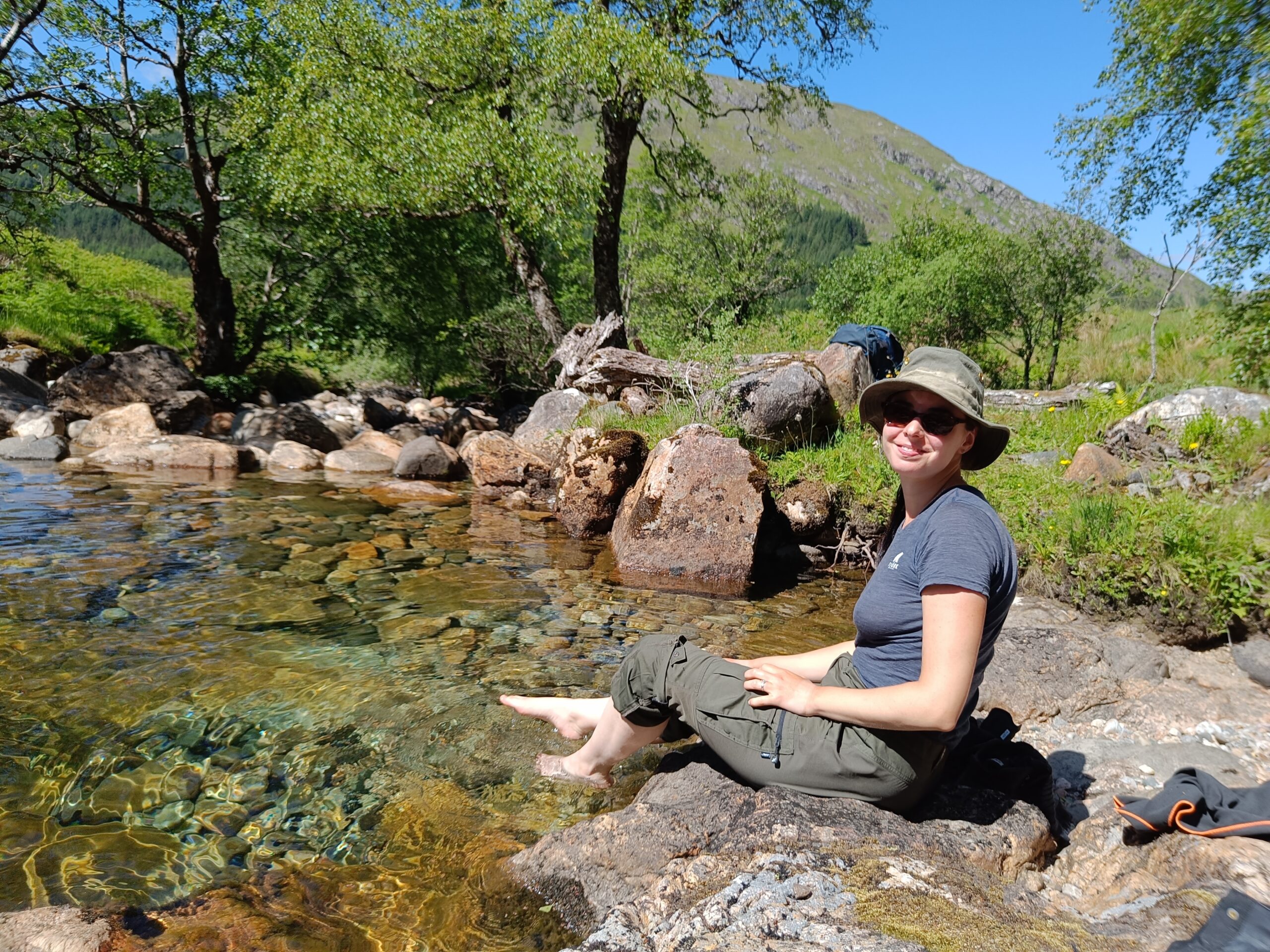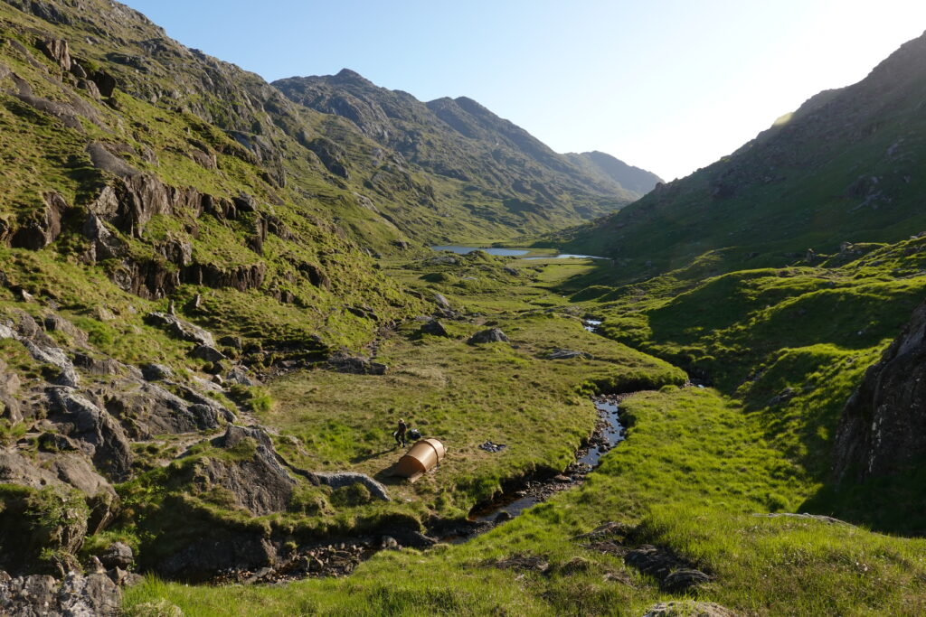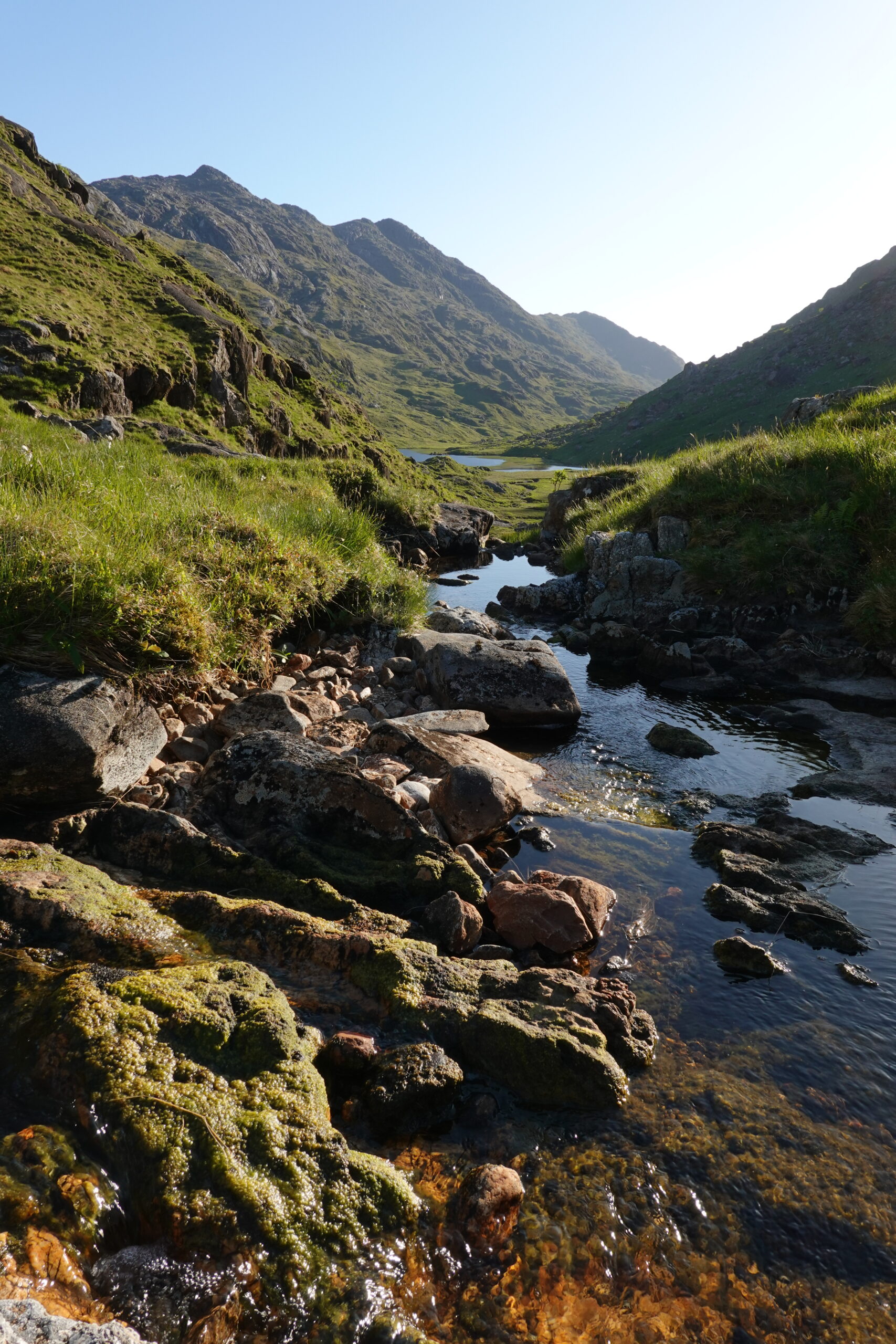On trouve un beau spot de bivouac à côté de la rivière Finiskaig, peu avant Lochan à Mhaim. Le lieu est si beau dans la lumière du soir! On plante la tente et on prépare direct à manger.