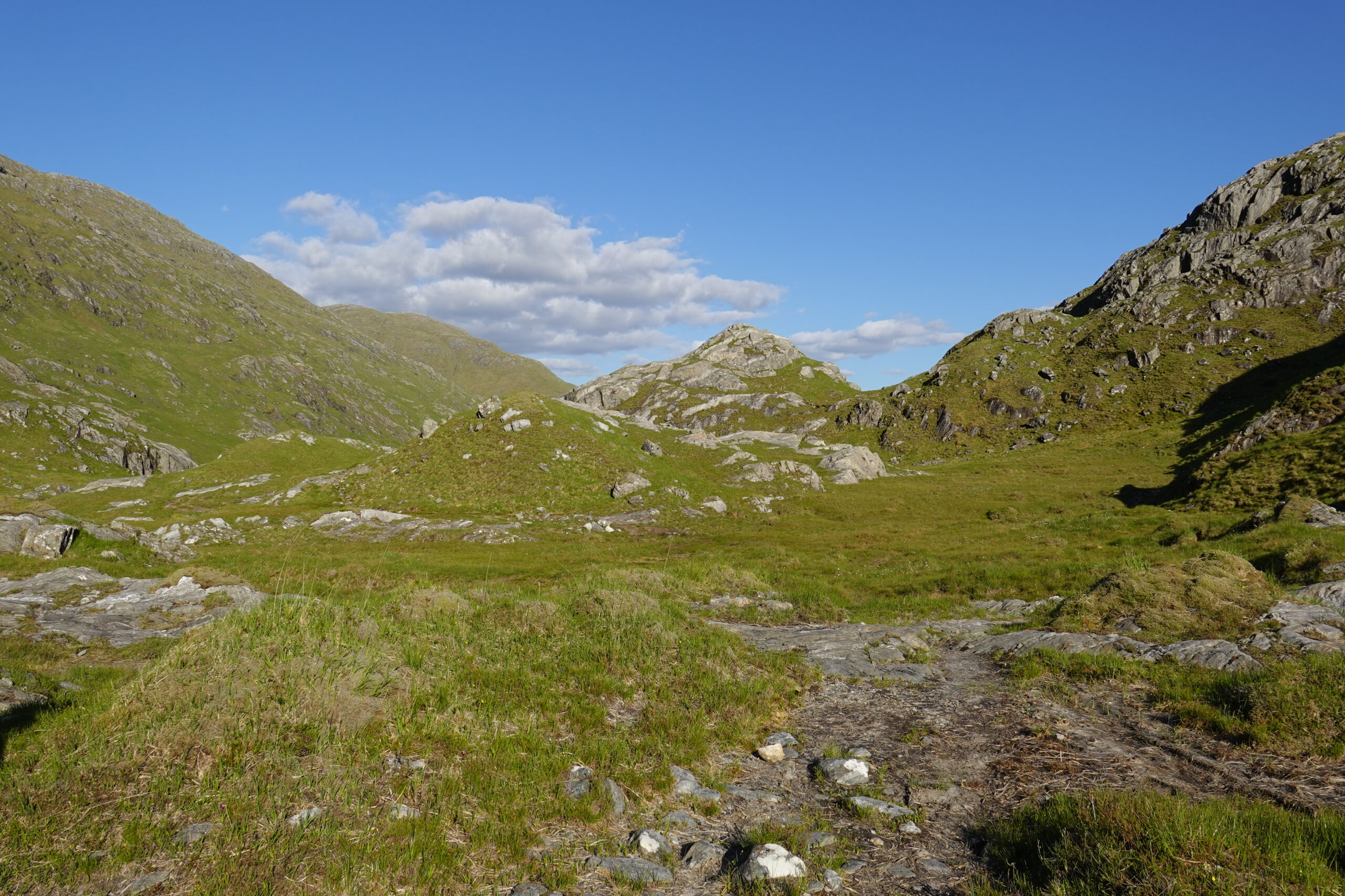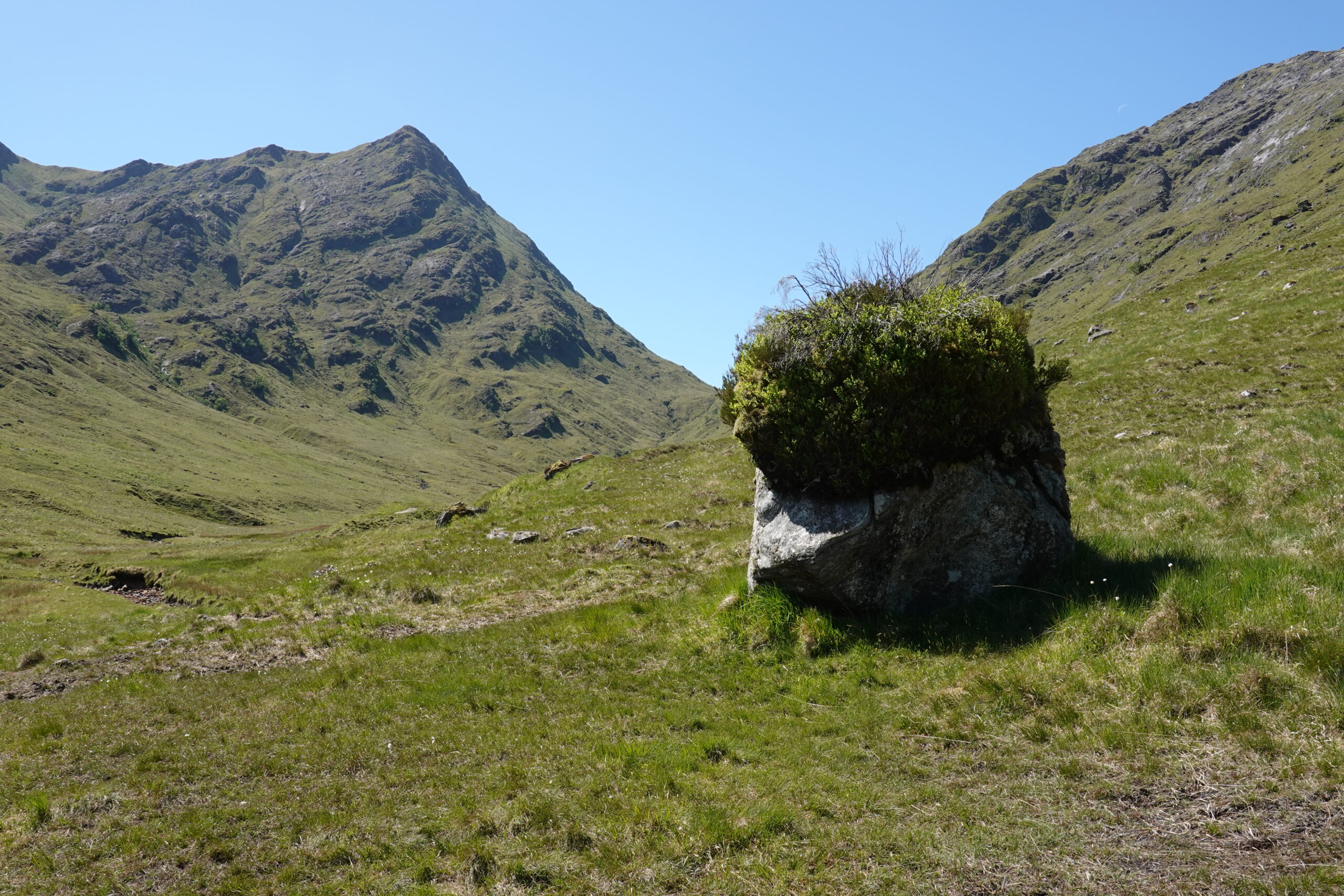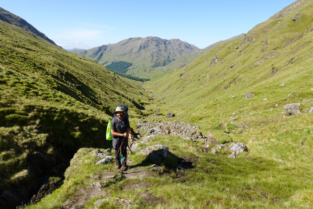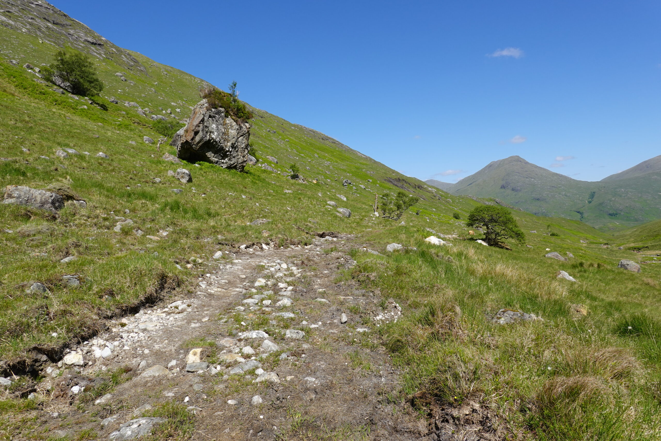 On a procédé à notre routine matinale sans se presser, en admirant le paysage, pour finalement partir vers 9h20. Un beau sentier nous fait monter au col entre Streap et Sgùrr Thuilm. En chemin, je veux ramasser un beau scarabée pour le prendre en photo, et il m’a mordue, ouch! Ça m’apprendra, haha. Tout le reste du trek, dès qu’on en voyait un, on s’écriait “the death beetle!”, haha. ^^ Les Highlands sont décidément peuplés de danger. 😉