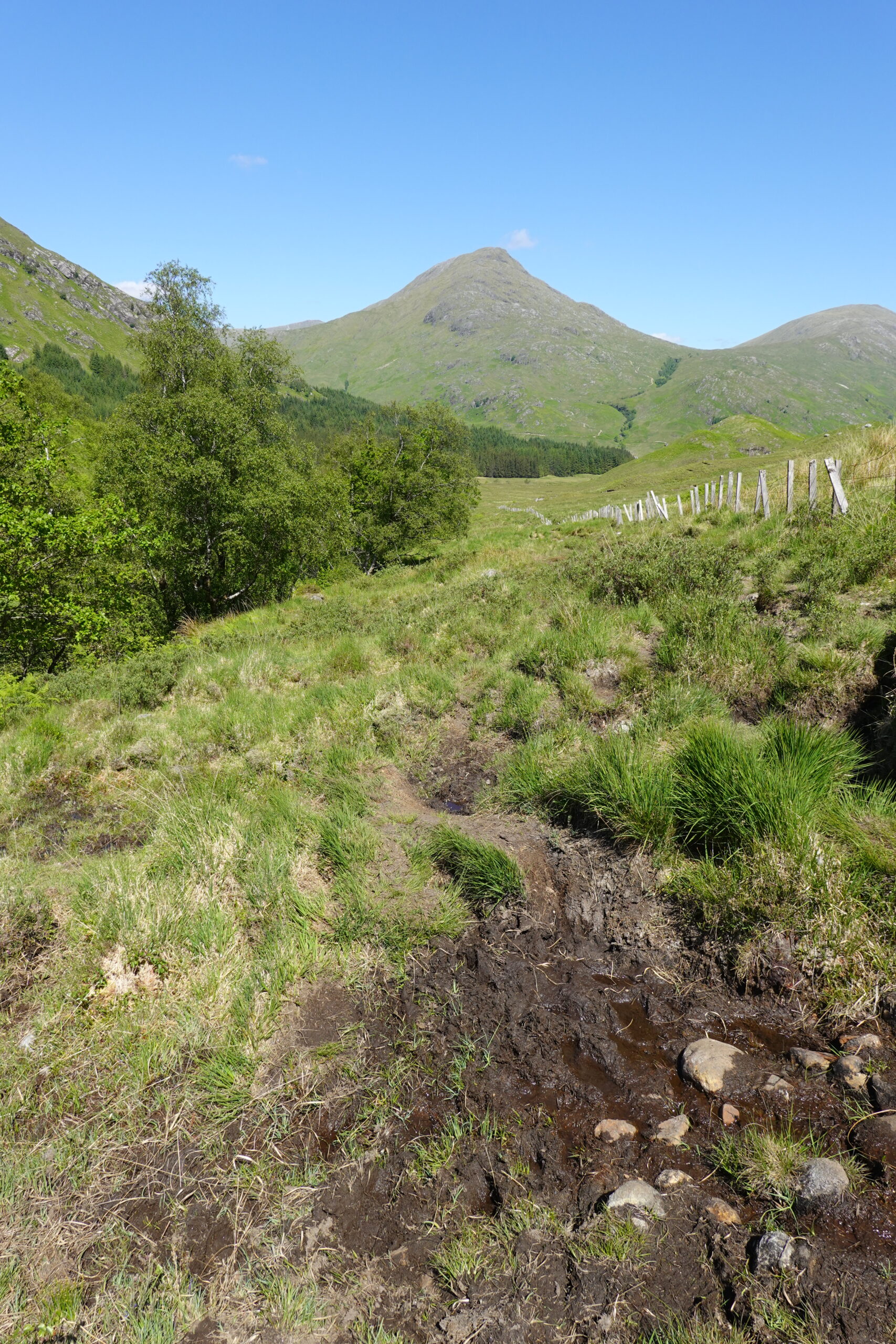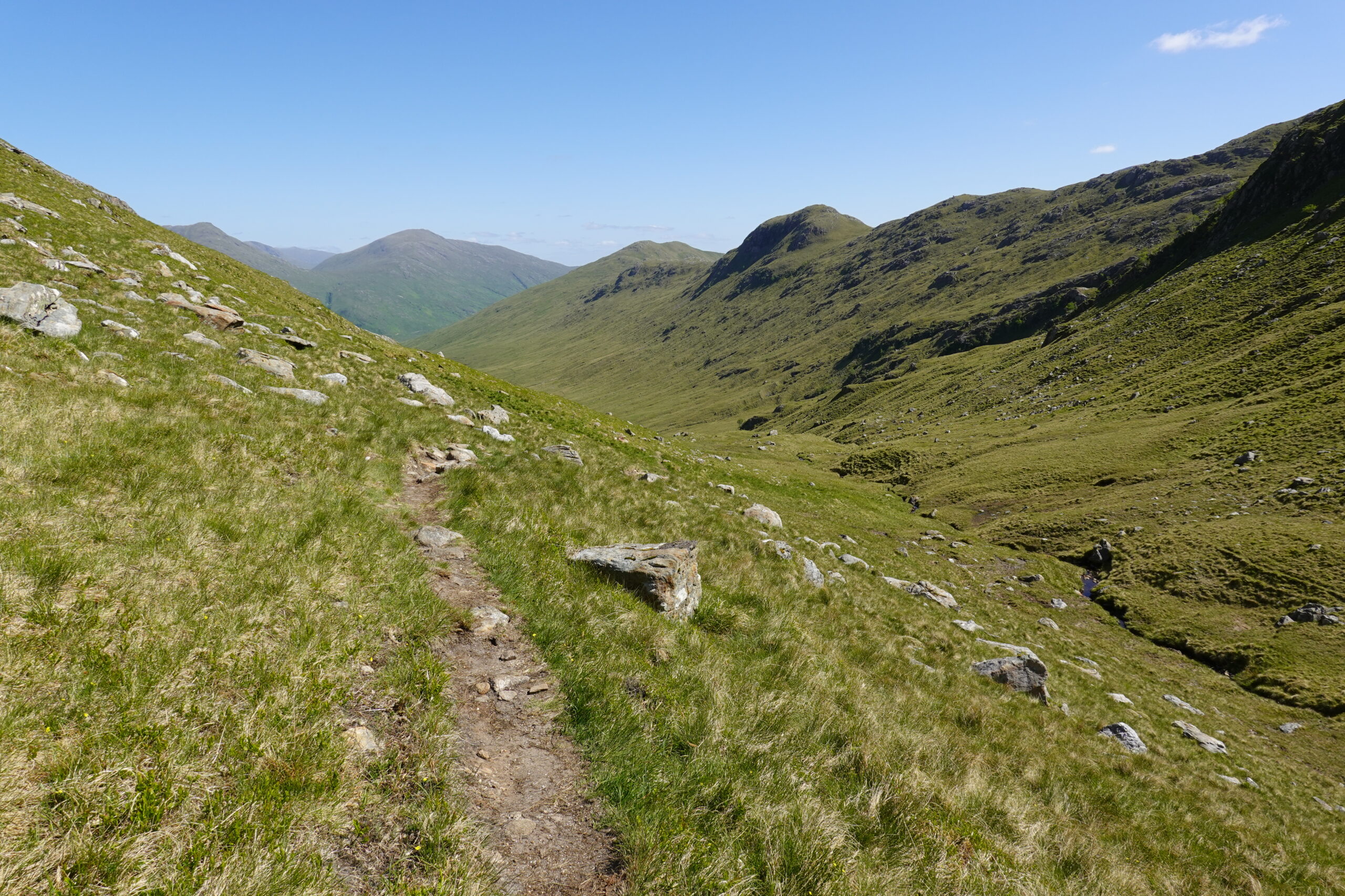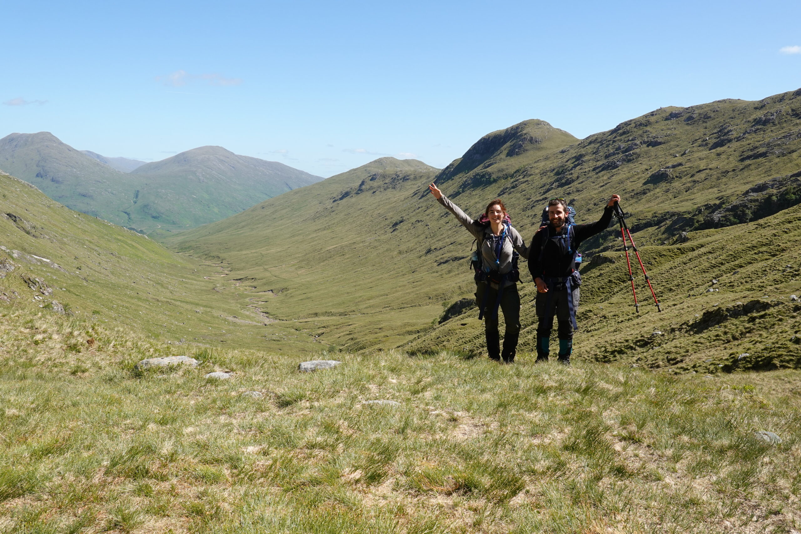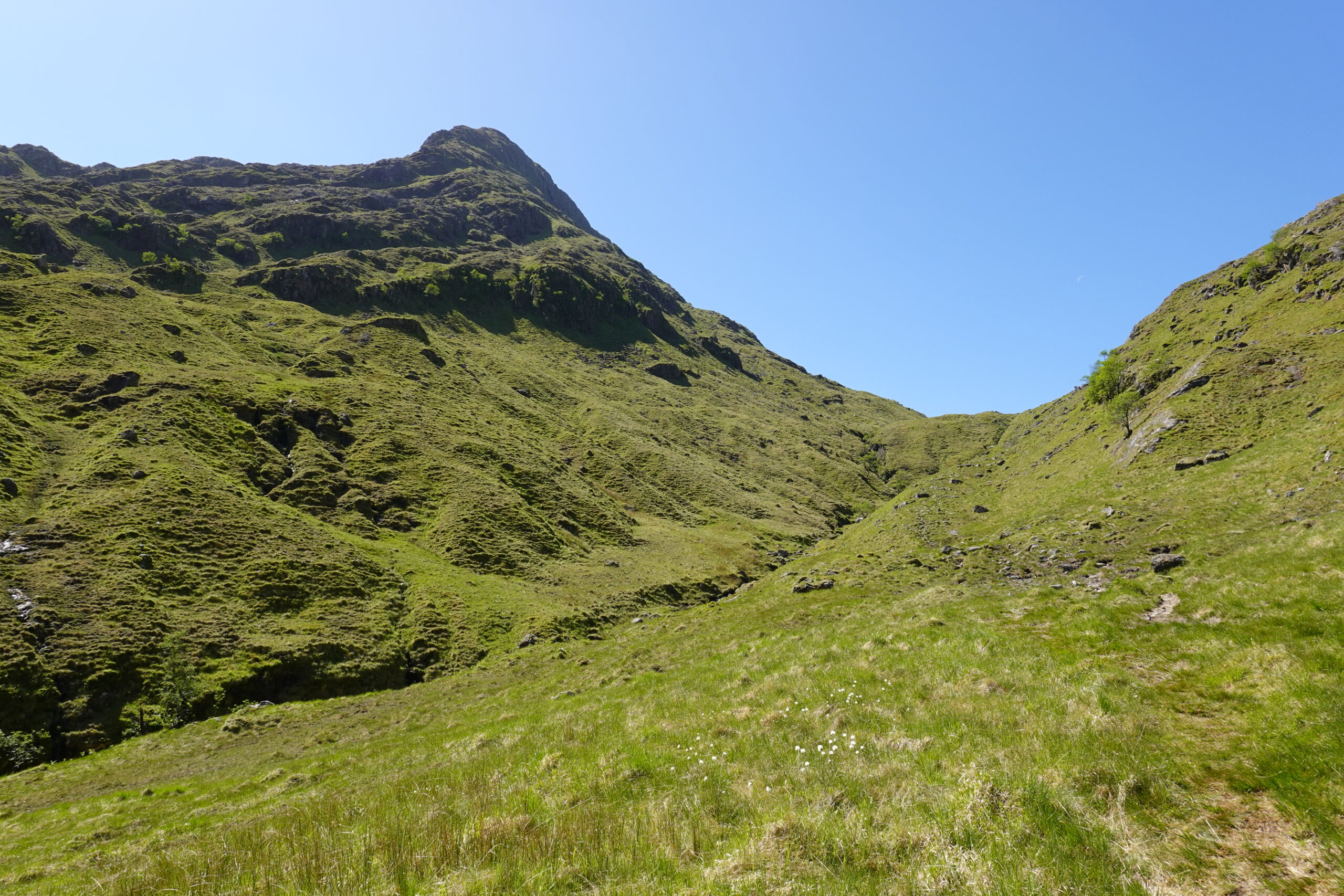 On a procédé à notre routine matinale sans se presser, en admirant le paysage, pour finalement partir vers 9h20. Un beau sentier nous fait monter au col entre Streap et Sgùrr Thuilm. En chemin, je veux ramasser un beau scarabée pour le prendre en photo, et il m’a mordue, ouch! Ça m’apprendra, haha. Tout le reste du trek, dès qu’on en voyait un, on s’écriait “the death beetle!”, haha. ^^ Les Highlands sont décidément peuplés de danger. 😉
