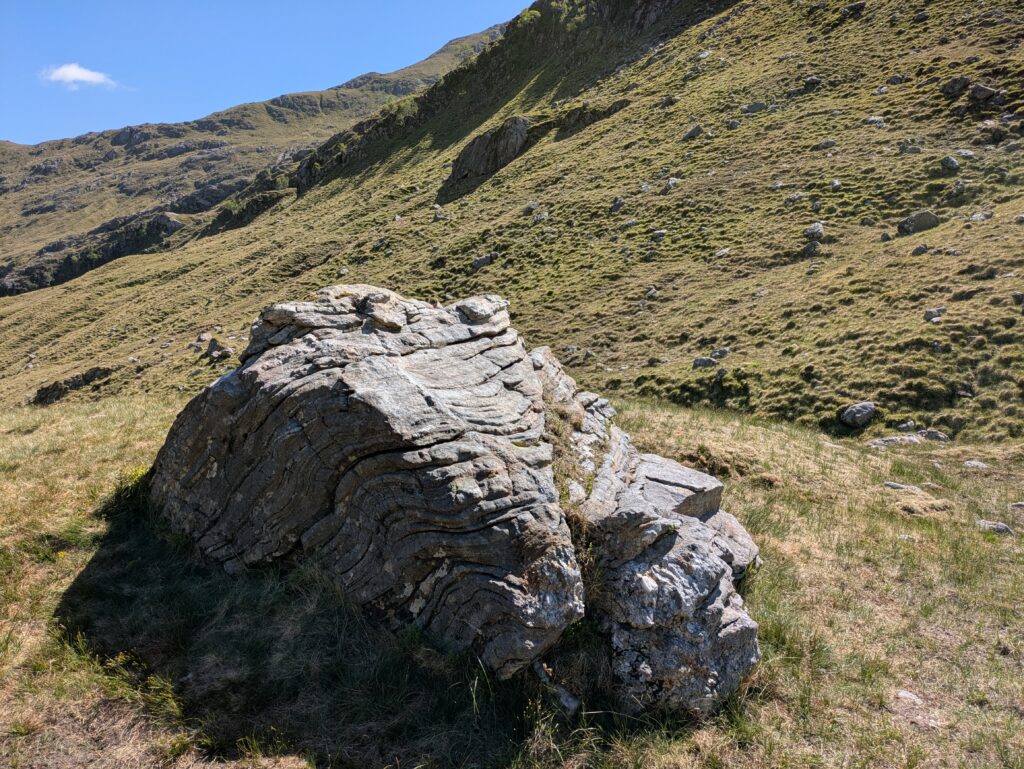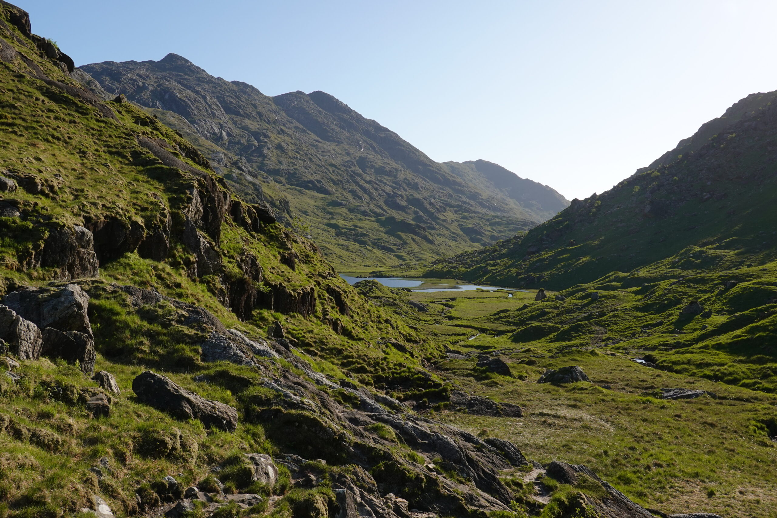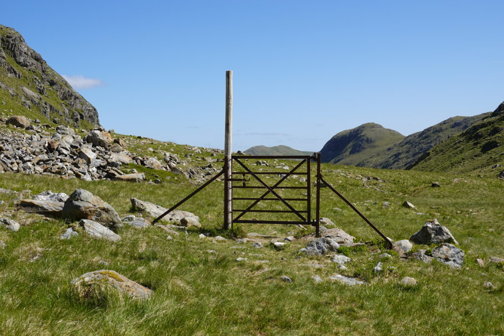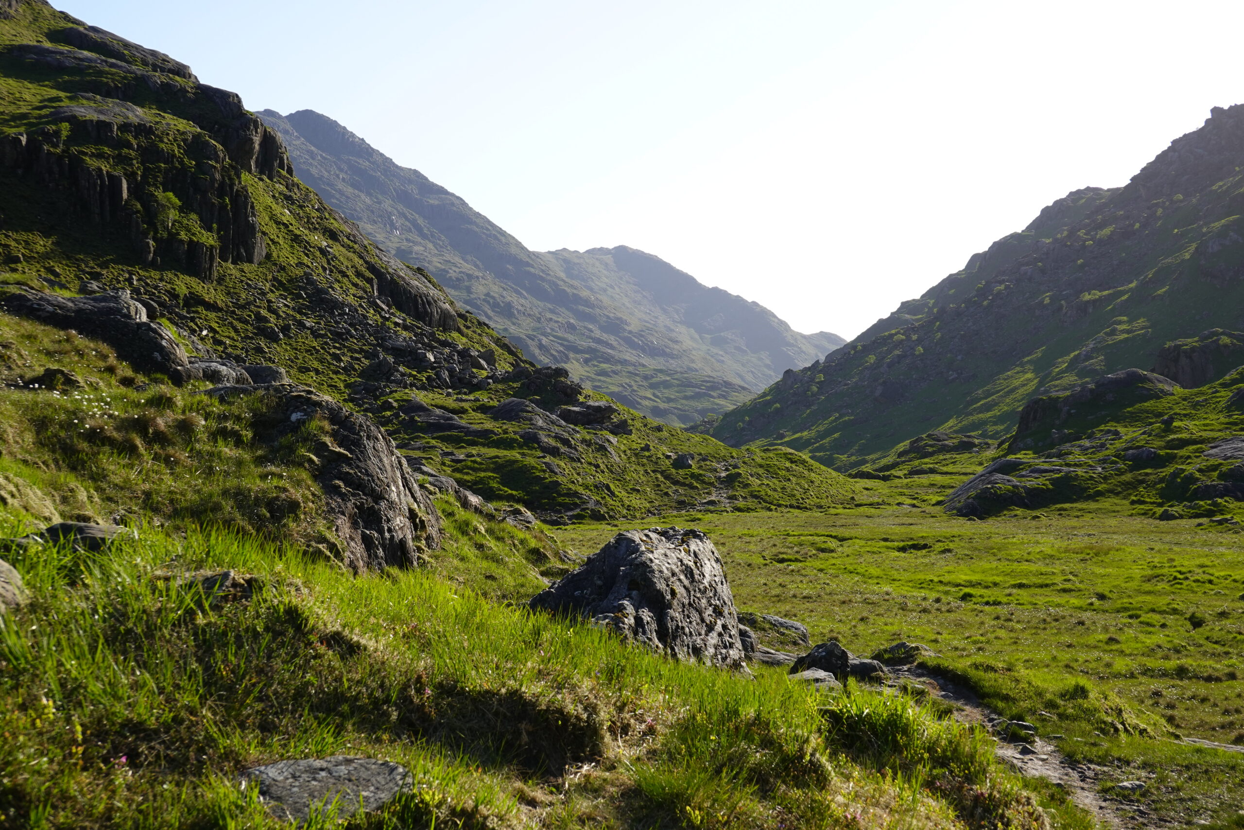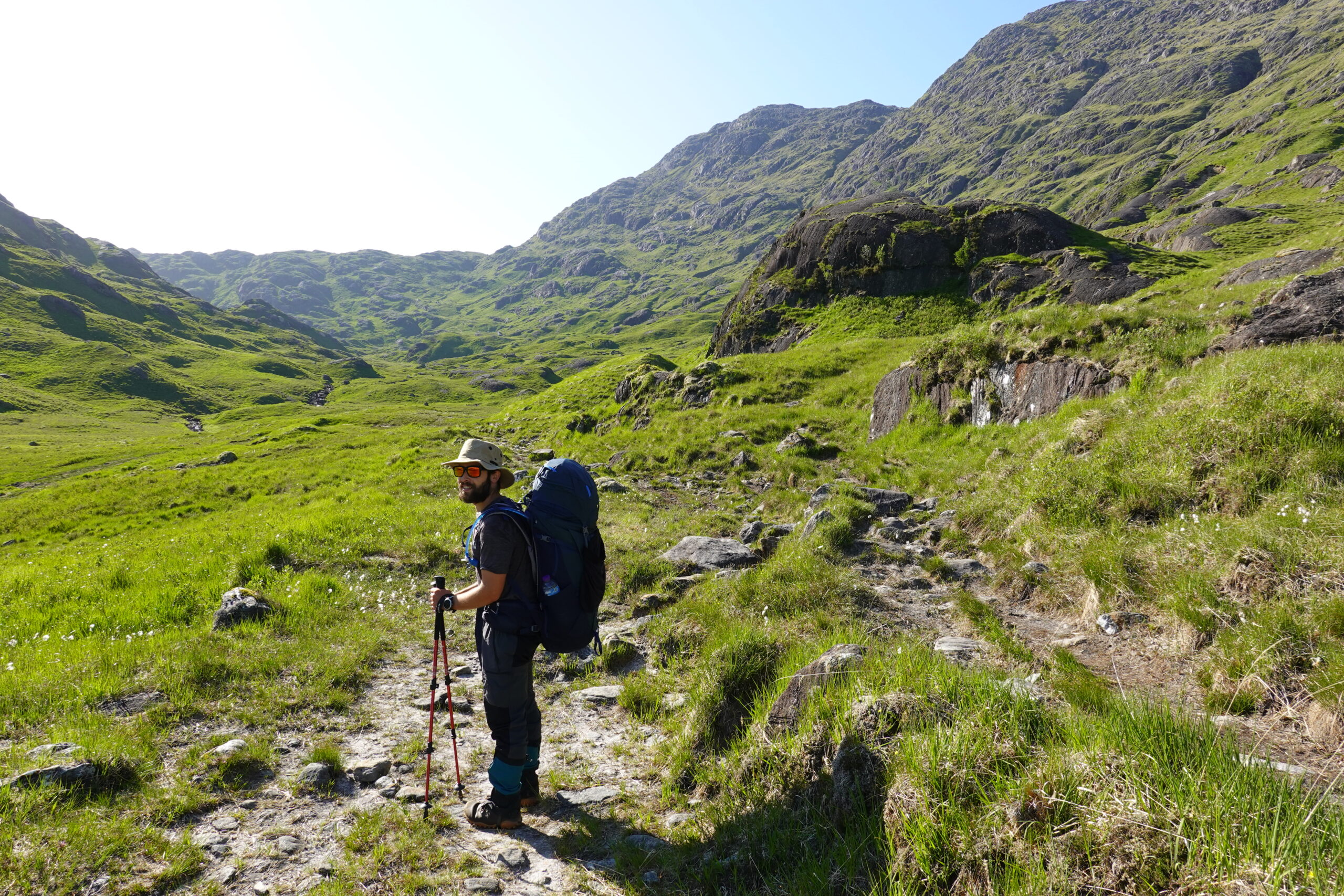 On a procédé à notre routine matinale sans se presser, en admirant le paysage, pour finalement partir vers 9h20. Un beau sentier nous fait monter au col entre Streap et Sgùrr Thuilm. En chemin, je veux ramasser un beau scarabée pour le prendre en photo, et il m’a mordue, ouch! Ça m’apprendra, haha. Tout le reste du trek, dès qu’on en voyait un, on s’écriait “the death beetle!”, haha. ^^ Les Highlands sont décidément peuplés de danger. 😉