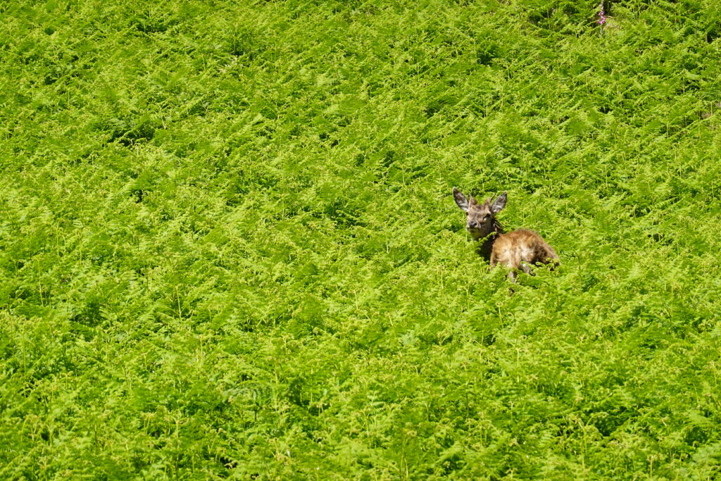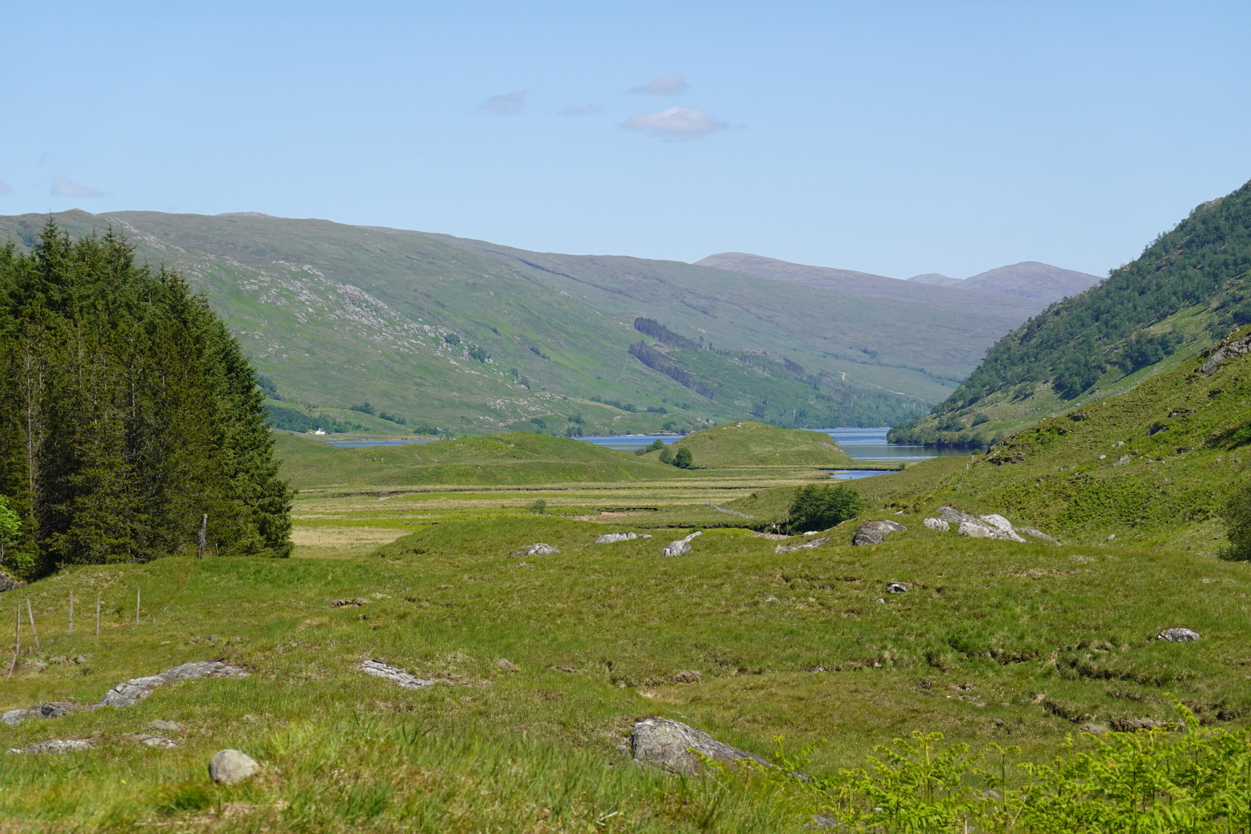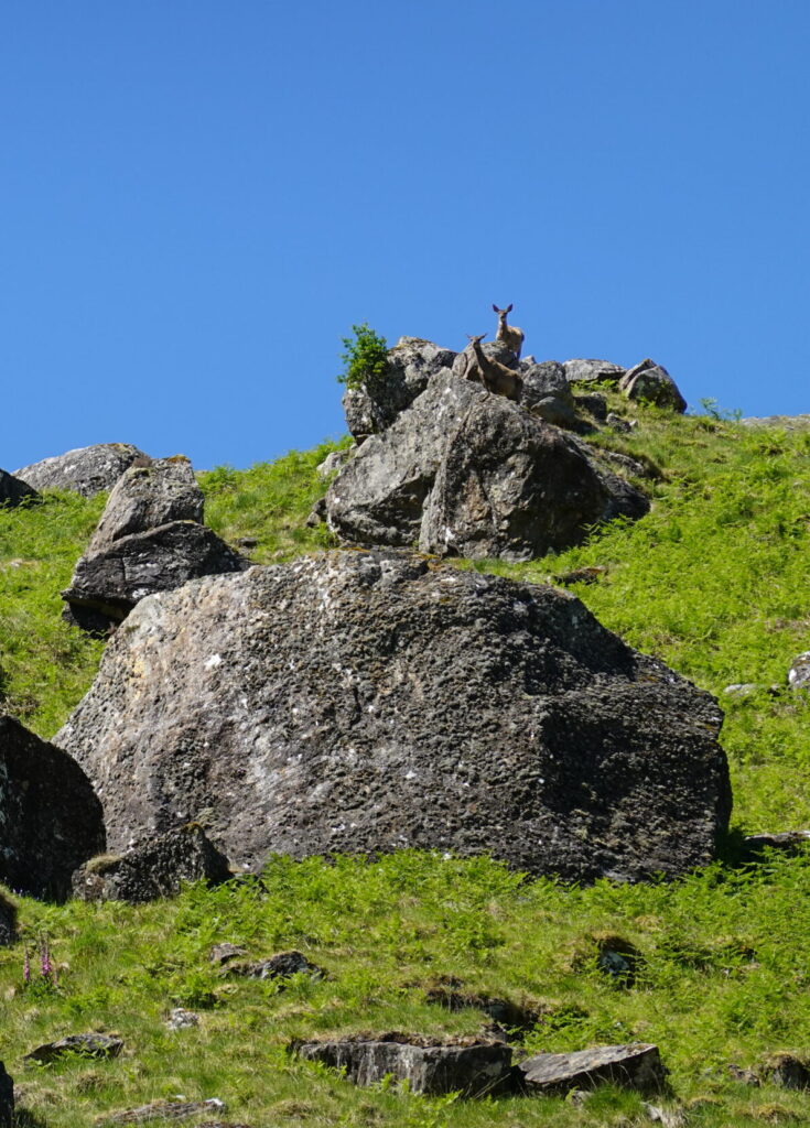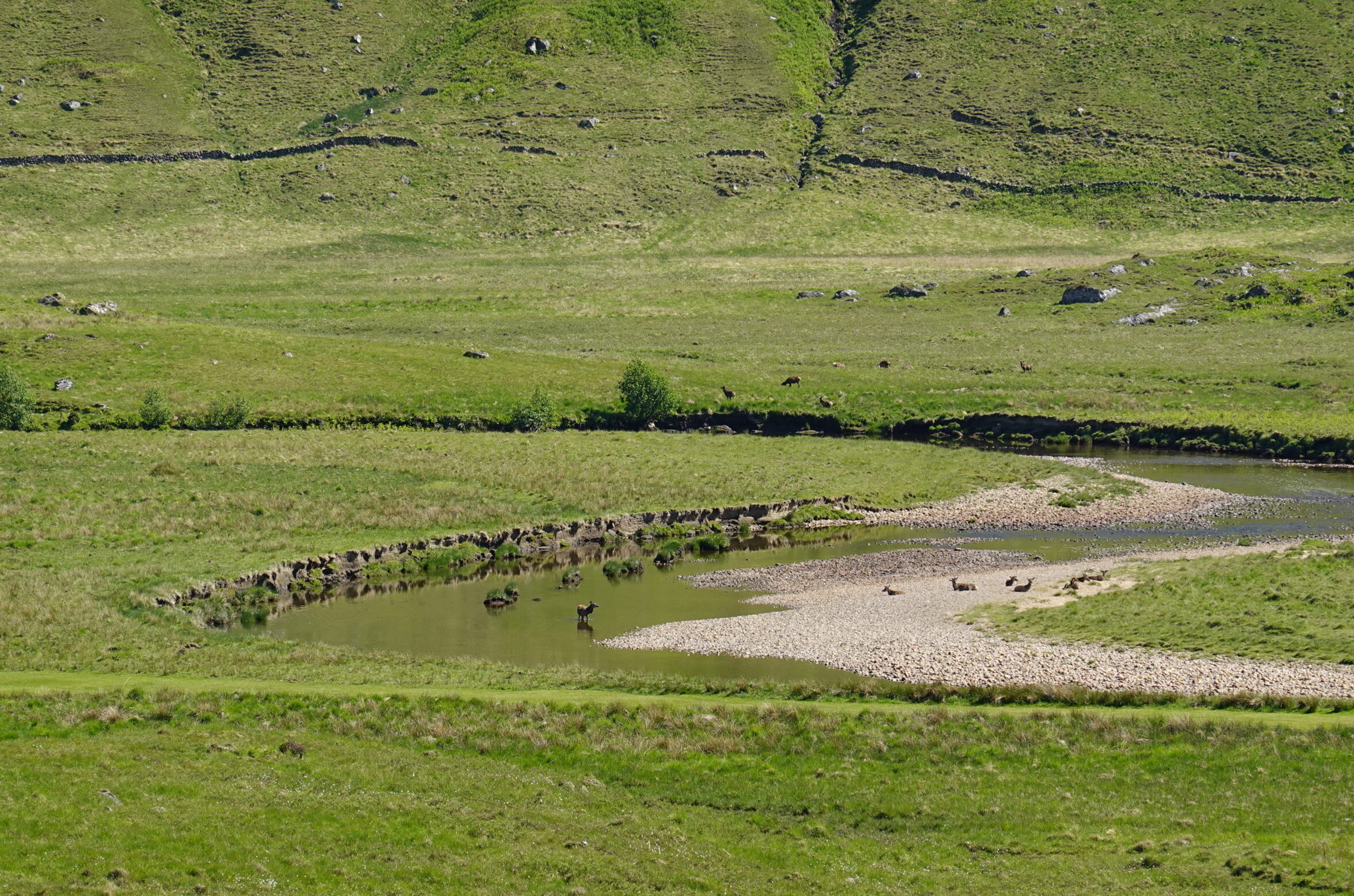 Puis on entre dans Glen Dessary, c’est le début des Rough Bounds of Knoydart — un coin des Highlands réputé pour être particulièrement isolé, difficile, inaccessible et brut. Une vingtaine de cerfs se reposent dans un méandre de la rivière, ça commence bien. 🙂