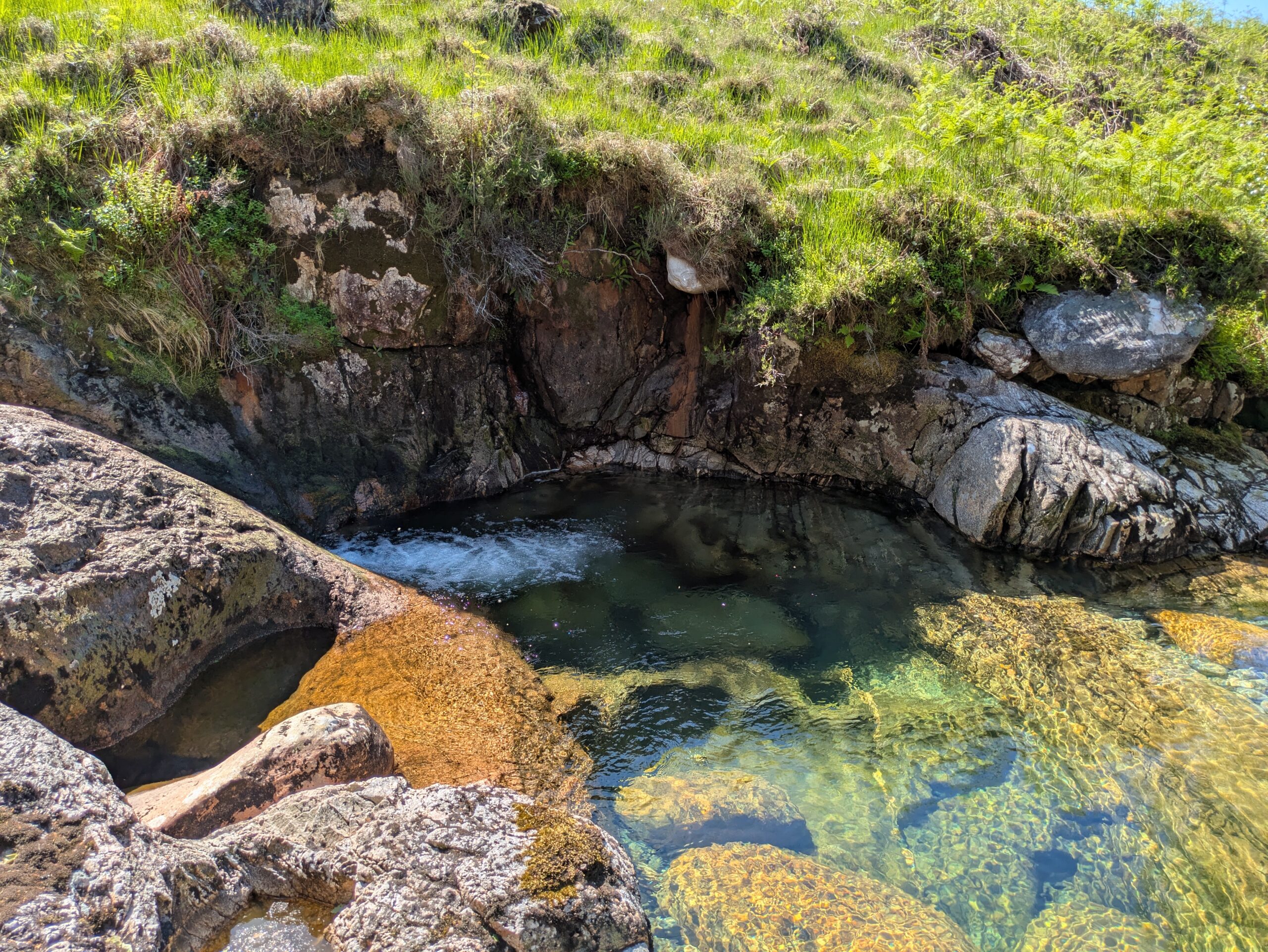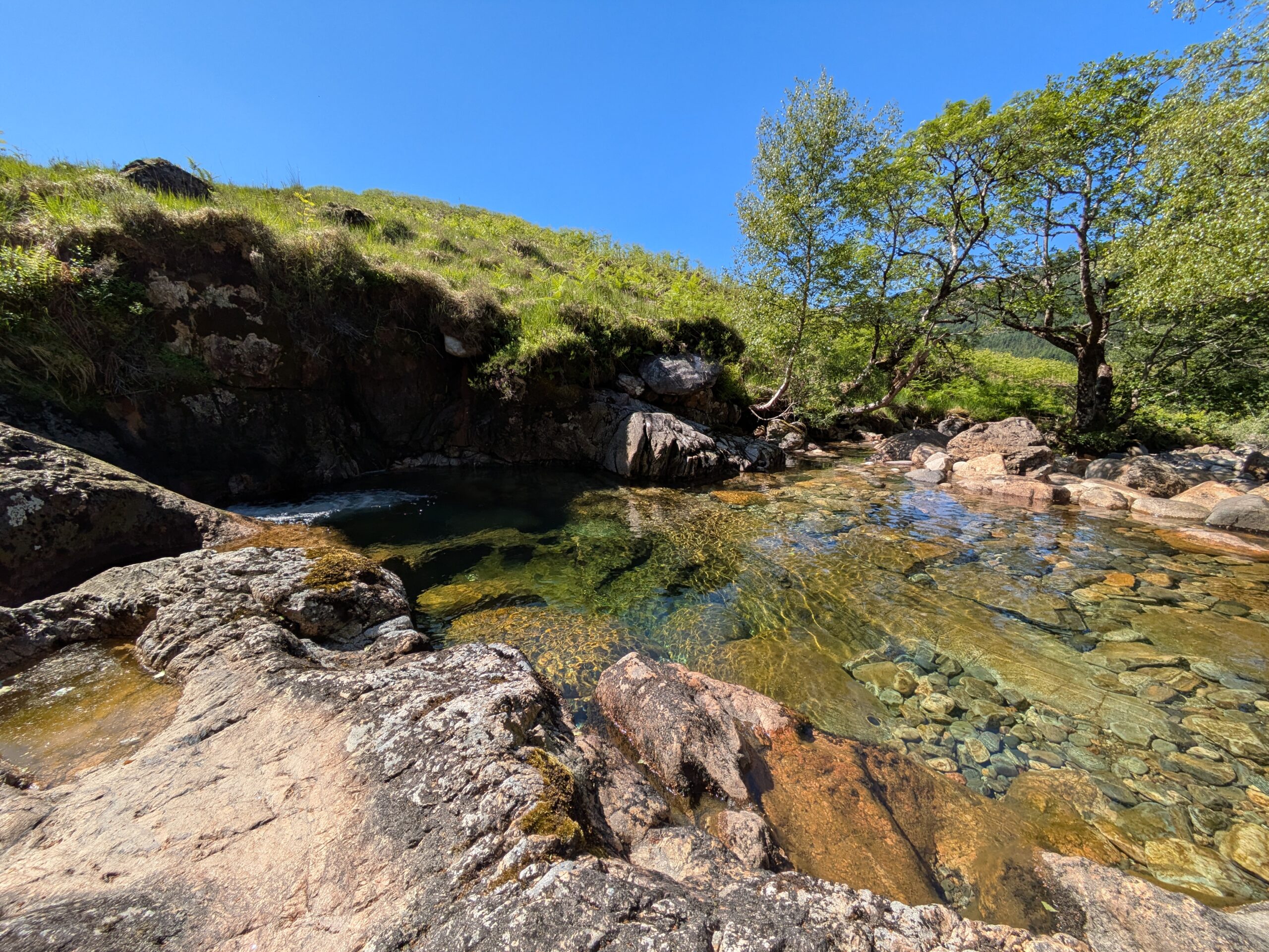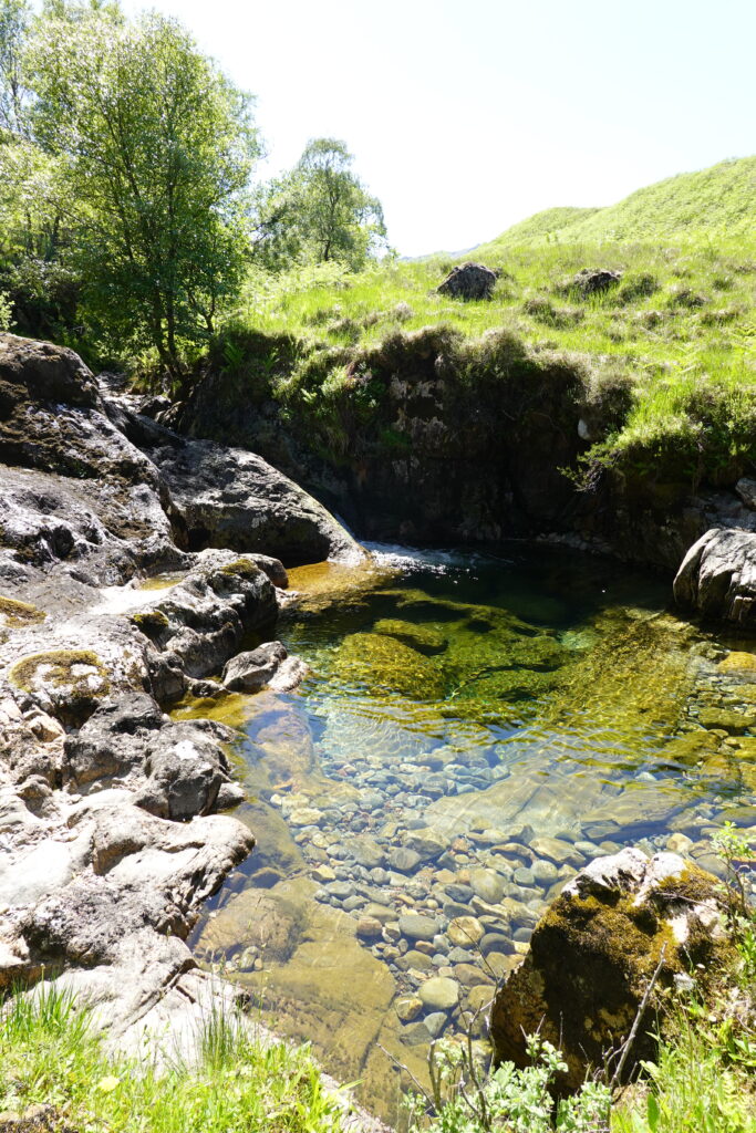 Au bout du glen, la rivière est splendide et offre une belle “pool” pour nager, avec une eau magnifiquement claire et des poissons qui sautent hors de l’eau!