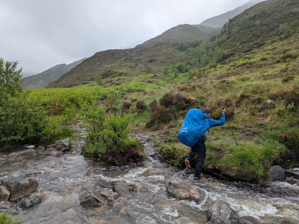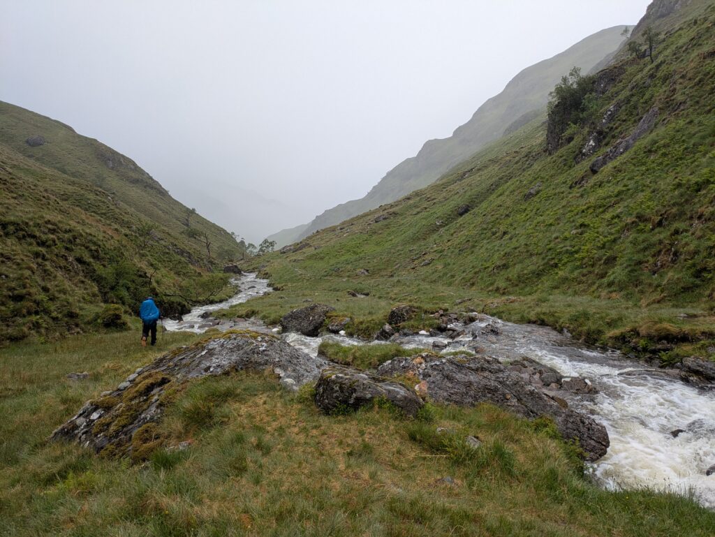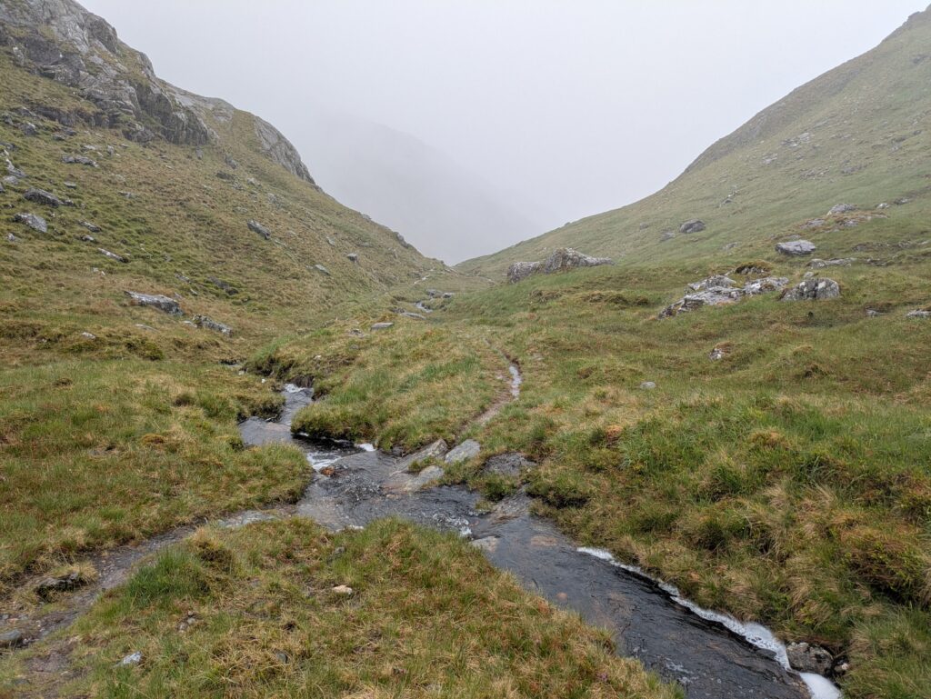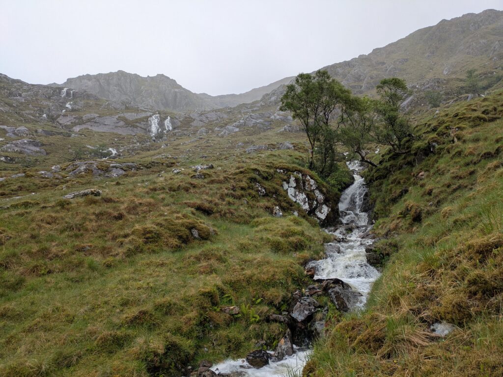 On entame la descente vers Barisdale, à travers Gleann Unndalain. Il y a régulièrement des averses, mais finalement on a surtout droit à de la bruine. L’humidité vient avant tout du sol, avec plein de torrents à traverser et des sentiers parfois eux-mêmes transformés en ruisseaux.
