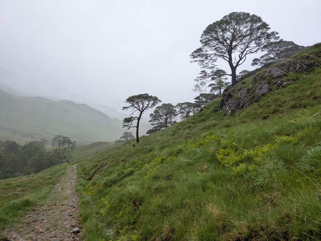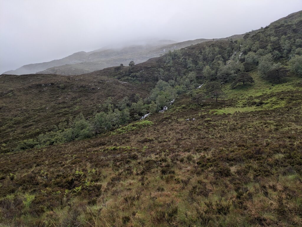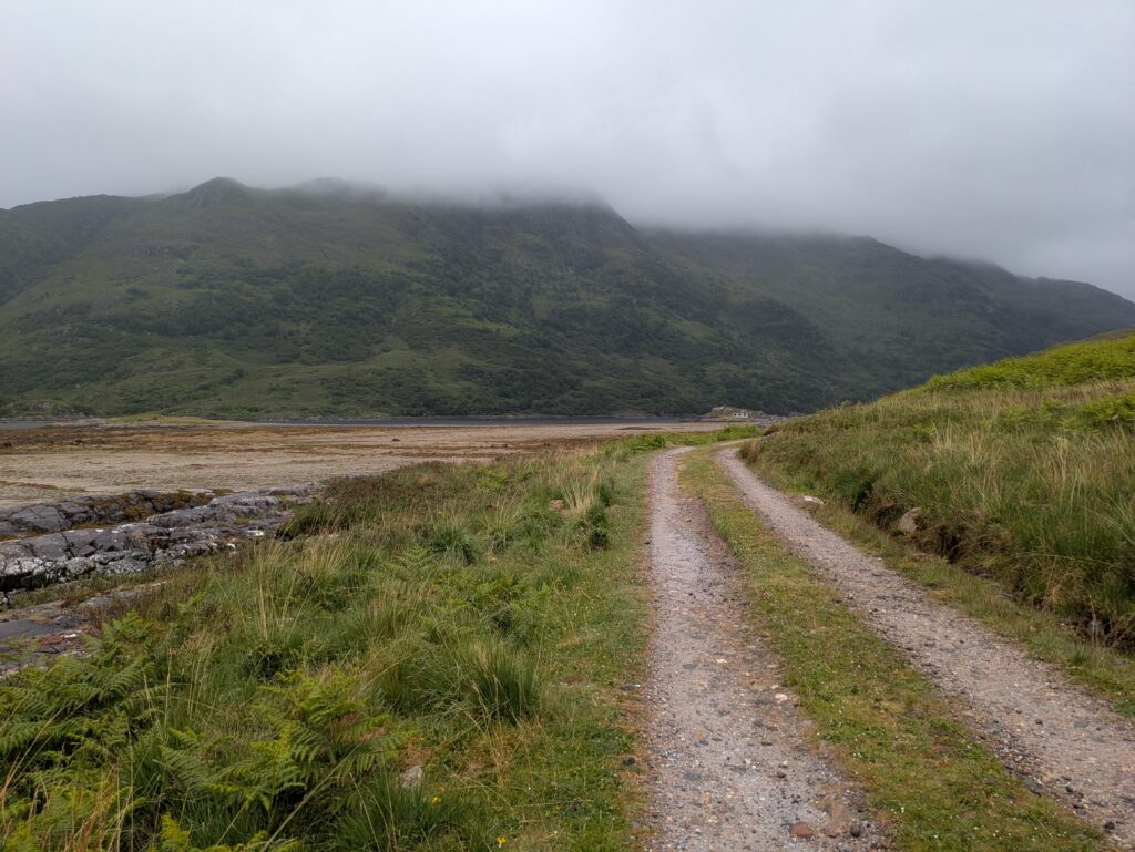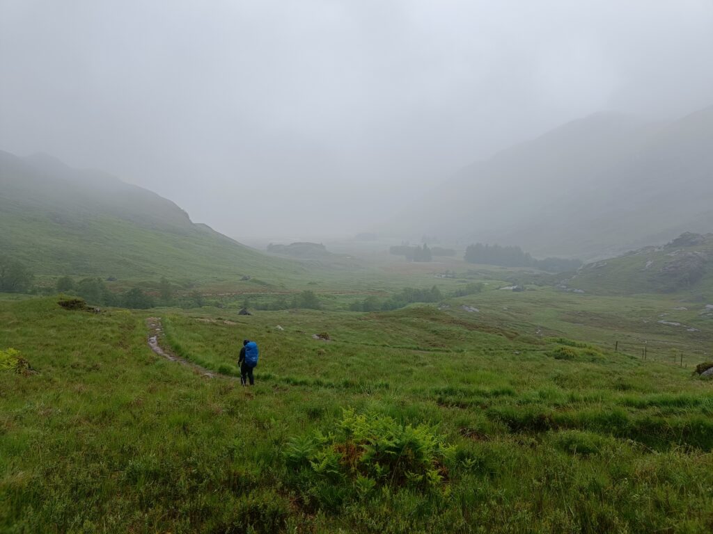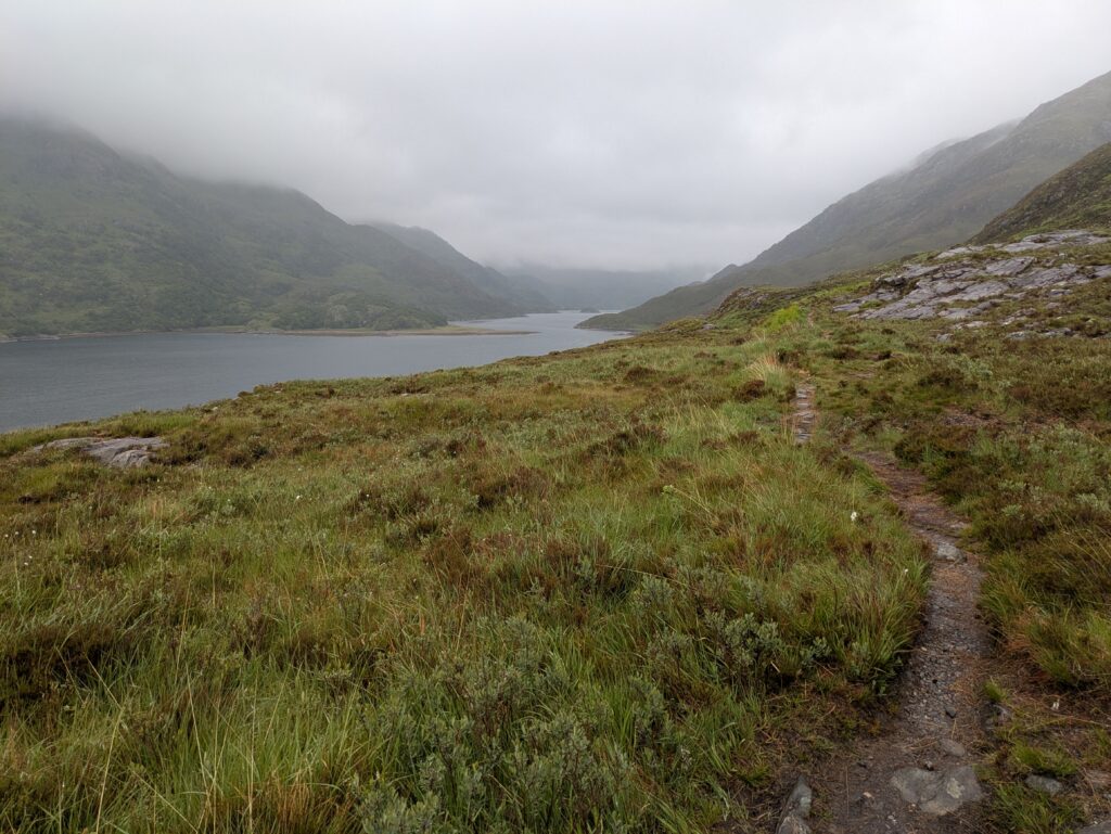 On entame la descente vers Barisdale, à travers Gleann Unndalain. Il y a régulièrement des averses, mais finalement on a surtout droit à de la bruine. L’humidité vient avant tout du sol, avec plein de torrents à traverser et des sentiers parfois eux-mêmes transformés en ruisseaux.