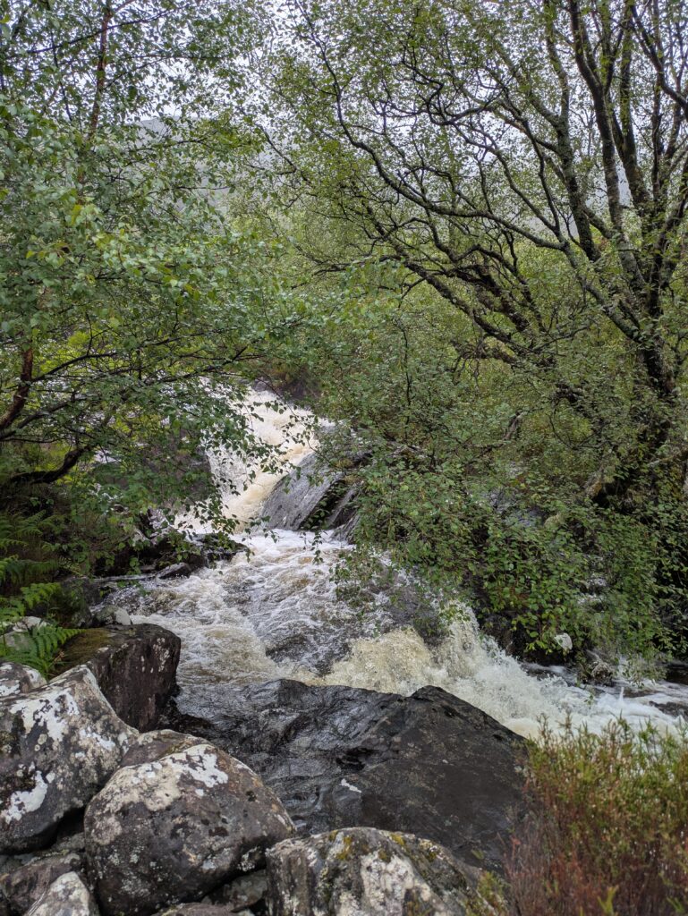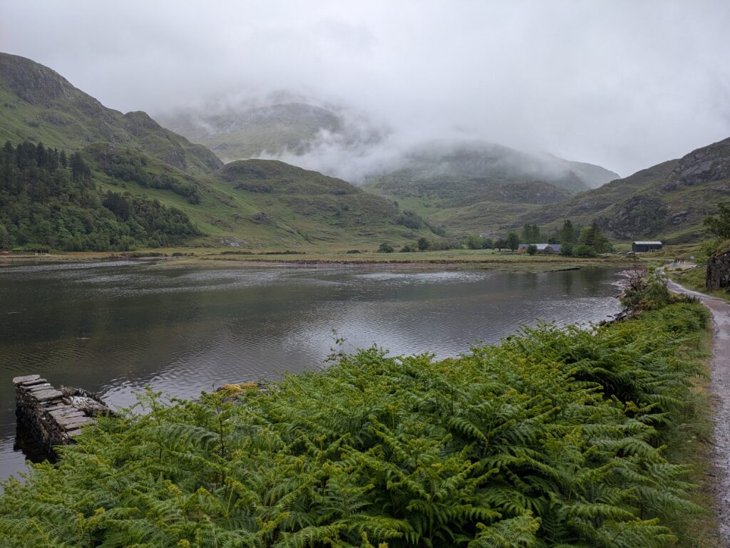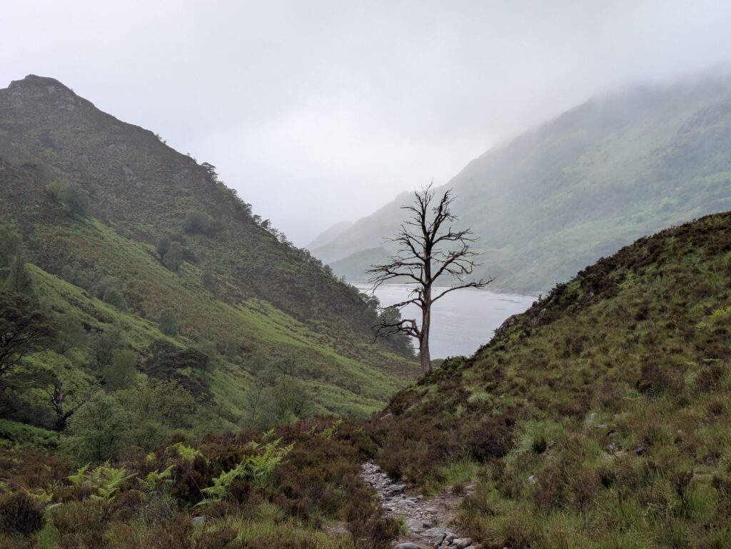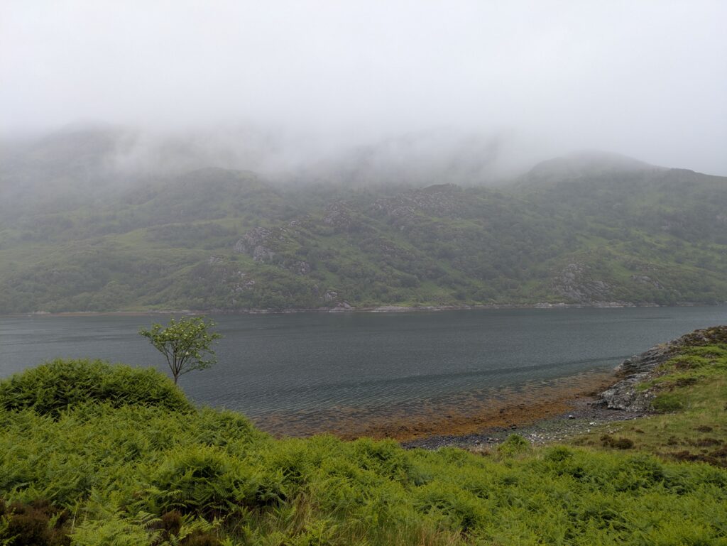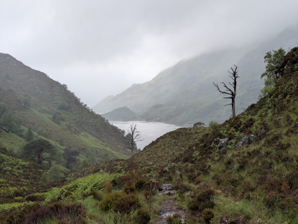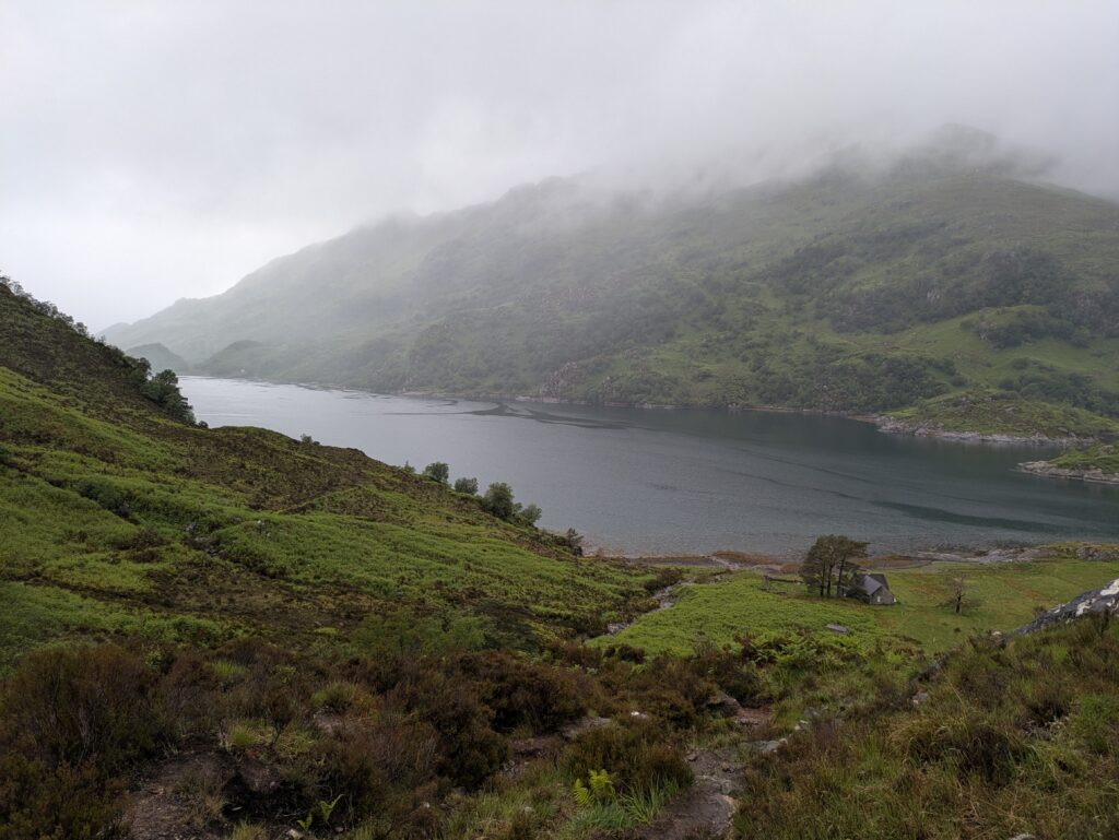 C’est un coup dur pour le moral. En plus, la pluie s’est calmée et les midges sont voraces. On ne sait pas trop quoi faire, rester ou continuer. L’étape d’après est décrite comme “rough”, avec des traversées de rivières difficiles (et dangereuses) lorsqu’il pleut. Il n’y a pas de réseau, mais on regarde les prévisions météo avec le Garmin InReach: le lendemain matin s’annonce encore plus pluvieux. On ne pourrait pas aller bien loin le soir, donc on décide de planter la tente à Kinloch Hourn, à côté de la rivière qui gronde, en se disant qu’on va s’octroyer un demi-jour de repos le lendemain, pour éviter le gros de la pluie — et, accessoirement, pouvoir manger au tea-room avant de repartir.
