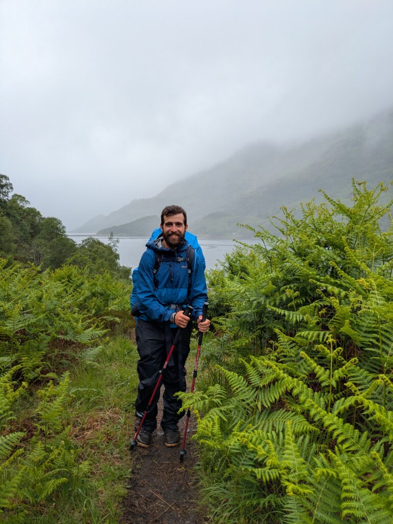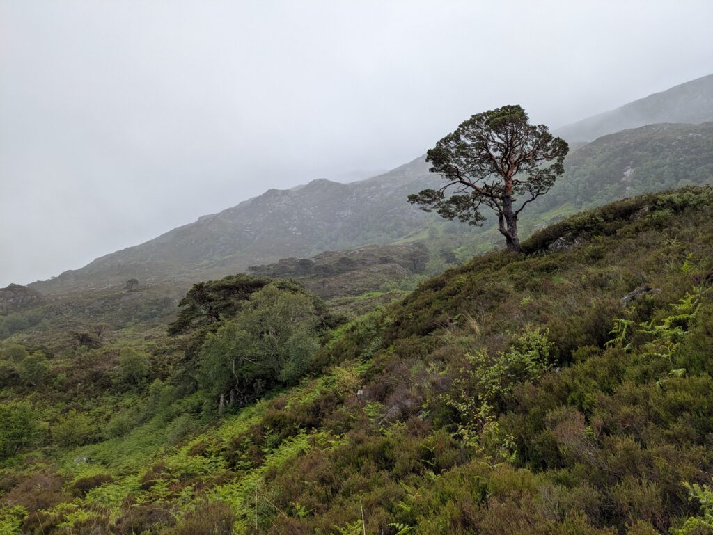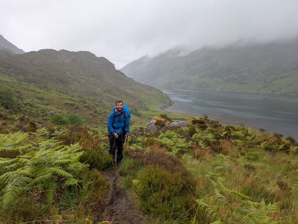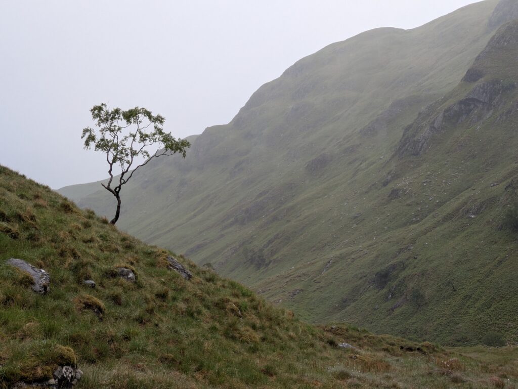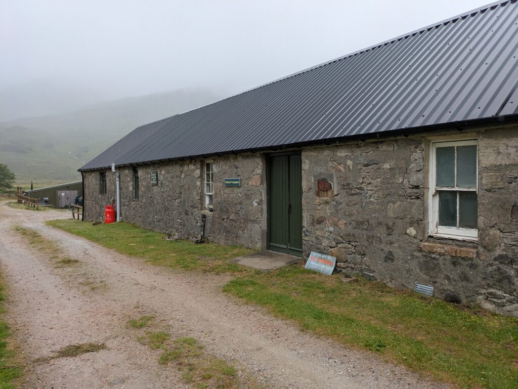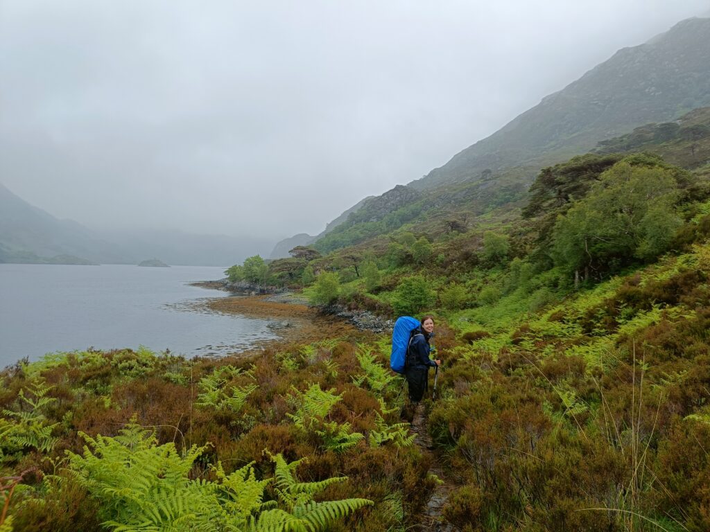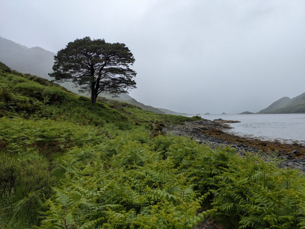 C’est un coup dur pour le moral. En plus, la pluie s’est calmée et les midges sont voraces. On ne sait pas trop quoi faire, rester ou continuer. L’étape d’après est décrite comme “rough”, avec des traversées de rivières difficiles (et dangereuses) lorsqu’il pleut. Il n’y a pas de réseau, mais on regarde les prévisions météo avec le Garmin InReach: le lendemain matin s’annonce encore plus pluvieux. On ne pourrait pas aller bien loin le soir, donc on décide de planter la tente à Kinloch Hourn, à côté de la rivière qui gronde, en se disant qu’on va s’octroyer un demi-jour de repos le lendemain, pour éviter le gros de la pluie — et, accessoirement, pouvoir manger au tea-room avant de repartir.
