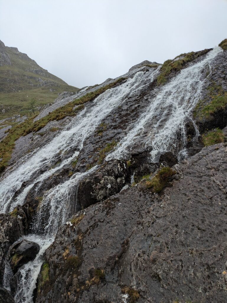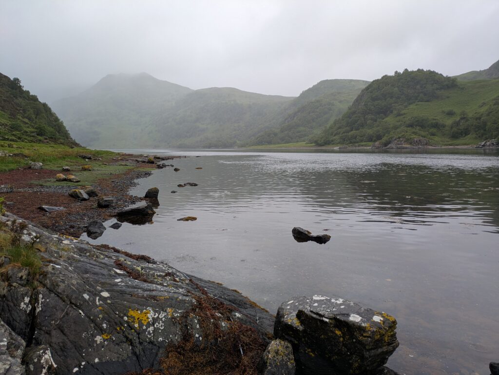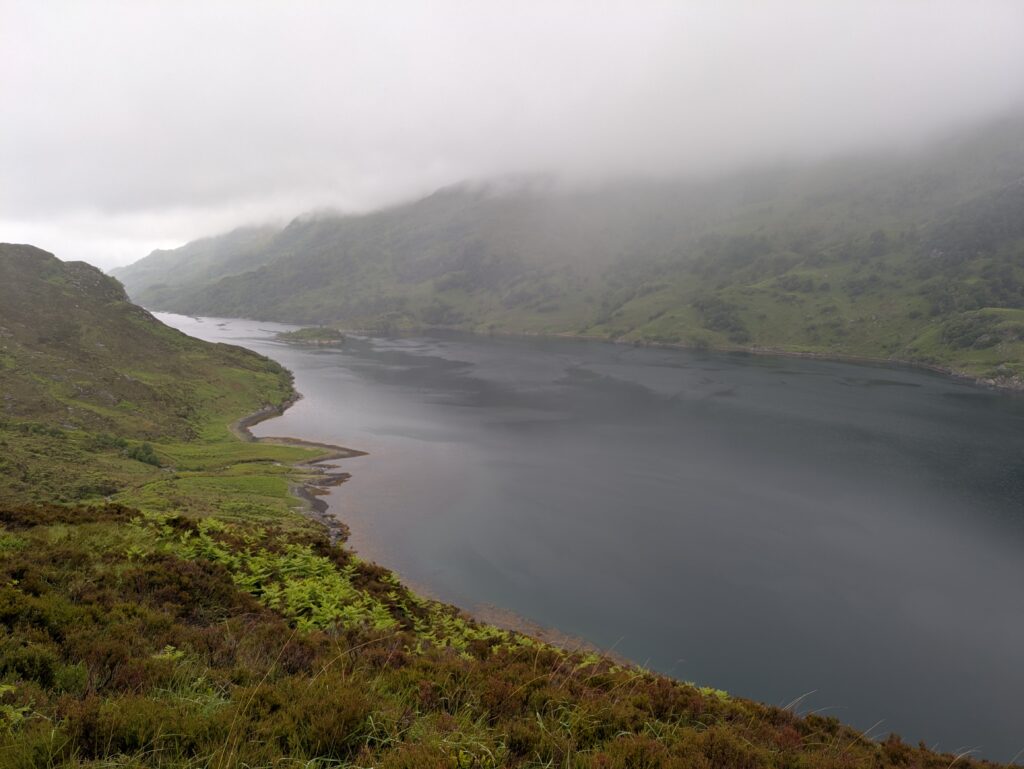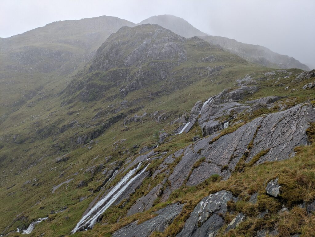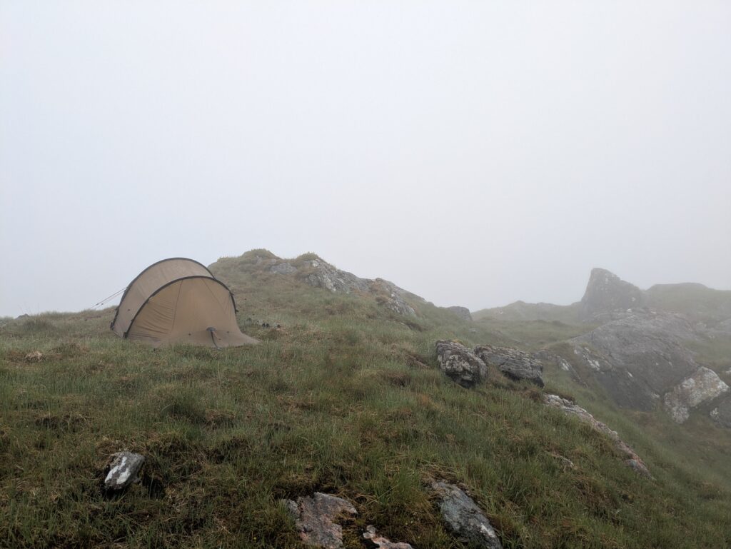 On a plutôt bien dormi dans les collines vers Mam Unndalain, malgré quelques fortes rafales de vent et de la pluie par intermittence. Le matin, on s’est levés au milieu des nuages, dans un monde métamorphosé: il y a des petites mares et des ruisseaux qui dégoulinent de tous les côtés. Nous sommes dans un paysage quasi aquatique!