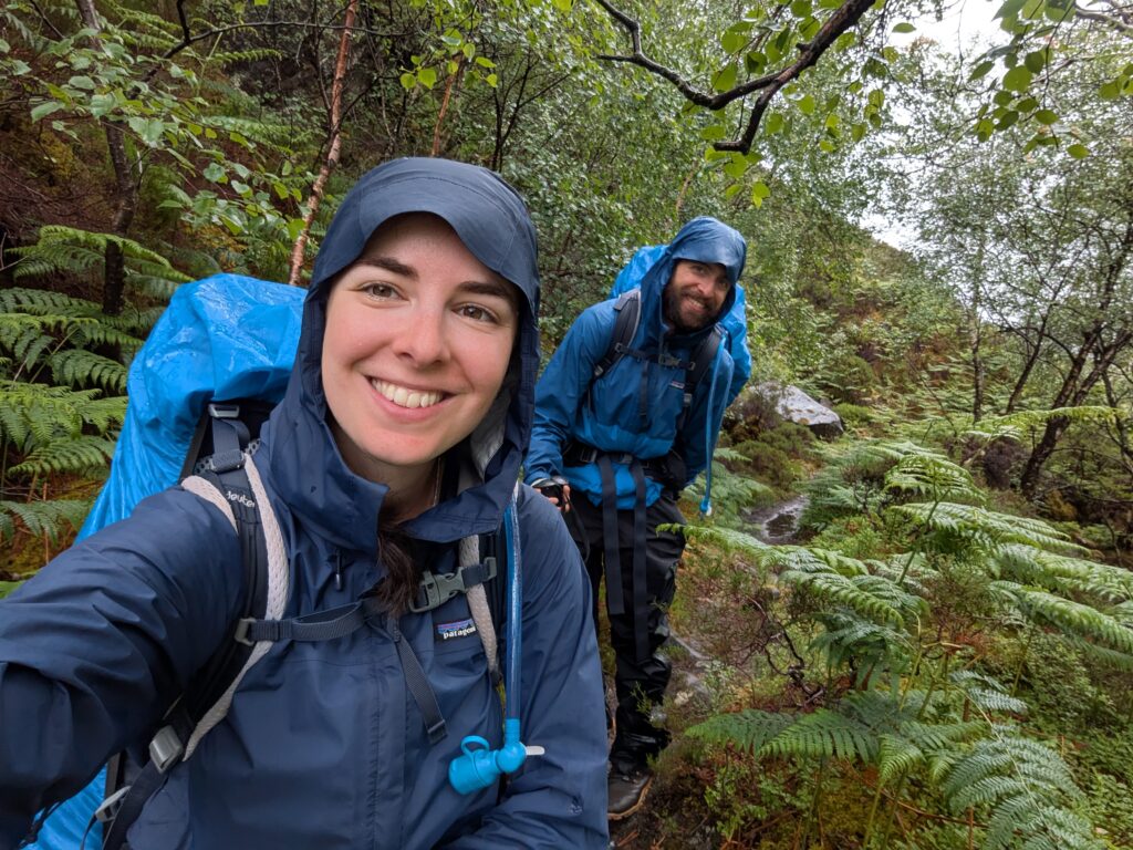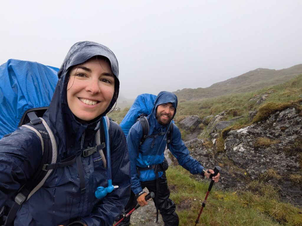 Pour faire sécher les affaires, on les étendait dans notre auvent sur une petite corde à linge de voyage (et on a aussi une petite cordelette dans la tente intérieure sur laquelle on étend nos chaussettes), mais on ne va pas se mentir, c’était rarement sec le matin (même qu’on portait surtout des habits en laine mérinos, donc ça sèche plutôt vite comme matière mais ça ne fait pas de miracle non plus quand l’air est humide tout le temps ^^). Vu que de toute façon on avait des rivières et tourbières à traverser quasi tous les jours (sur le CWT), on avait de toute façon vite de nouveau les pieds mouillés dans la journée… Donc on s’est fait une raison et on remettait juste nos affaires mouillées le matin (c’était pas le moment le plus agréable de la journée mais on s’y fait ^^). Et vu que les pieds étaient du coup mouillés un peu toute la journée, on prenait bien soin d’eux le soir, avec un spray rafraîchissant et antibactérien au tea tree et de la crème style “anti trench foot”, et en les laissant bien aérer — et ça a super bien marché!