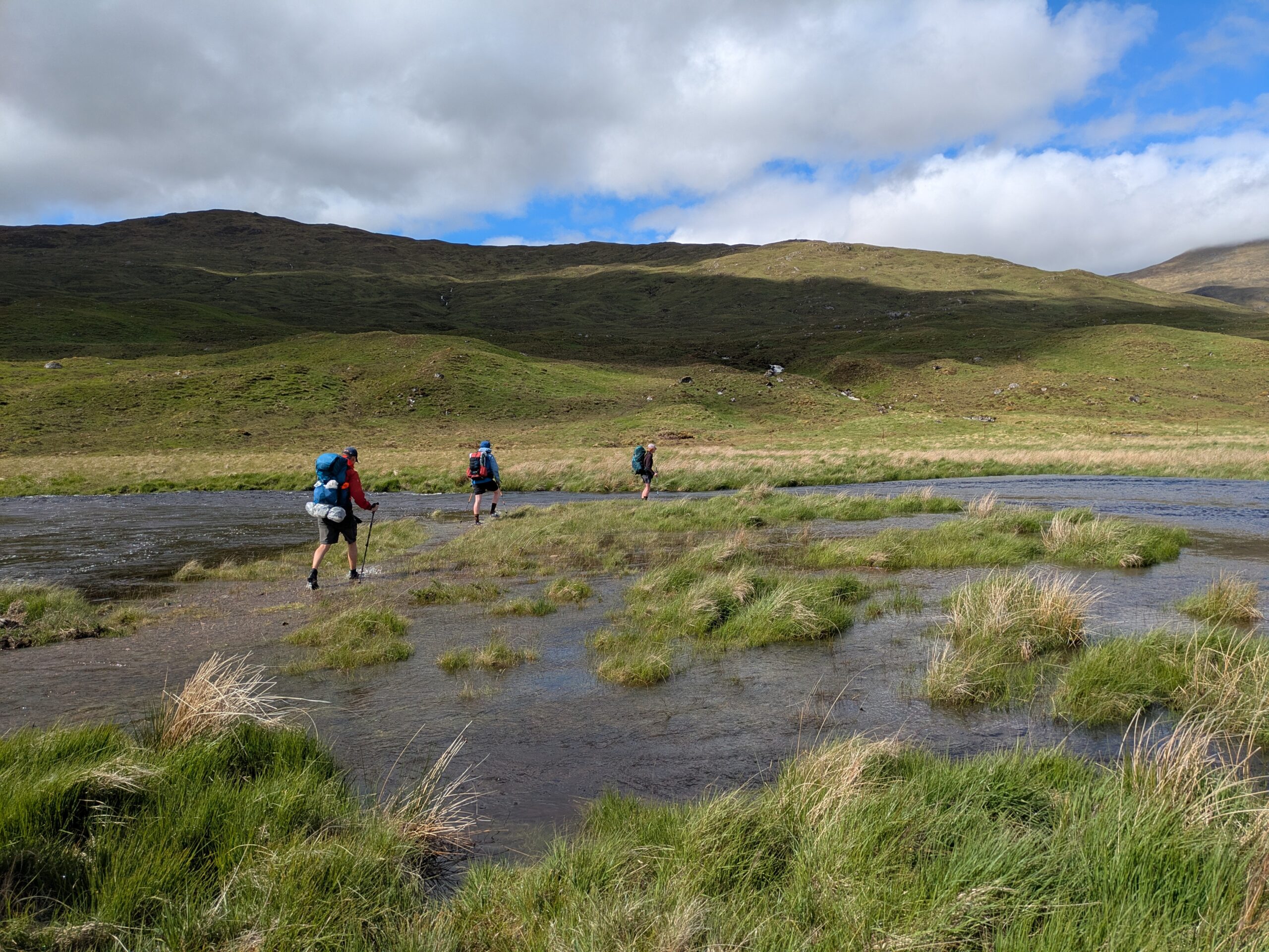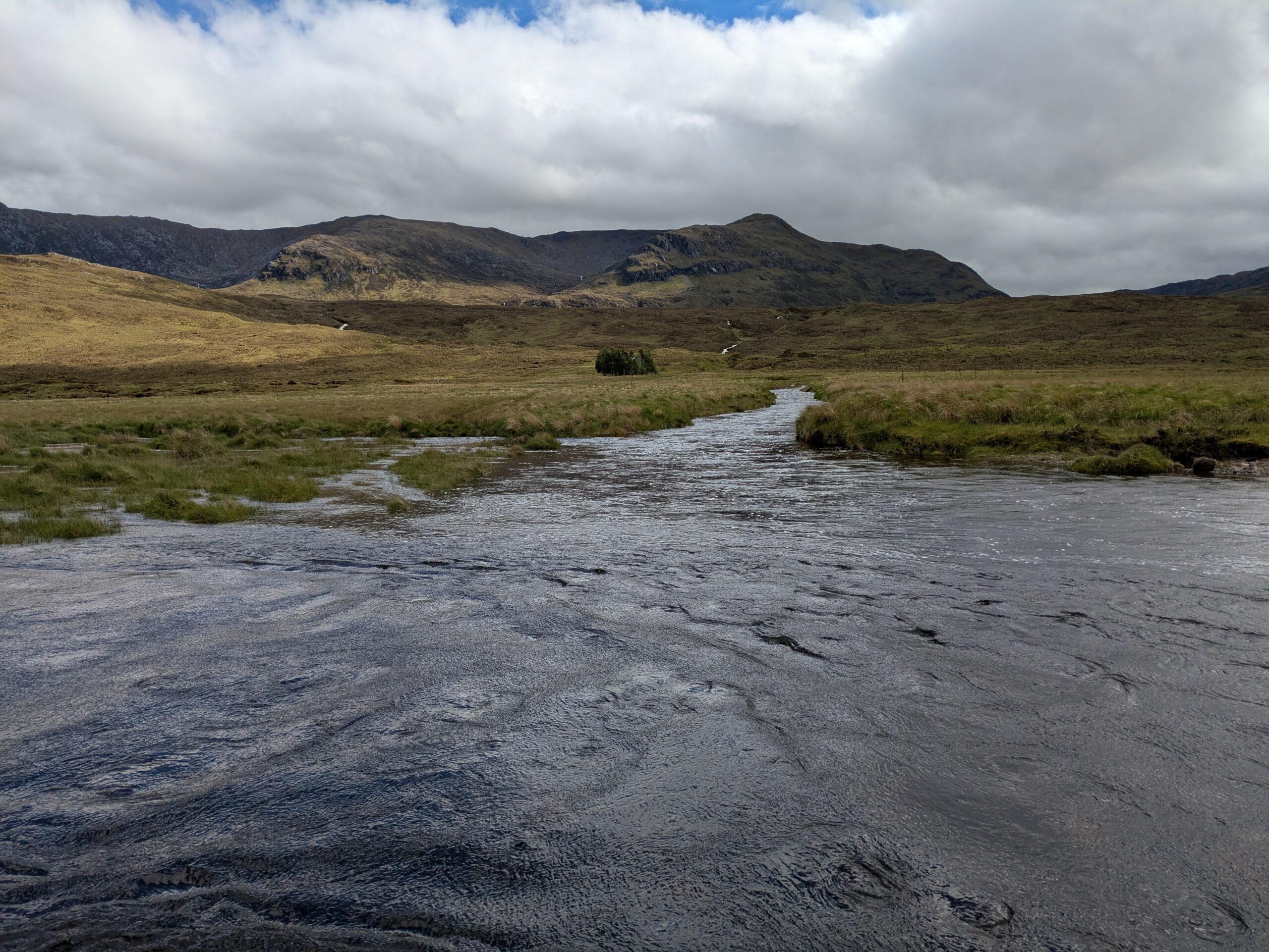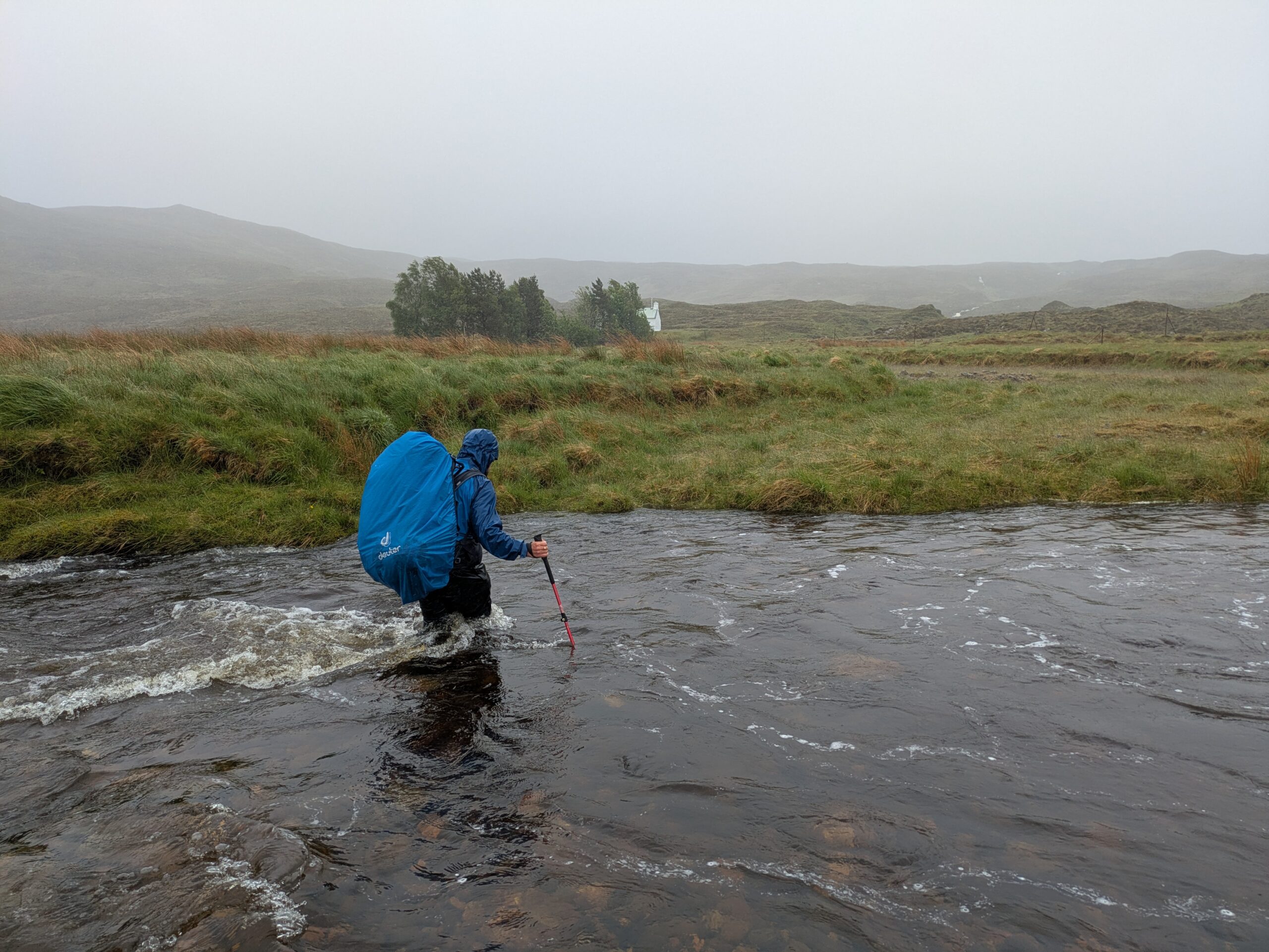 Finalement, nous voici “back on track” (littéralement, puisqu’on retrouve un chemin après plusieurs kilomètres sans sentier). On approche de Maol Bhuidhe, un bothy dans lequel on aimerait bien se réfugier le temps d’une pause. Mais pour l’atteindre, il reste une sacrée rivière à traverser, avec du courant et une hauteur d’eau qui nous arrive au-dessus des genoux. On descend un peu en aval, à la recherche d’un endroit plus favorable où traverser. On y arrive, mais on n’est pas hyper confiants et on est contents d’arriver au bothy, very 14h.
