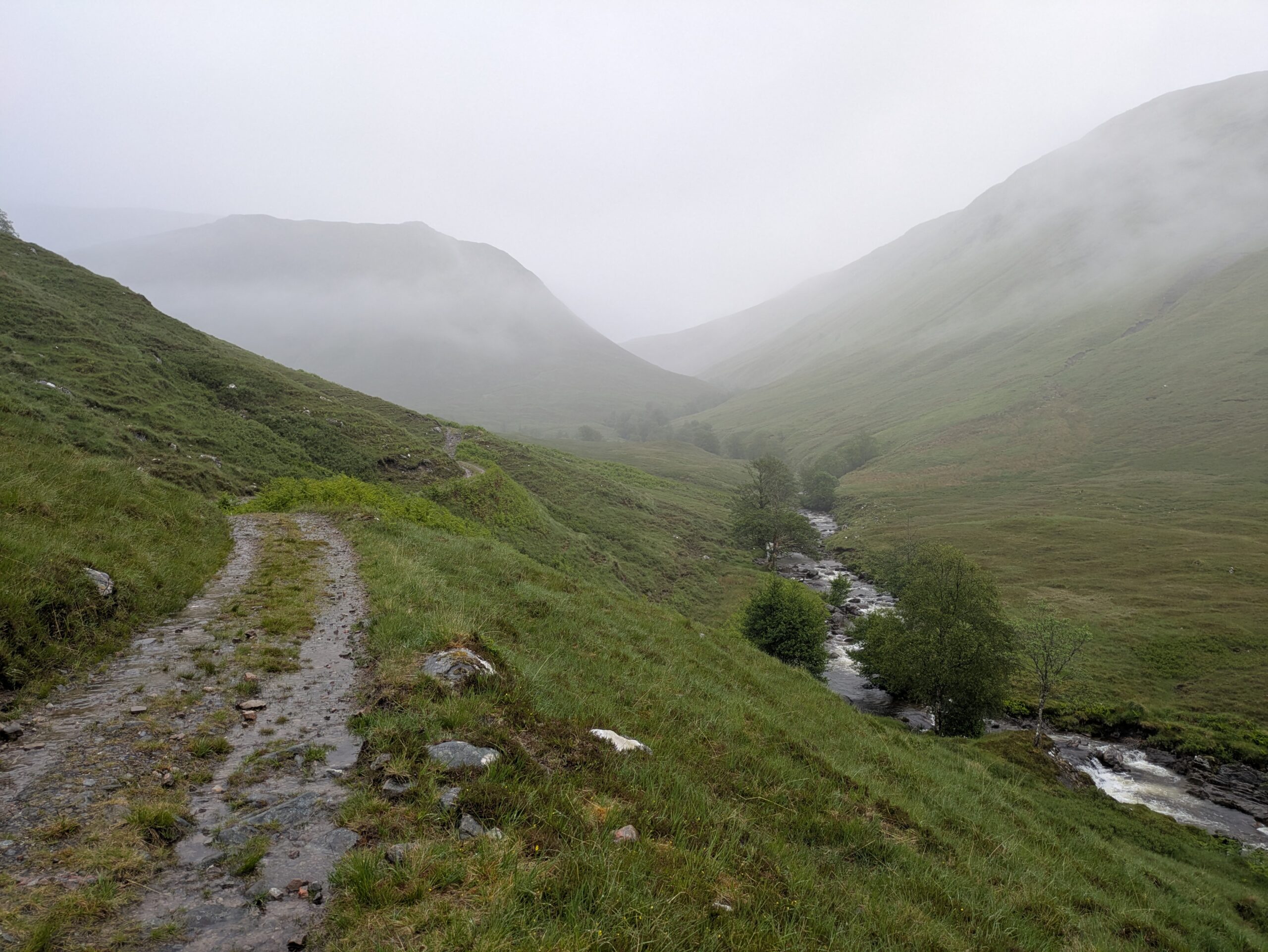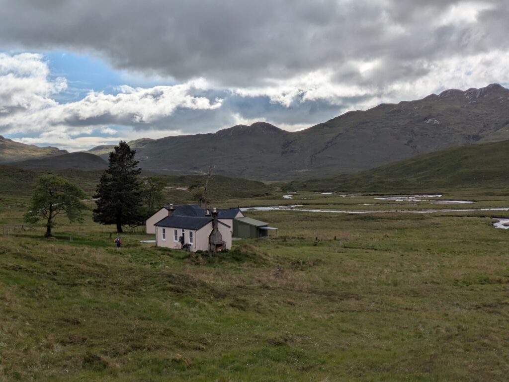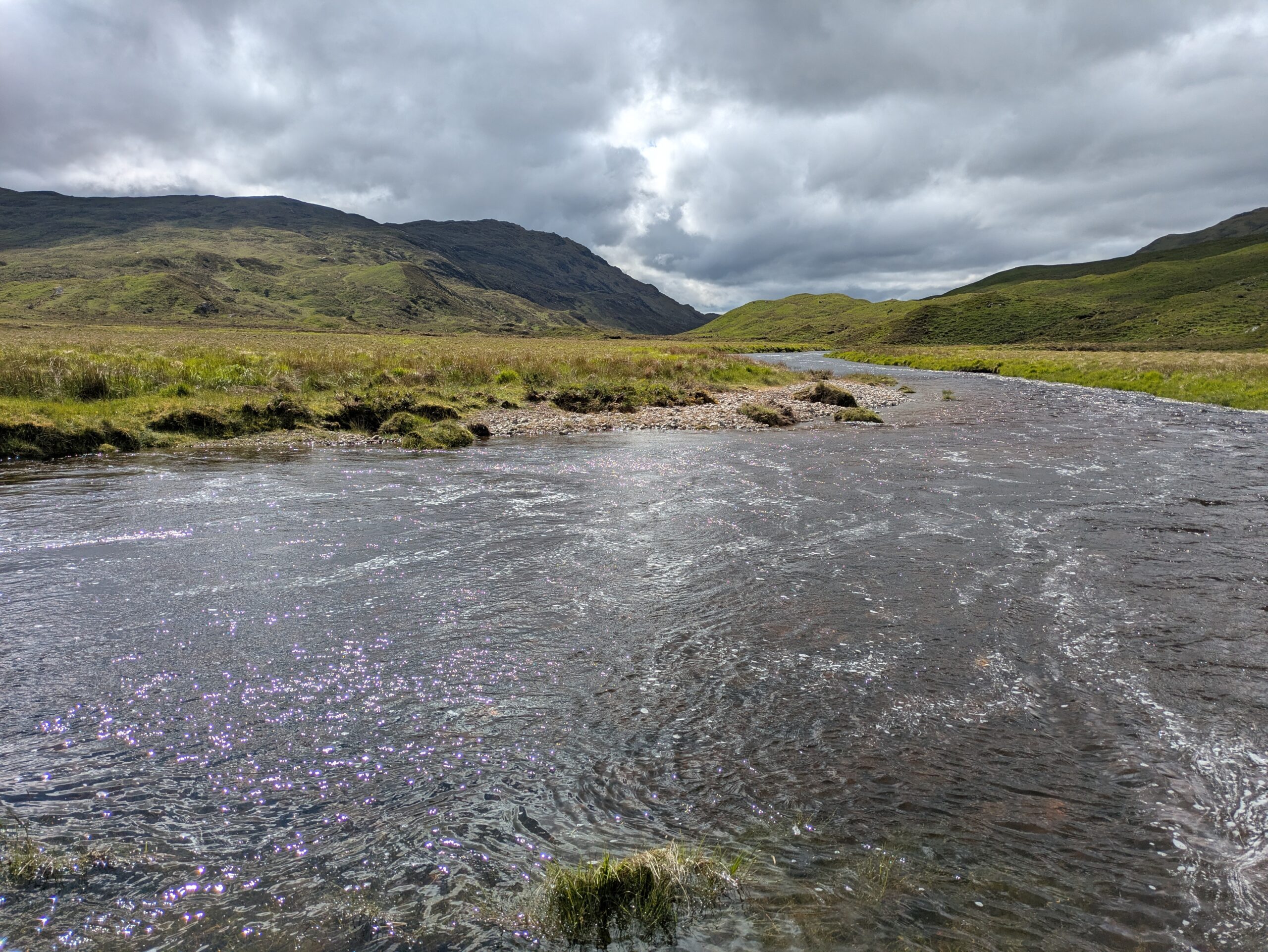 Finalement, nous voici “back on track” (littéralement, puisqu’on retrouve un chemin après plusieurs kilomètres sans sentier). On approche de Maol Bhuidhe, un bothy dans lequel on aimerait bien se réfugier le temps d’une pause. Mais pour l’atteindre, il reste une sacrée rivière à traverser, avec du courant et une hauteur d’eau qui nous arrive au-dessus des genoux. On descend un peu en aval, à la recherche d’un endroit plus favorable où traverser. On y arrive, mais on n’est pas hyper confiants et on est contents d’arriver au bothy, very 14h.