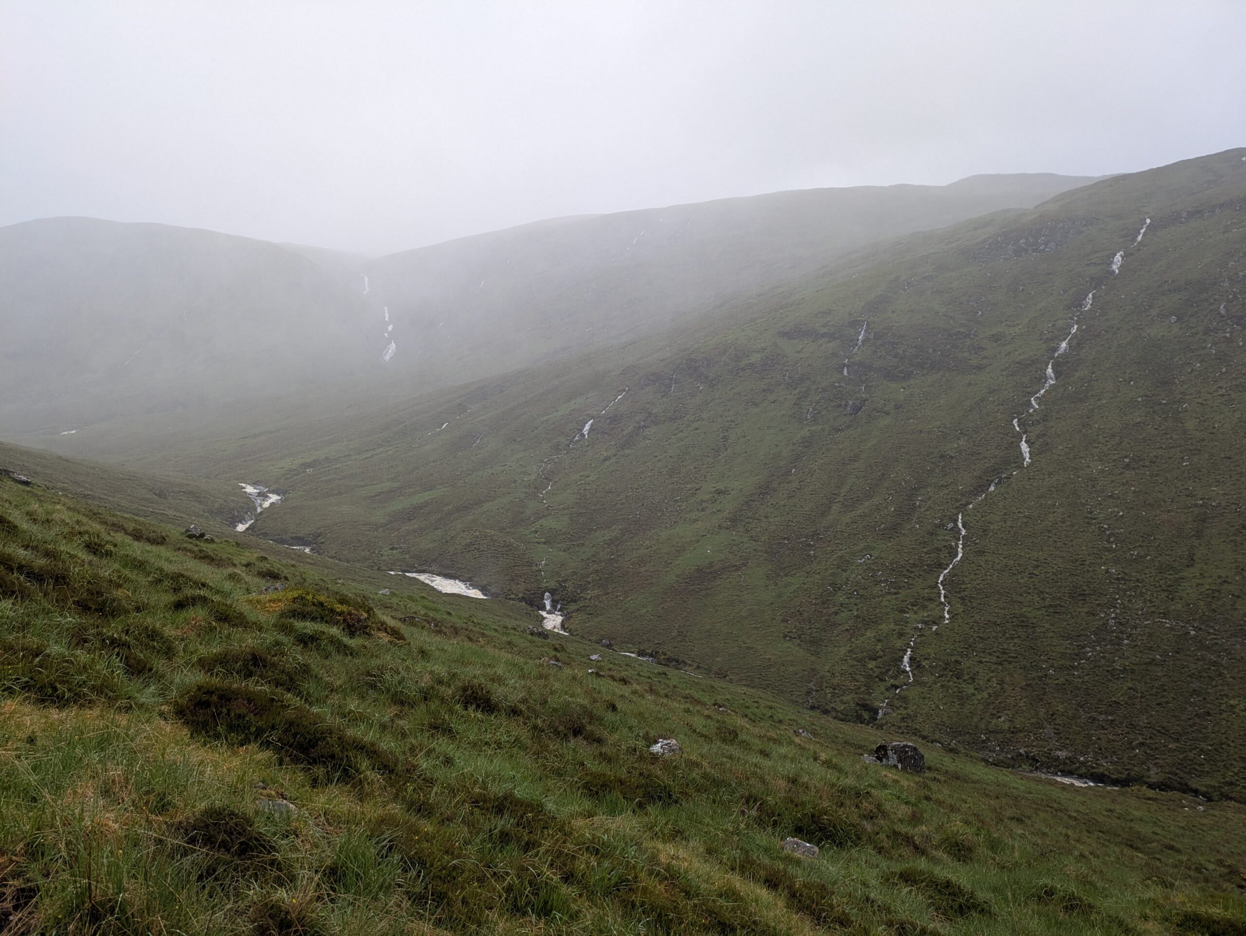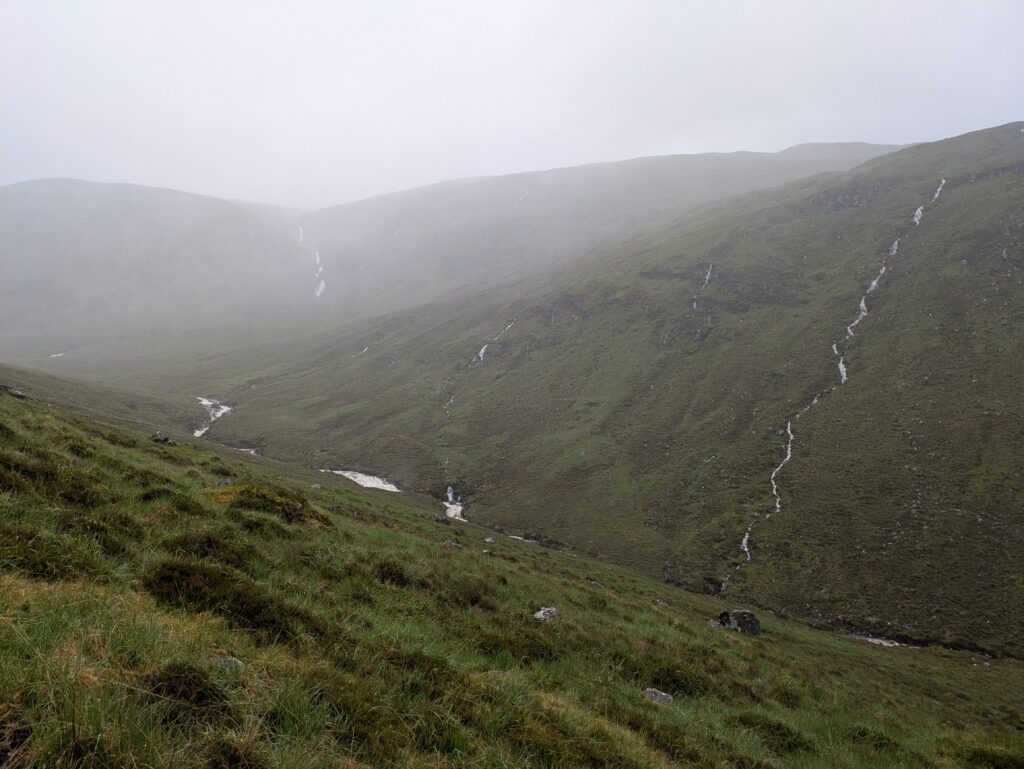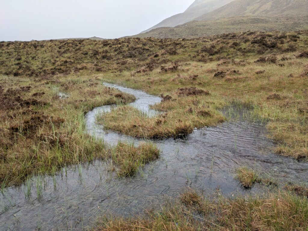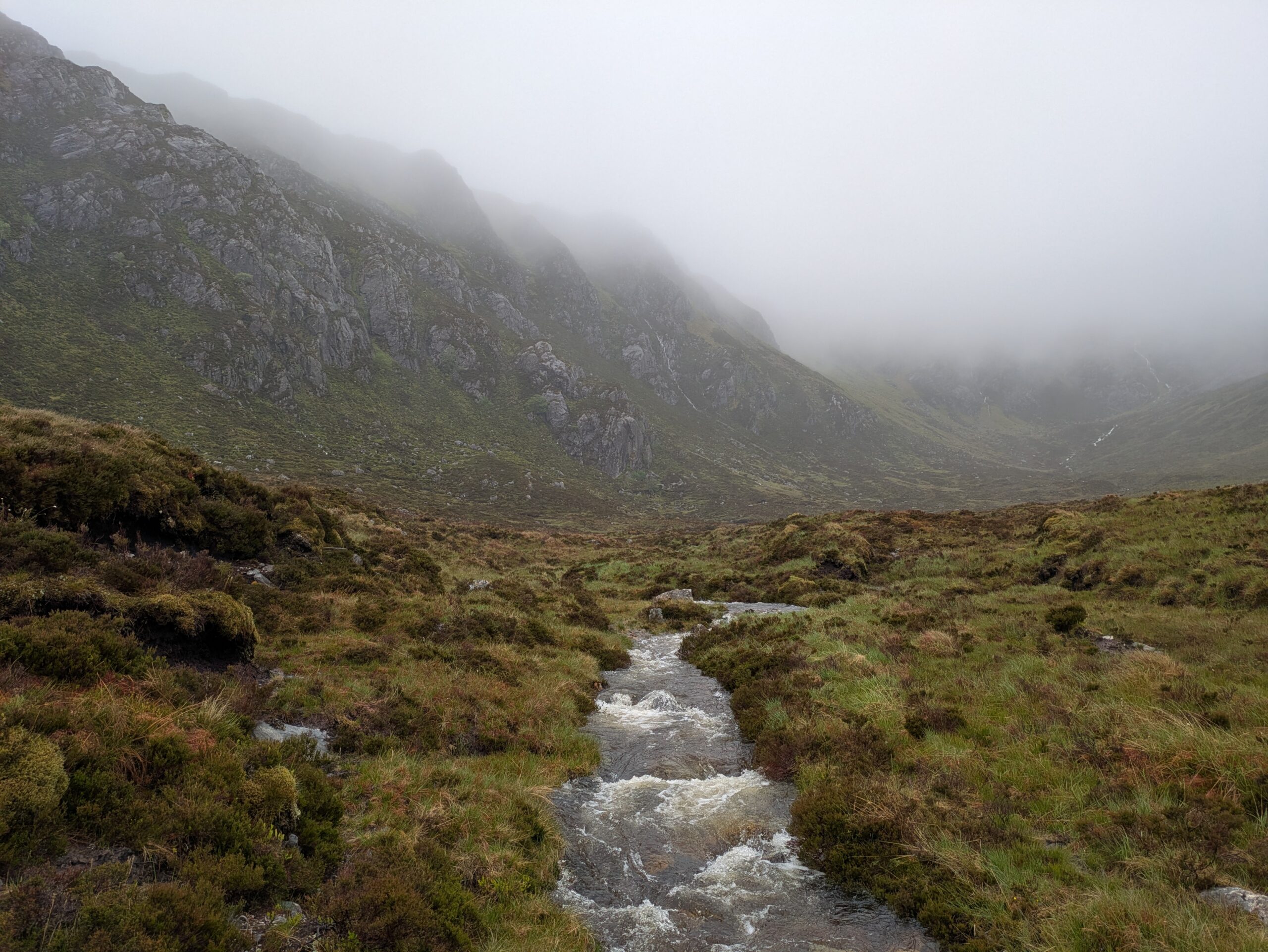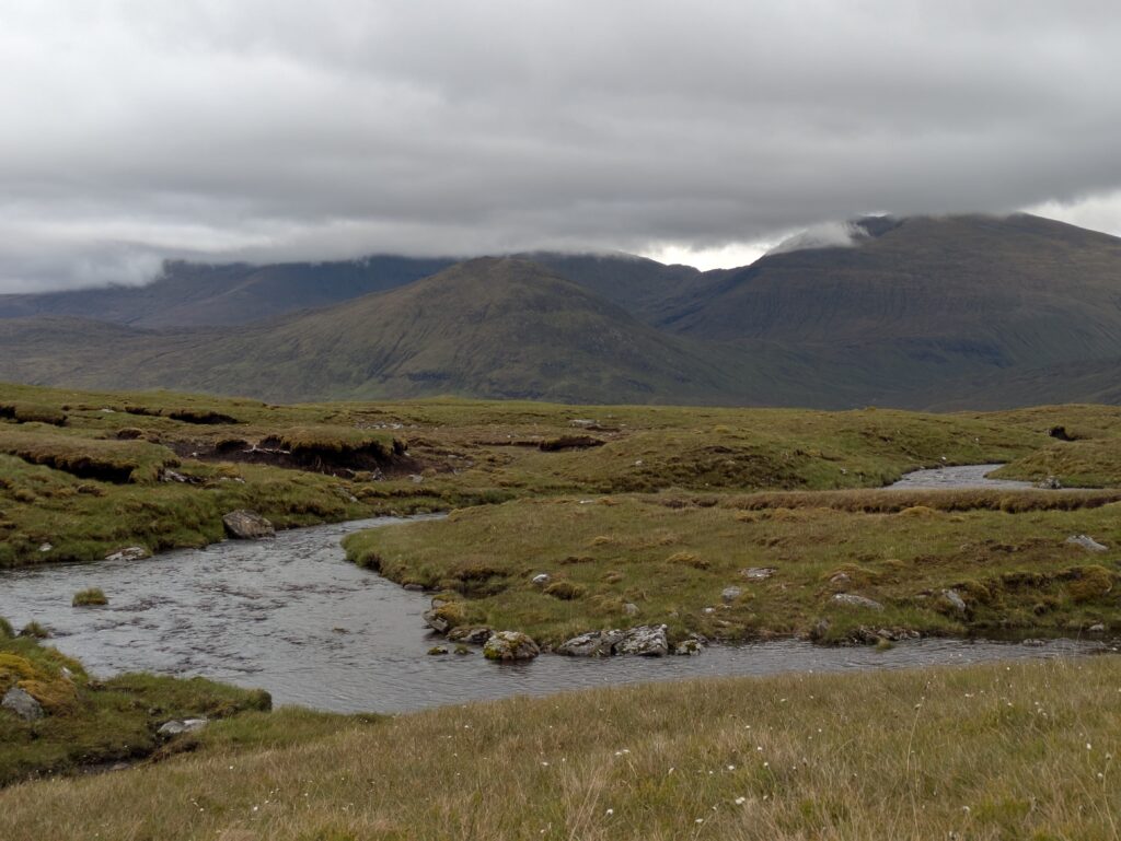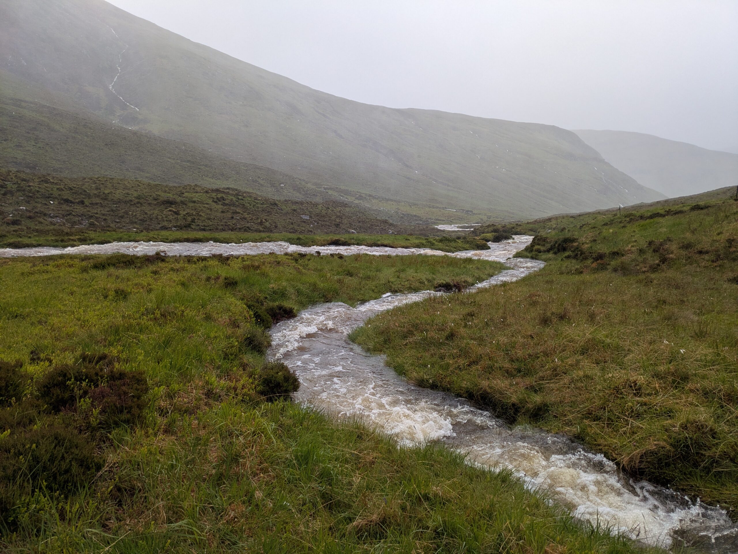 Fini les pieds quasi secs, c’est le retour des chaussures-piscines, entre le sol boggy et les rivières à traverser. Et il y en a, des rivières à traverser, et elles font peur, avec beaucoup de courant. La première grosse rivière ne nous inspire pas confiance, le débit nous paraît trop fort, donc on fait un grand détour pour l’éviter (surtout que l’itinéraire nous aurait fait la retraverser plus haut, donc on ne voyait pas trop l’intérêt). C’est vraiment l’aventure: on saute par-dessus les burns et les coins tourbeux inondés, on monte, on descend, tout ça dans la pluie et le vent, qui souffle fort, avec des rafales qui nous “stop in our tracks” régulièrement.