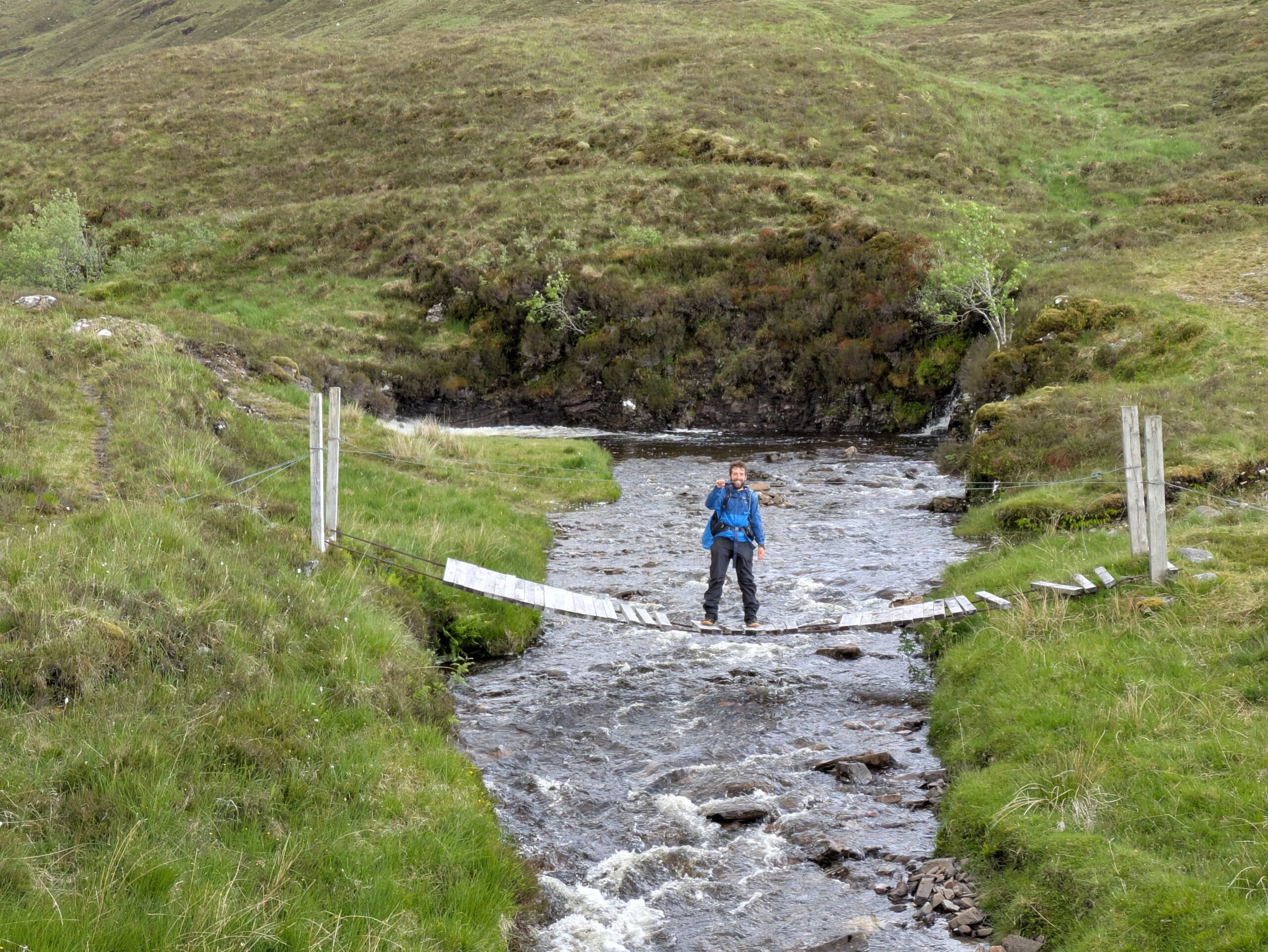 Puis on est descendus jusqu’à Bendronaig Lodge bothy, où se trouvait déjà un Ecossais venu gravir quelques Munros dans le coin. Juste avant d’atteindre le bothy, il y a une ultime rivière à traverser, avec deux ponts au choix: un pont stable qui ne fait pas peur, et un pont à moitié pété auquel il ne reste plus qu’une planche sur deux. José a suivi Al, Rob et Flora sur la passerelle de la mort, et moi j’ai préféré prendre l’option safe (on va dire que c’était pour pouvoir prendre José en photo, haha! ^^).