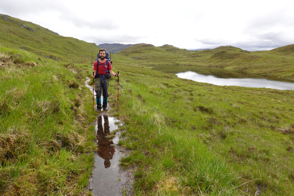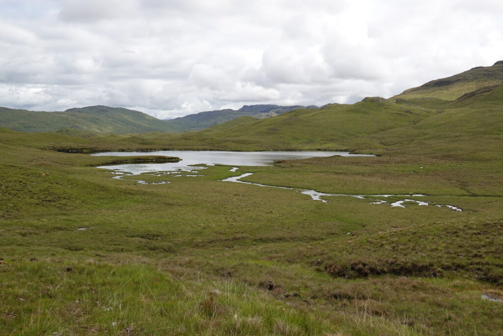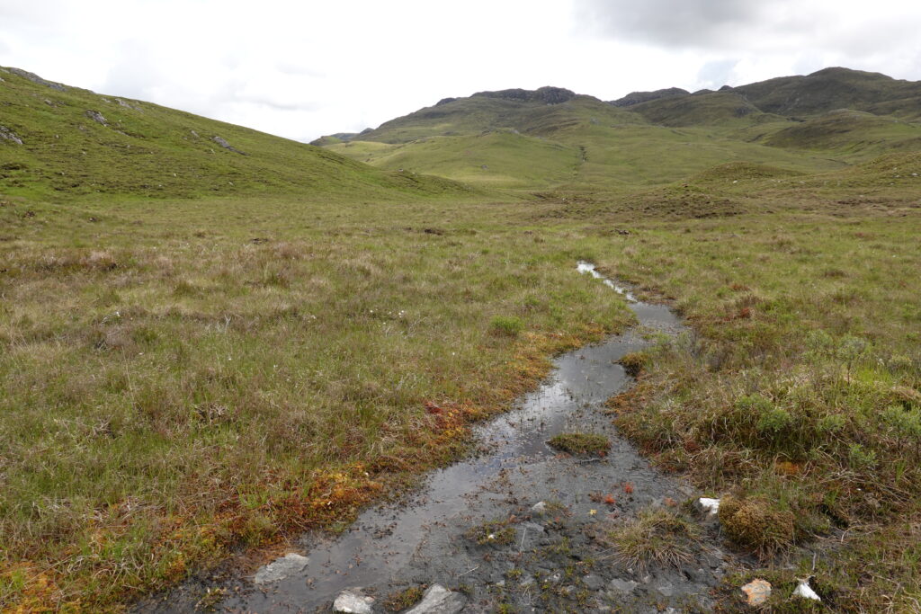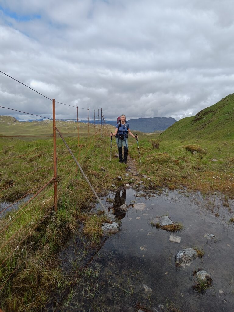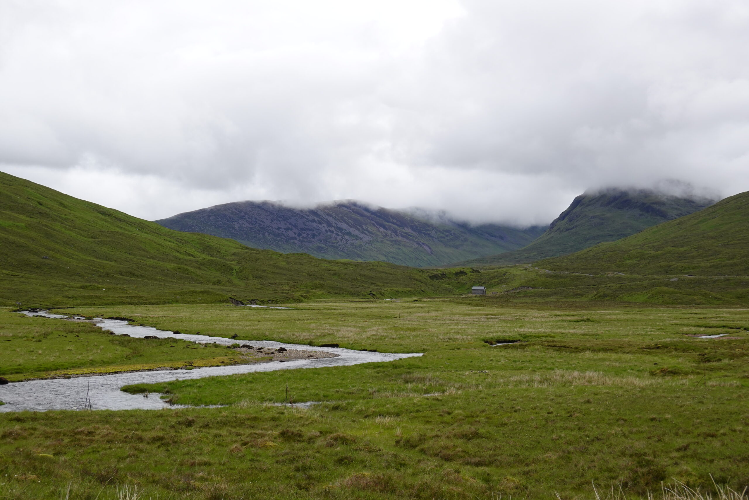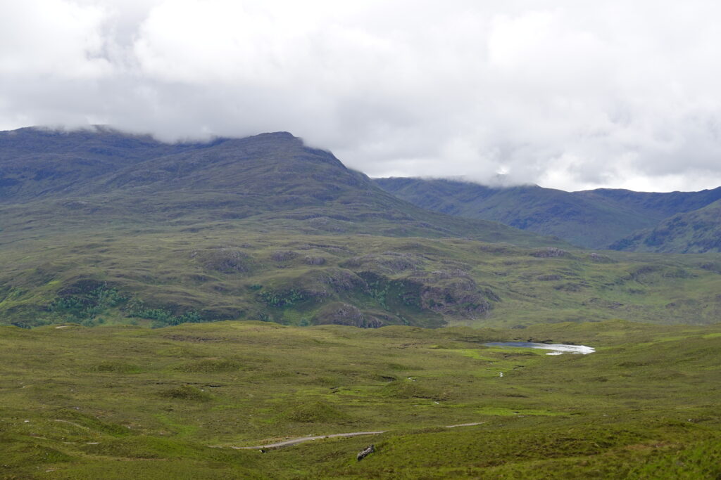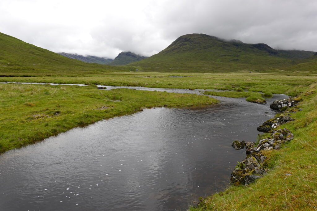On a plutôt bien dormi dans le bothy de Bendronaig mais on se sentait quand même tous assez fatigués, donc on a fait une petite journée et c’était très bien comme ça. On se réveille à 7h, on déjeune, on se prépare et on quitte Bendronaig à 9h, pour une journée qui s’annonce sèche, yay! Enfin, en ce qui concerne le ciel, du moins. On a bien sûr quand même eu les pieds mouillés dans la tourbe et les torrents. 😉