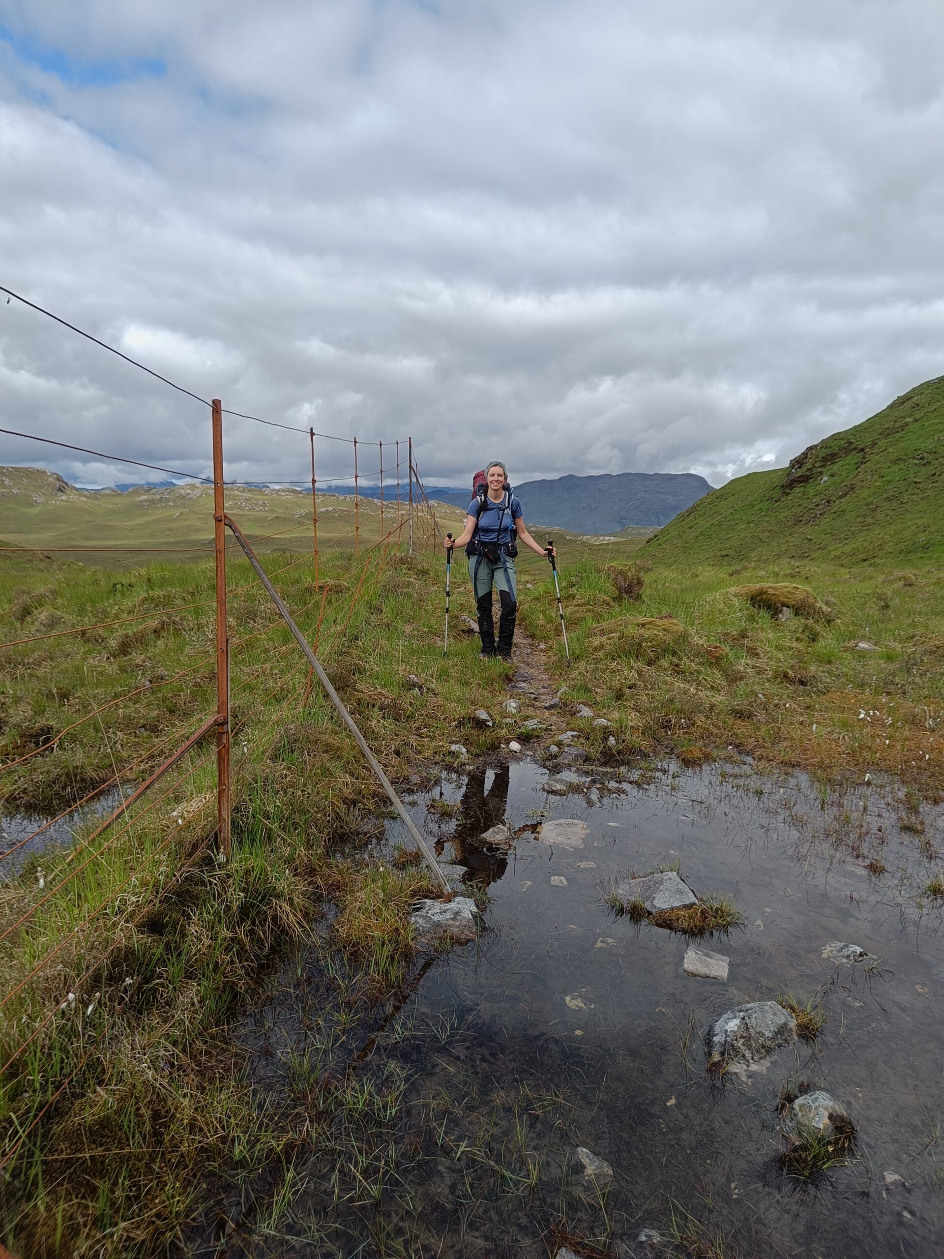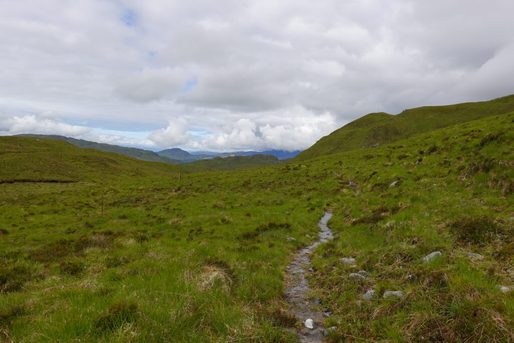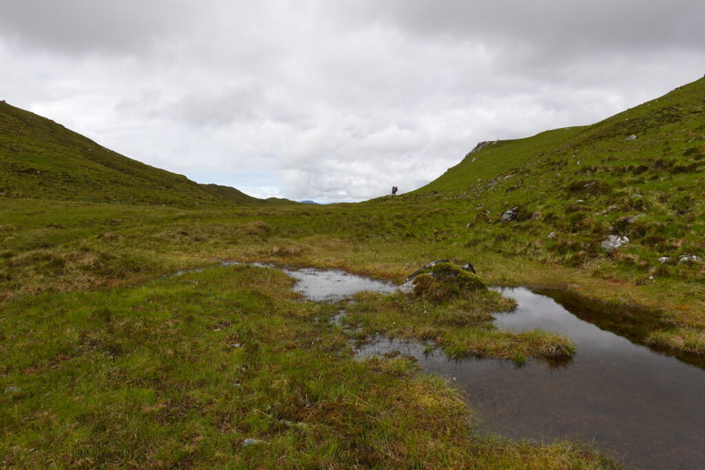 On observe des chevaliers gambettes et d’autres limicoles le long d’Uisge Dubh (Black Water) et on marche un petit moment sur un track avant d’attaquer une section pathless bien raide mais très chouette.