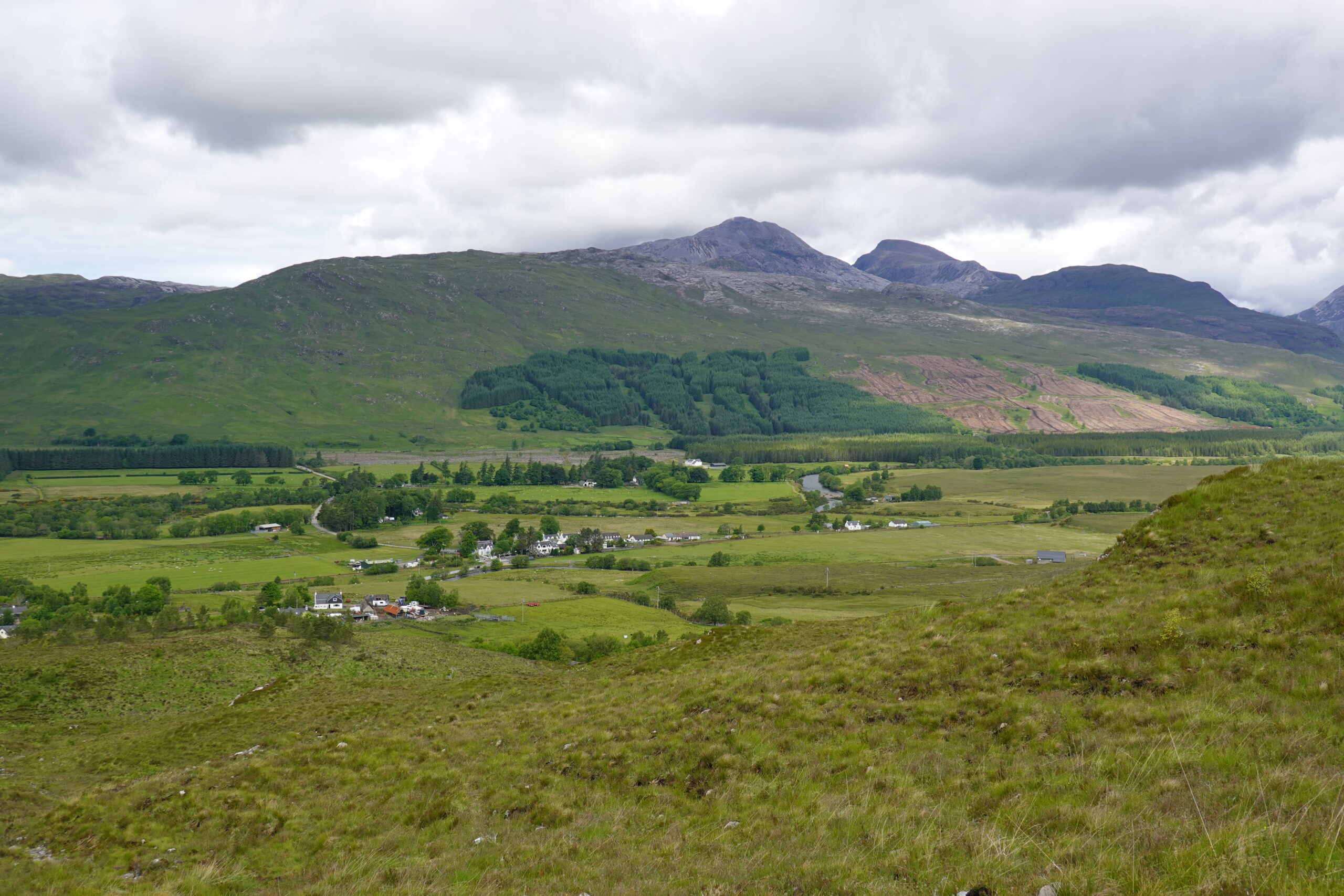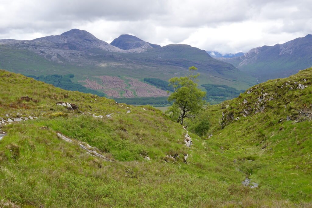 On aperçoit gentiment Strathcarron en contrebas, et des paysages dévastés là où des plantations ont récemment été coupées.
